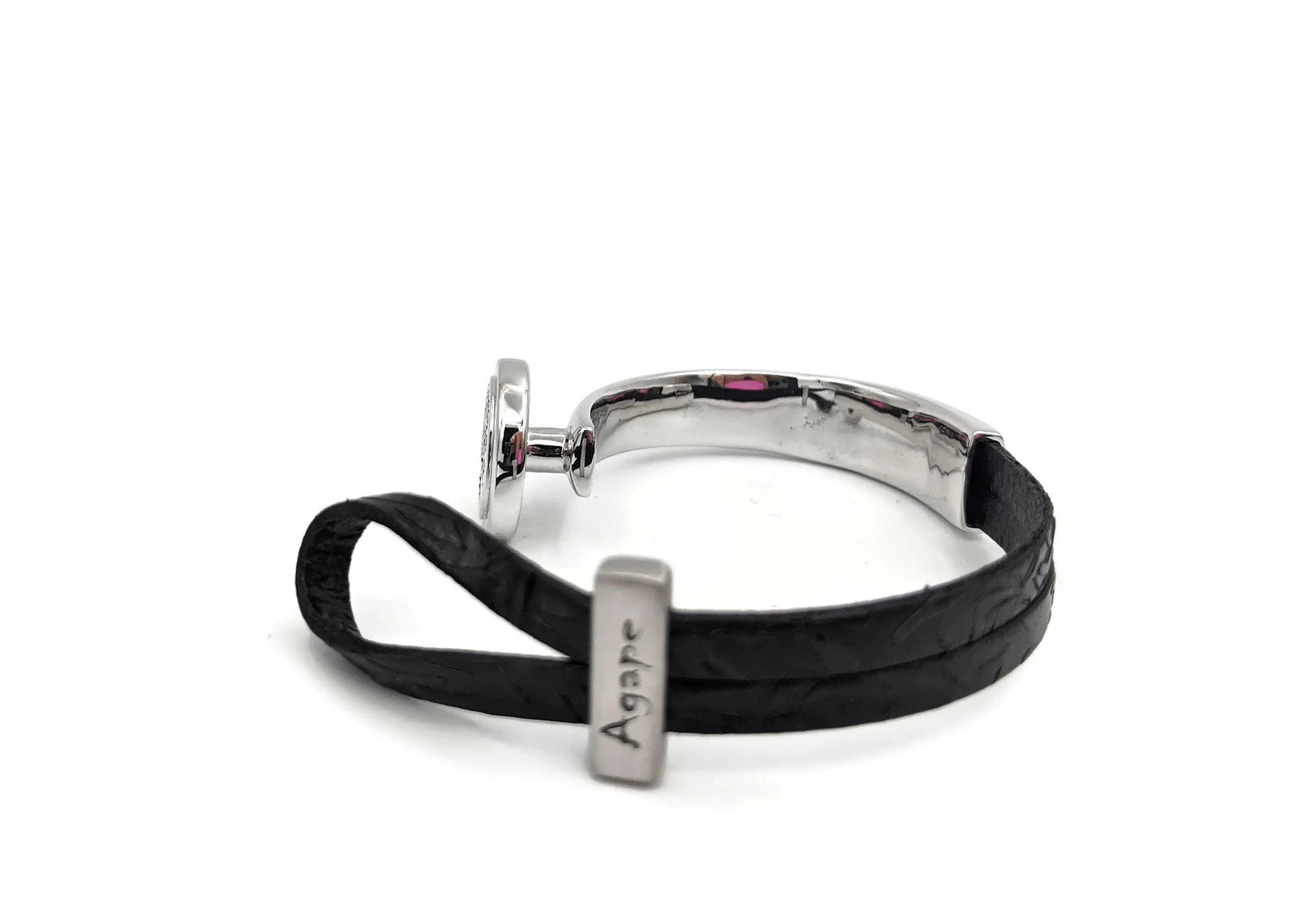 This is a handmade premium leather "Agape" bracelet with a Tree of Life half cuff. The leather is accented with a sterling silver Agape slider.