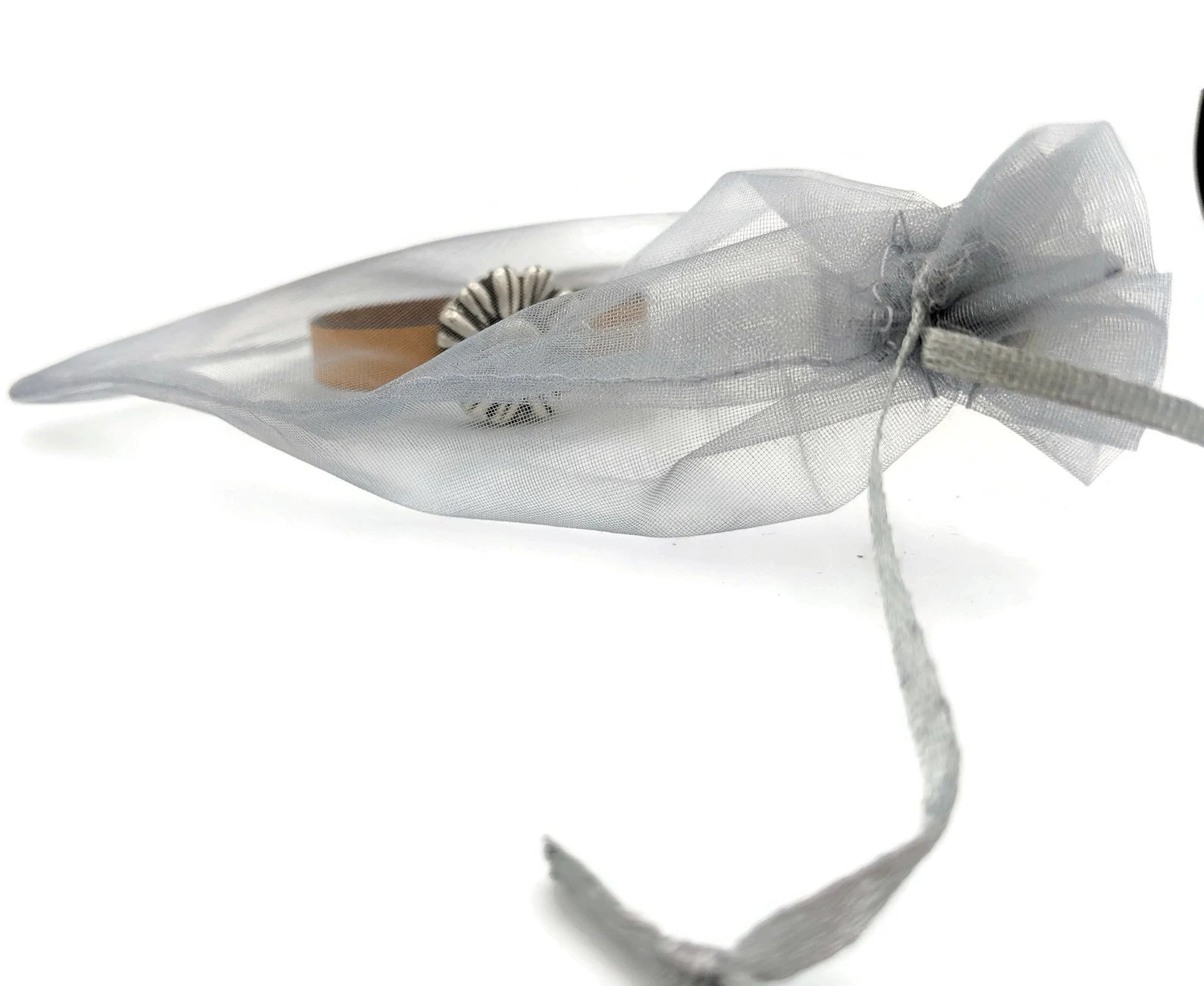 Gift wrapped in a matching organza draw string bag.