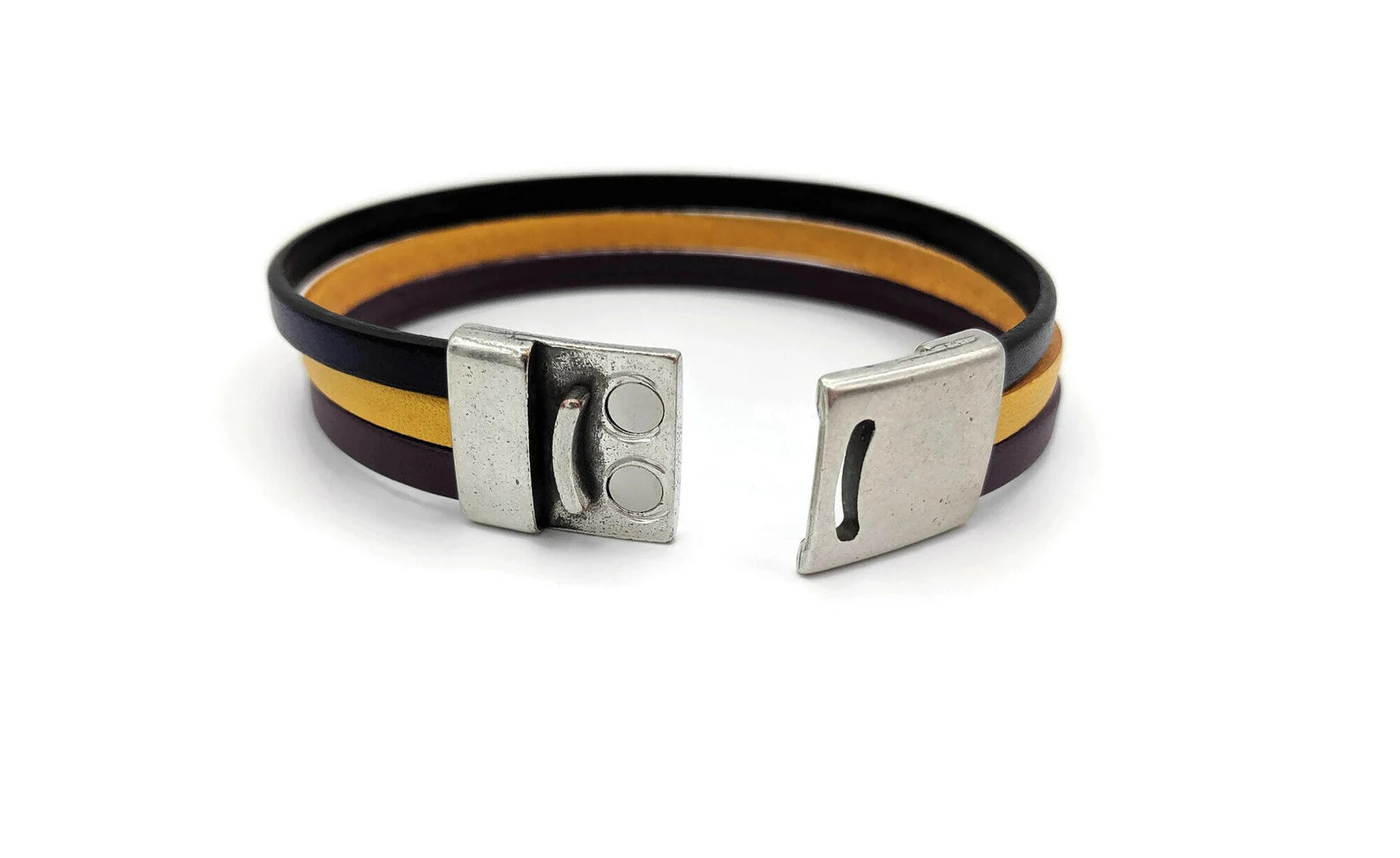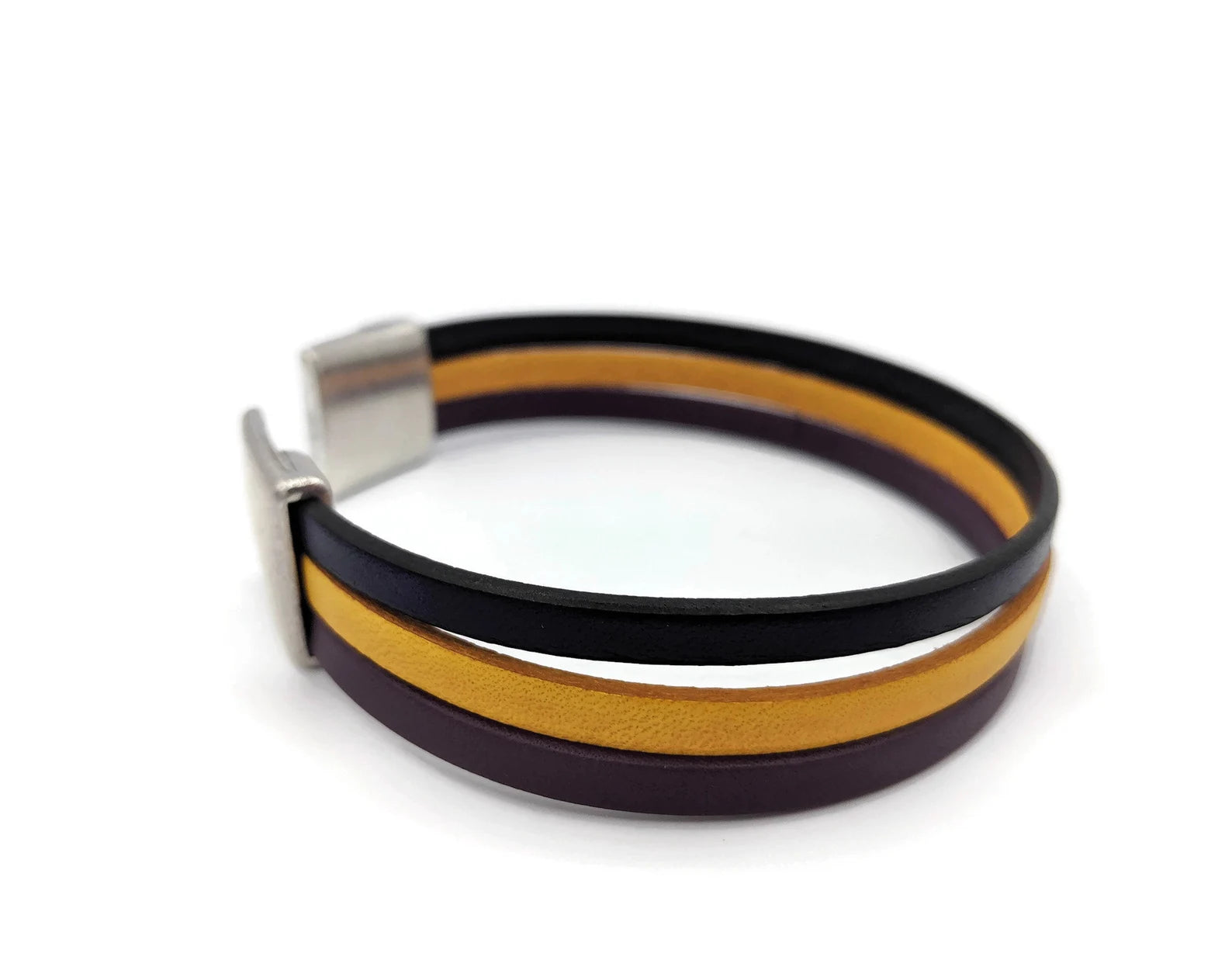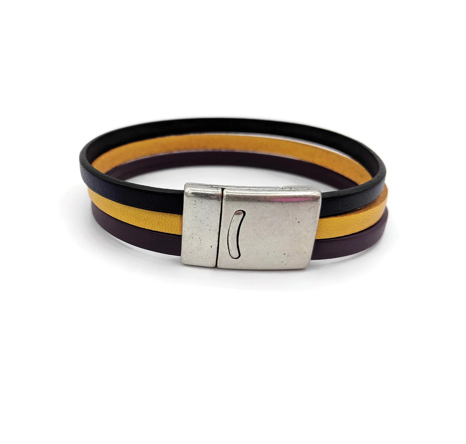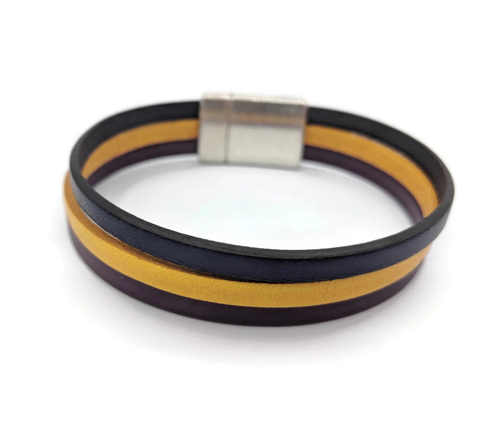 This is a 15 mm leather bracelet with a silver magnetic clasp. The bracelet consists of 3 strands of 5 mm leather. The leather colors are dark blue, yellow and purple. These three colors together represent bladder cancer awareness.