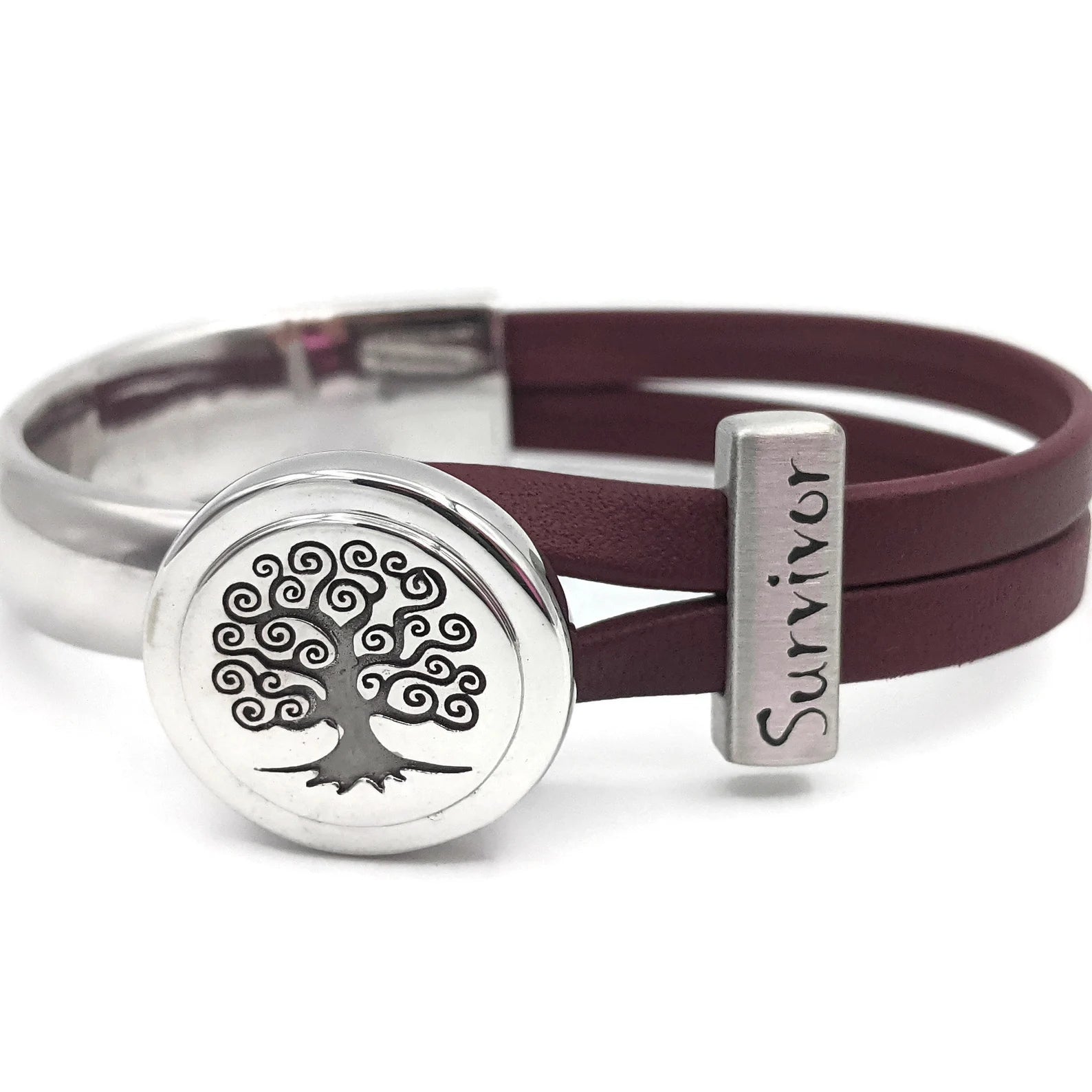 This is a handmade multiple myeloma Survivor Tree of Life Bracelet/burgundy leather Survivor bracelet. I wanted something different than the typical bracelets that I've seen. The burgundy leather represents Multiple Myeloma. The Tree of Life goes along with the SURVIVOR slider.