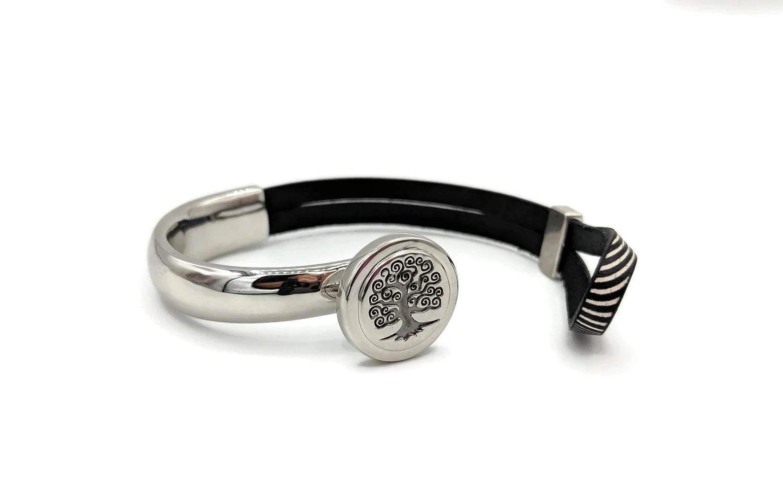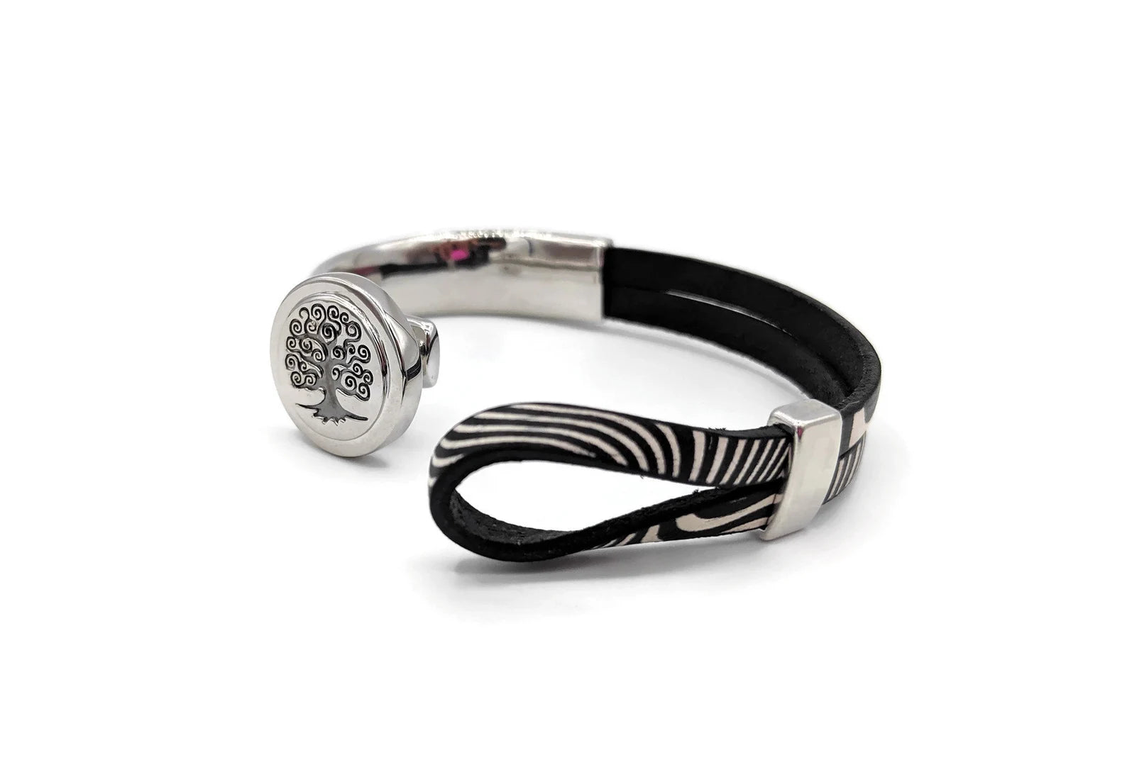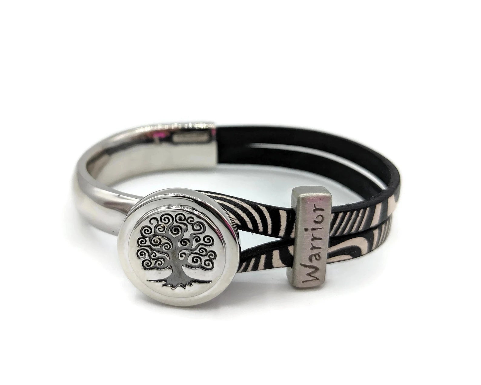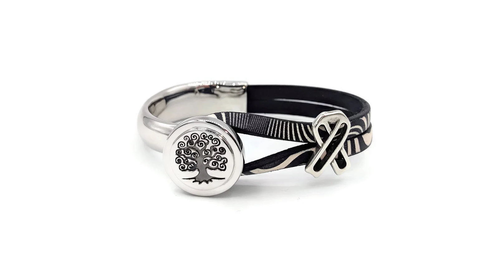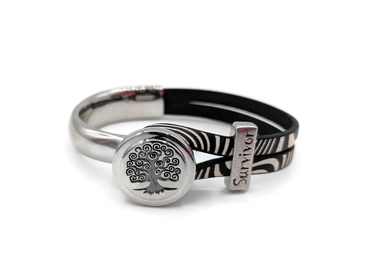 This is a handmade carcinoid cancer awareness bracelet. I wanted something different than the typical cancer awareness bracelets that I've seen. The zebra leather represents carcinoid and neuroendocrine cancer, the loop in the leather that you see around the Tree of Life is symbolic of a ribbon.