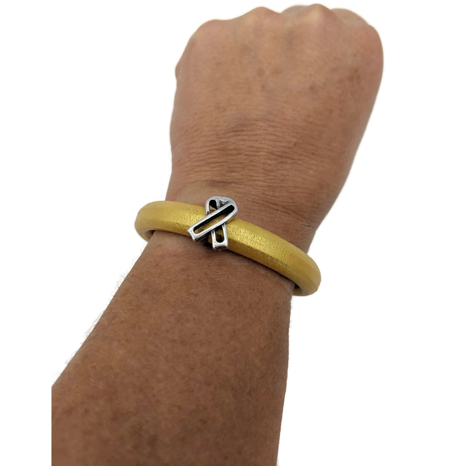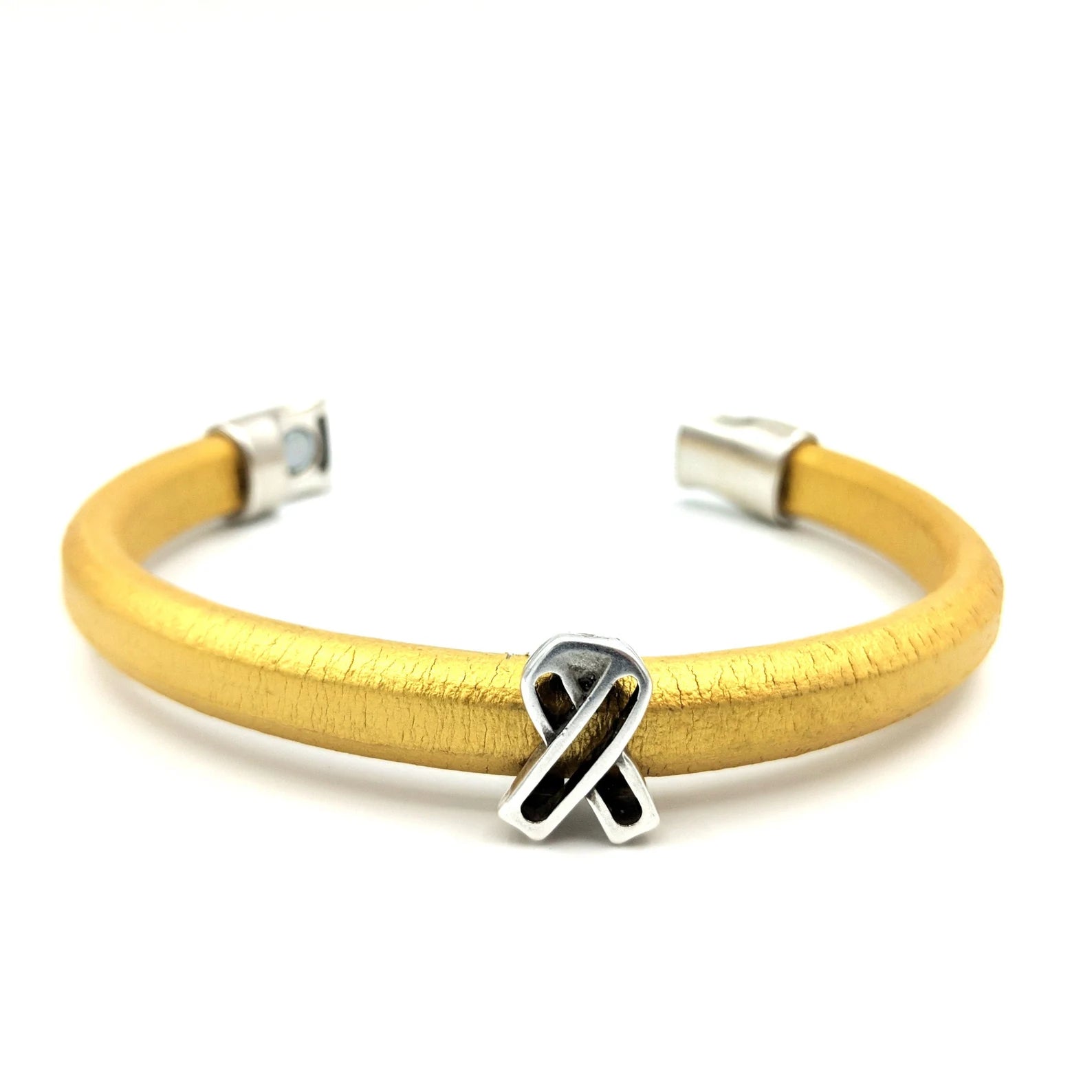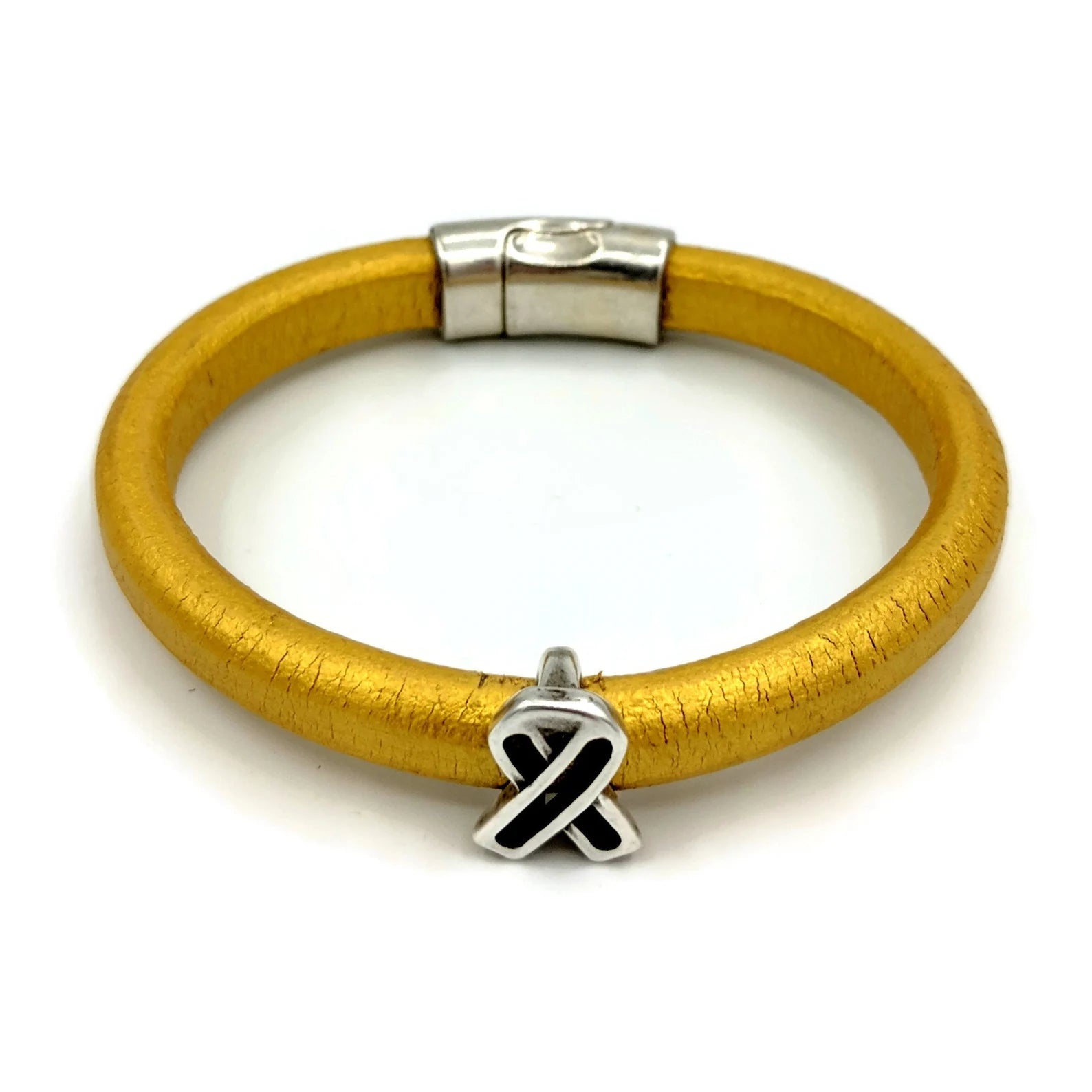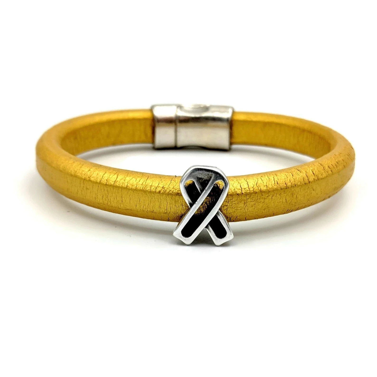 Childhood Cancer Awareness Bracelet. This is a gold licorice leather bracelet with an open silver awareness ribbon. You can see the gold leather through the ribbon slider. It is fastened with a Regaliz magnetic silver clasp.