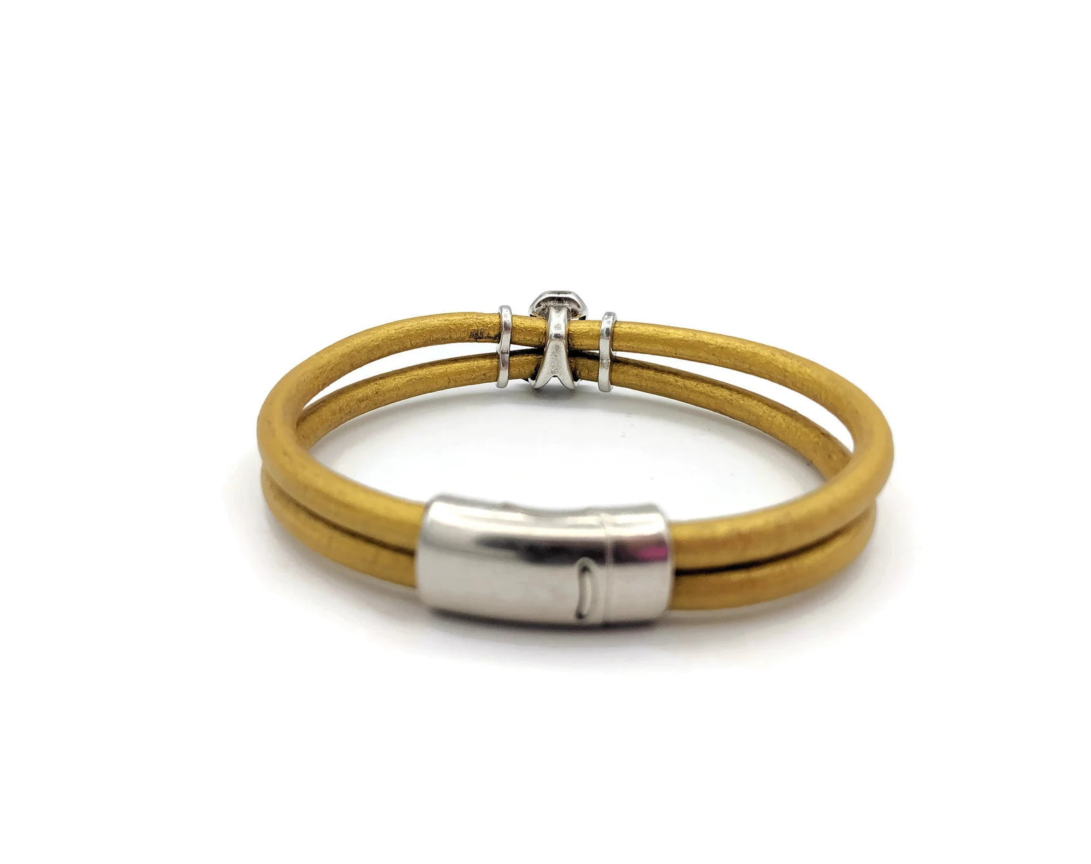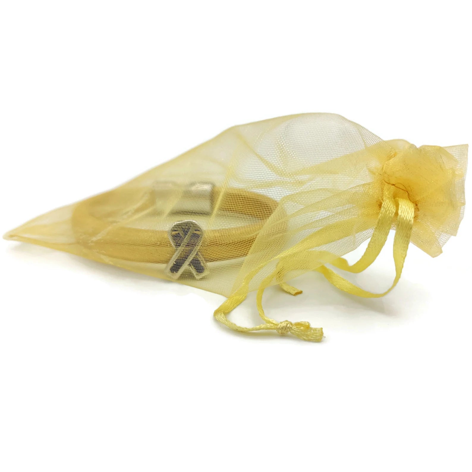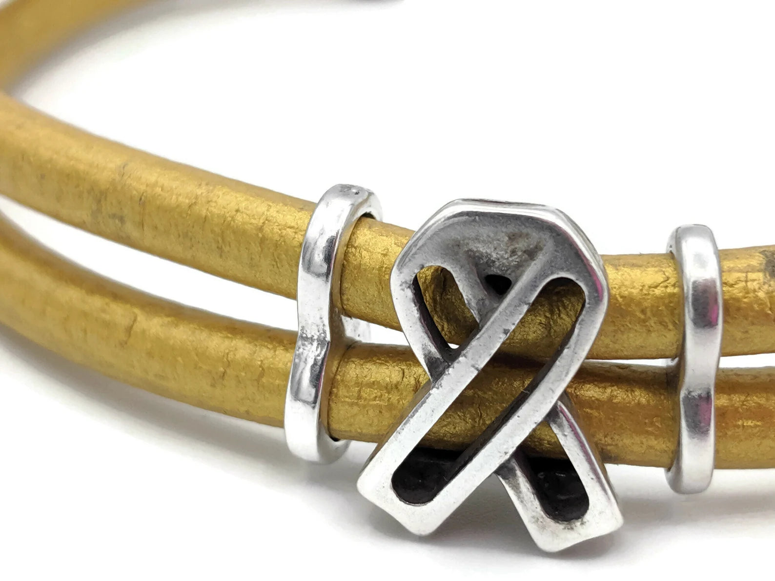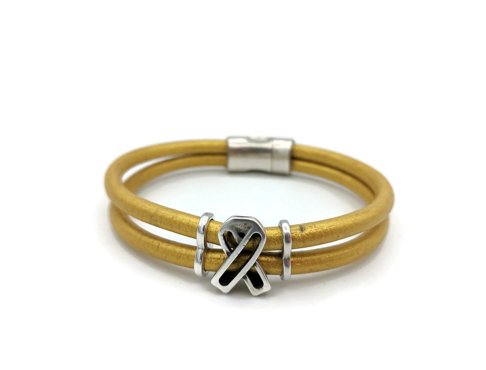 Childhood Cancer Awareness Bracelet. This is a gold licorice leather bracelet with an open silver awareness ribbon. You can see the gold leather through the ribbon slider. It is fastened with a Regaliz magnetic silver clasp.