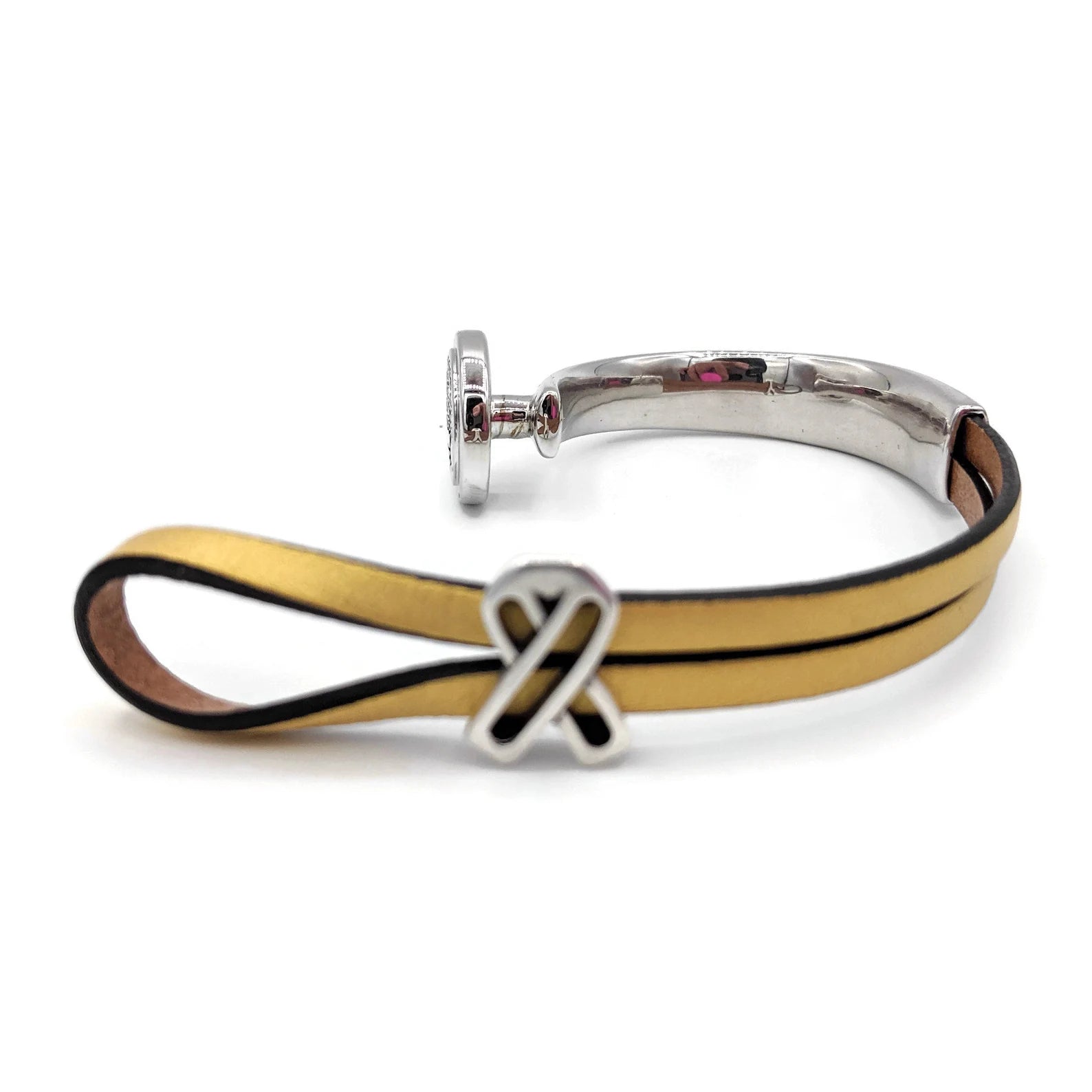 The loop in the leather is symbolic of a ribbon and the gold leather is visible through the silver open awareness ribbon.