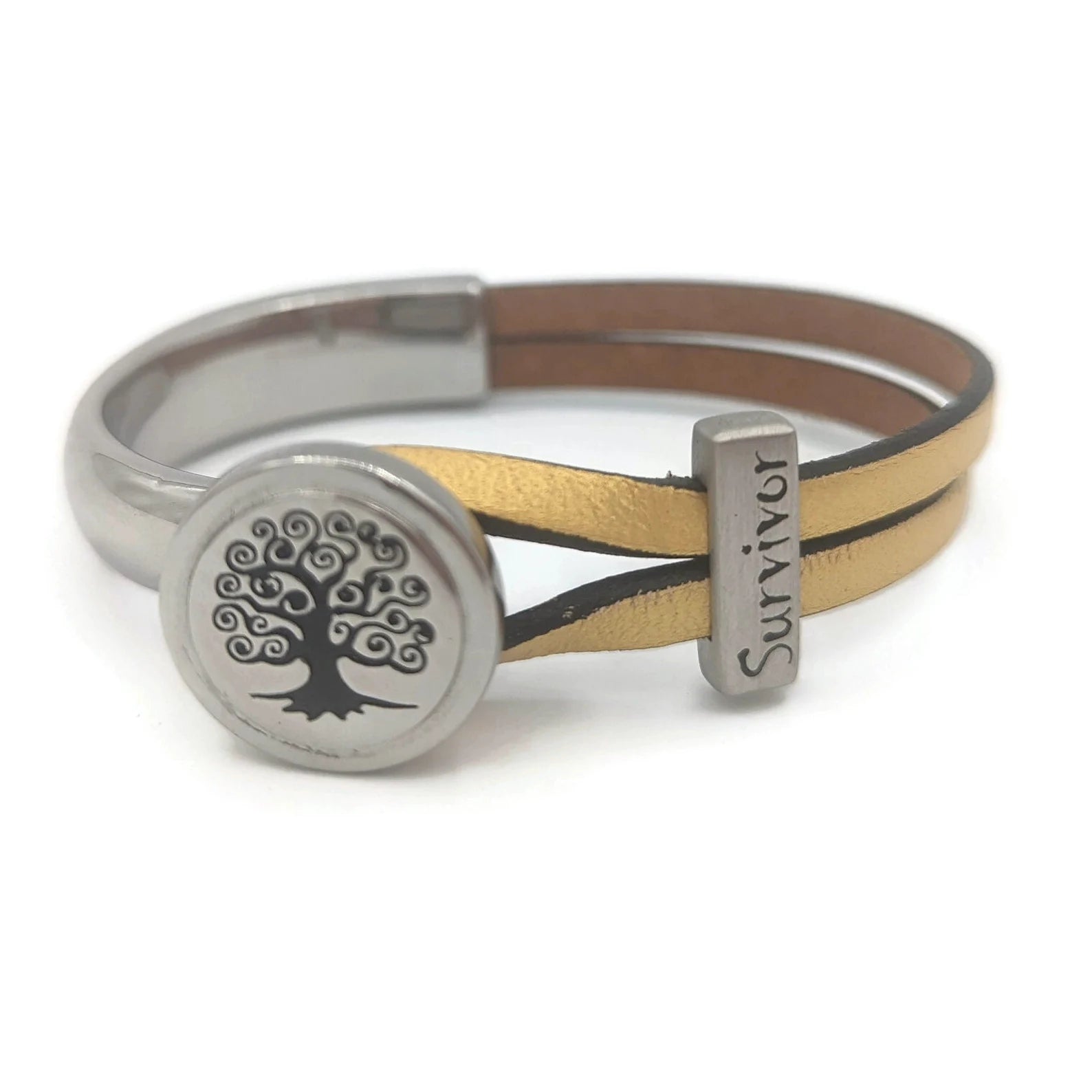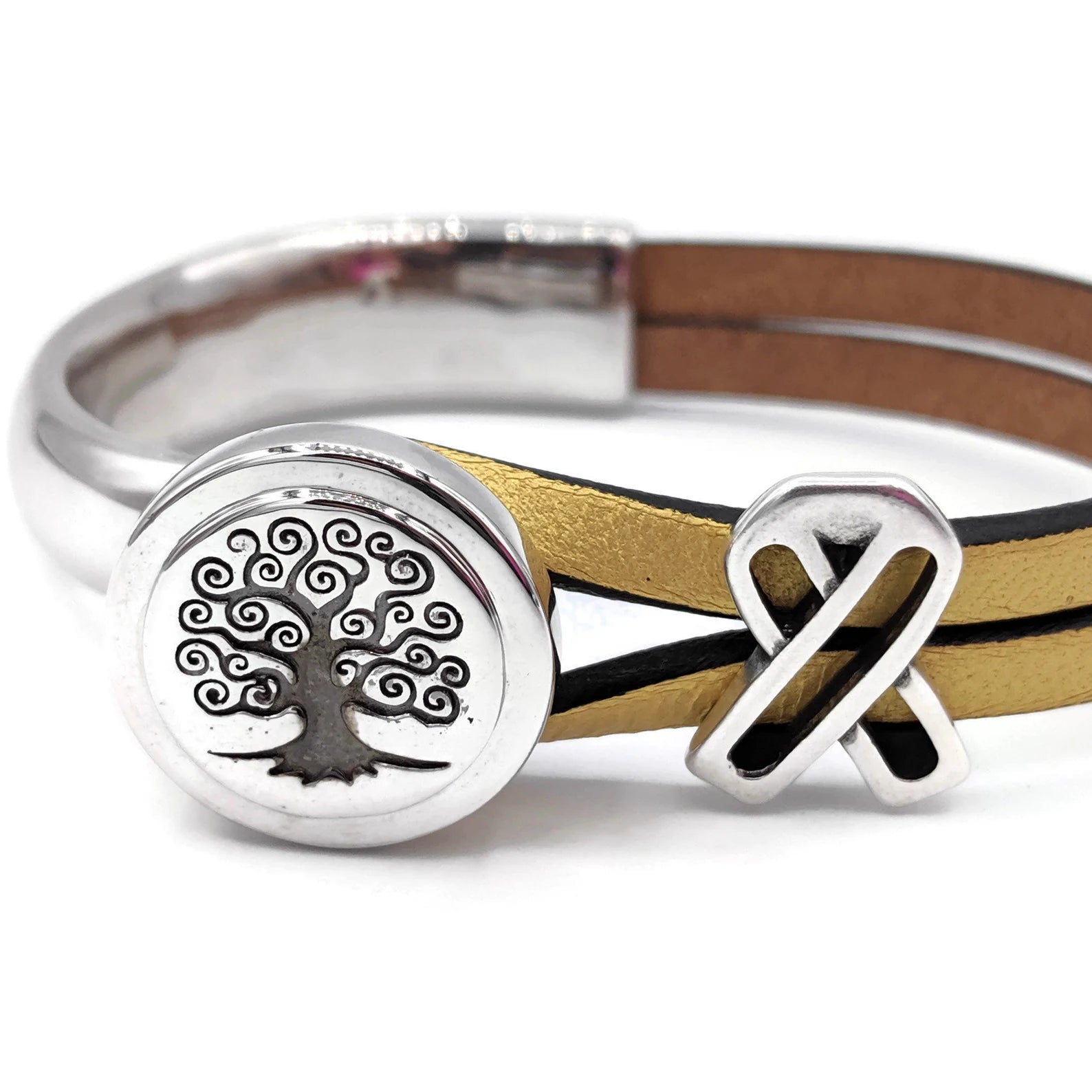 This is a handmade gold leather awareness ribbon bracelet with a Tree of Life half cuff.