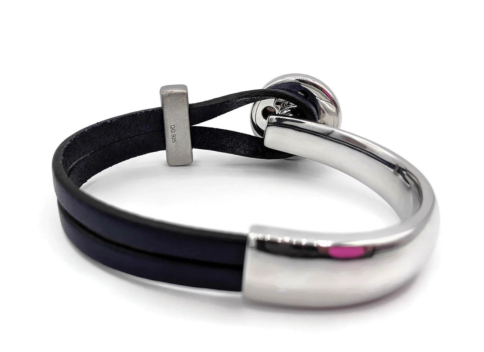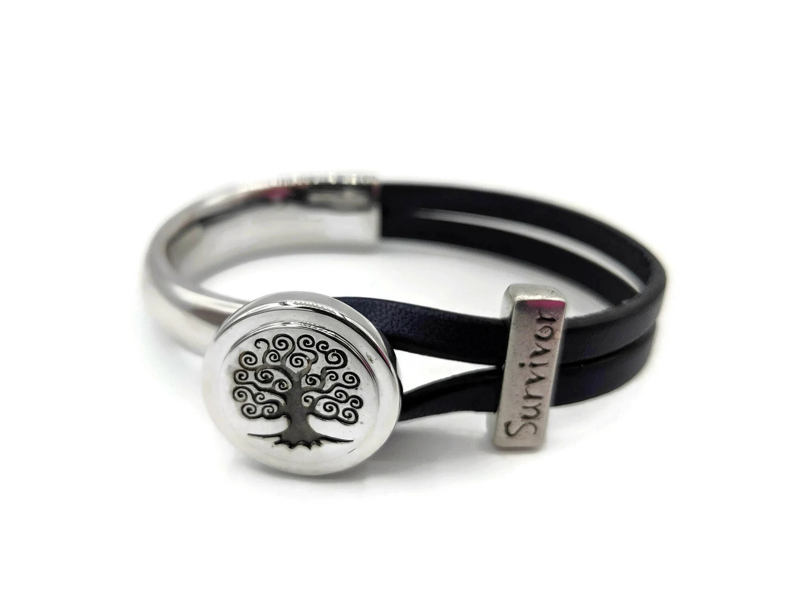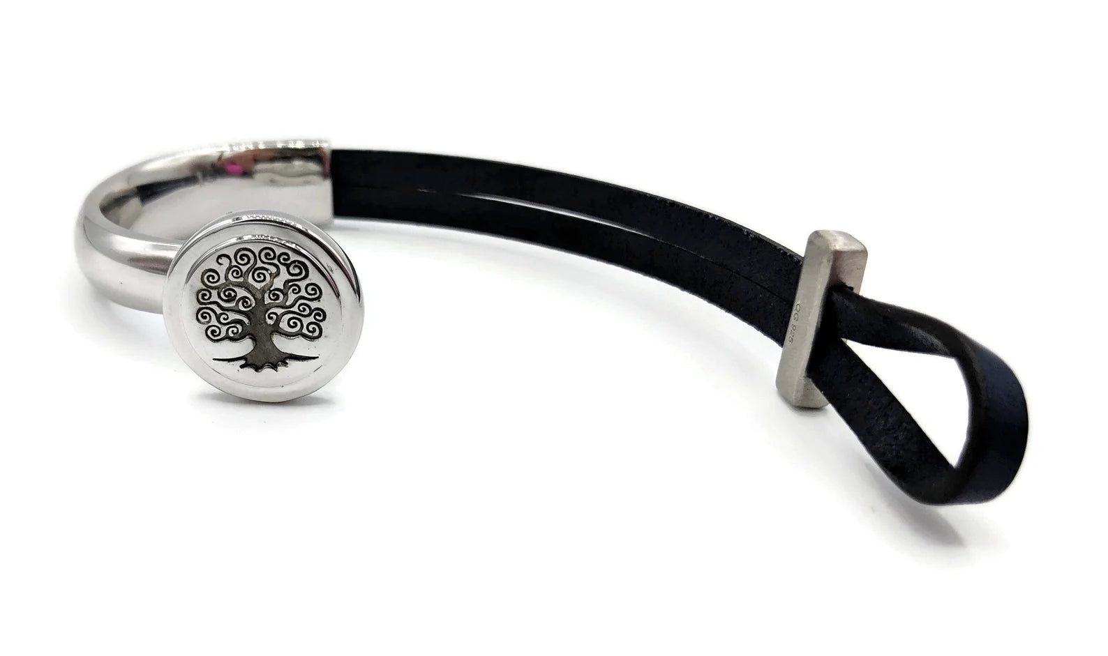 This is a Navy Blue leather Tree of Life half cuff bracelet with a sterling silver brushed "Warrior" slider. The bracelet is handmade with 100 % genuine leather. This would be a wonderful and thoughtful gift for a friend or loved one.