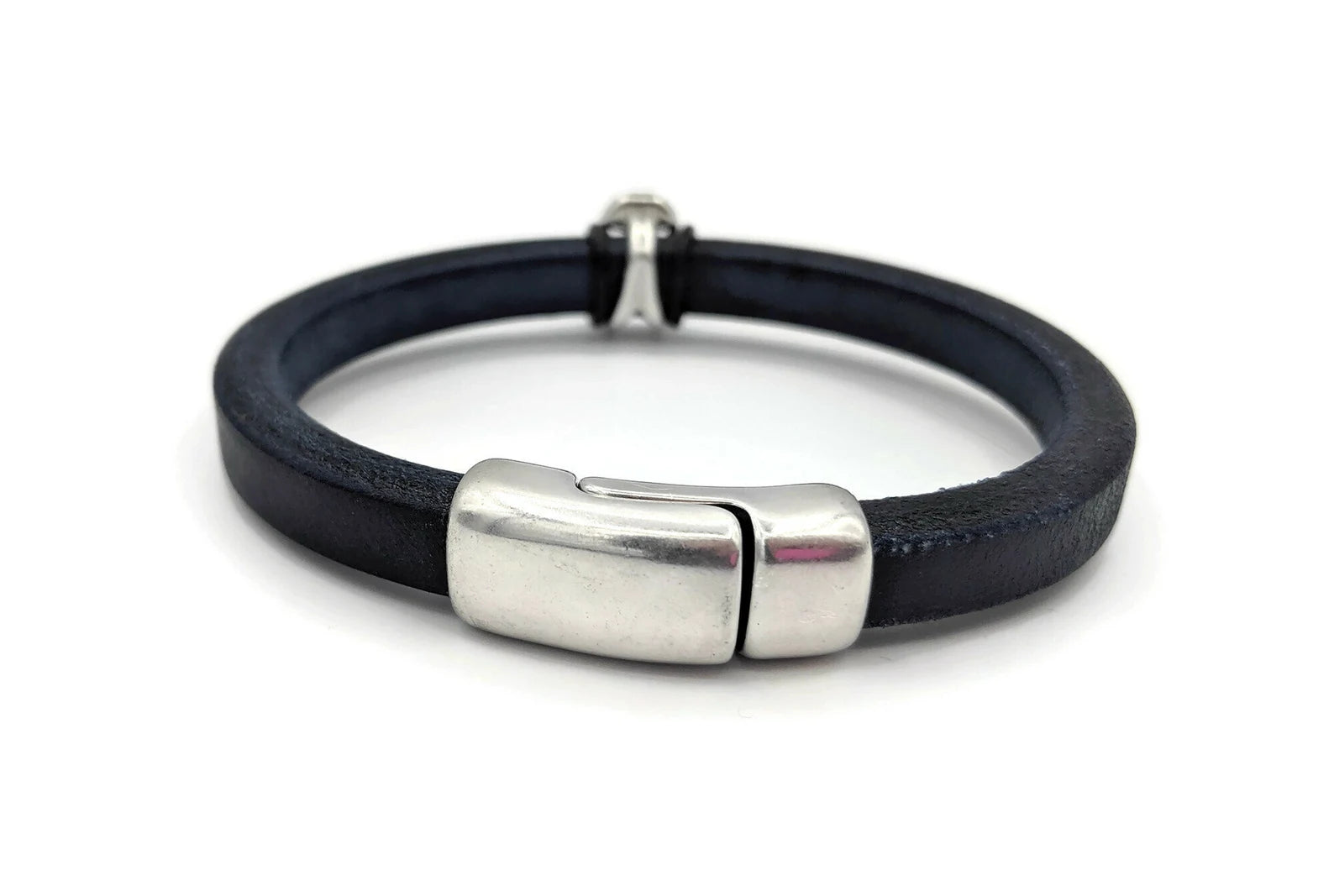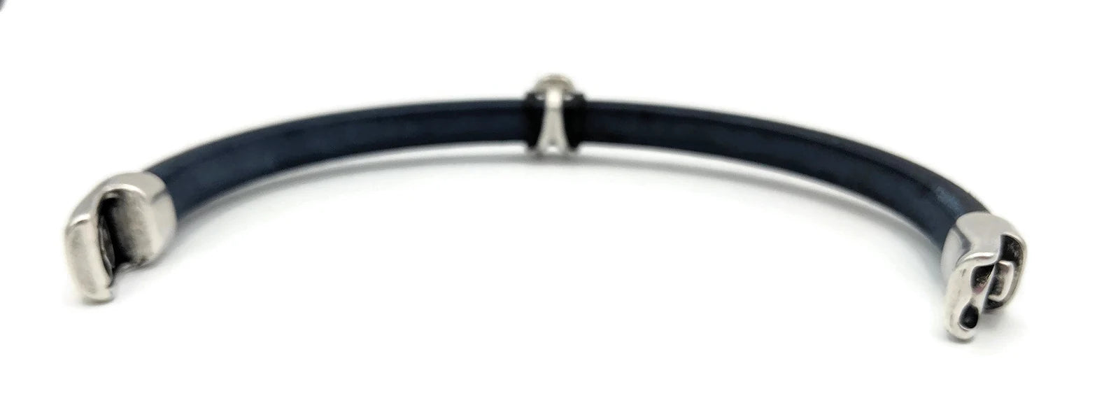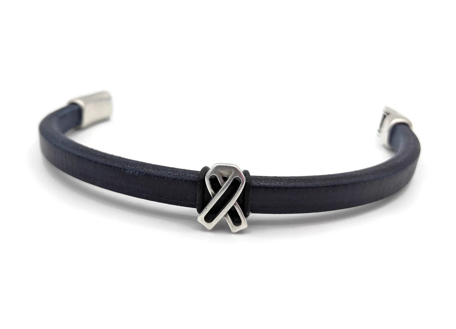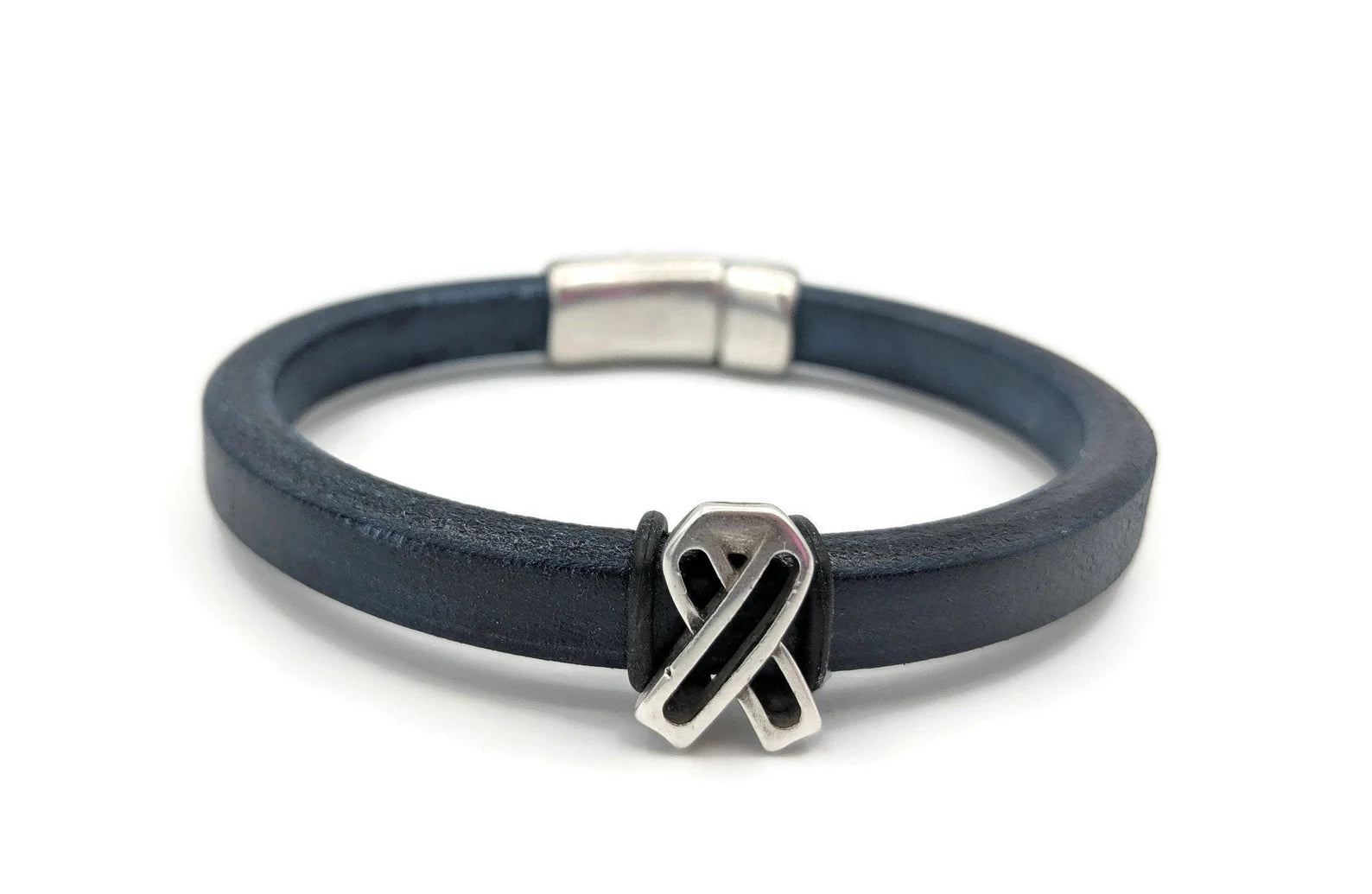 This is a beautiful handmade awareness bracelet. It is a dark blue Regaliz leather. The bracelet has a Regaliz magnetic clasp closure and a silver open awareness ribbon.