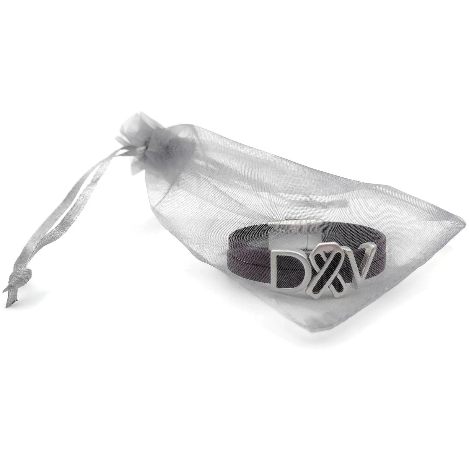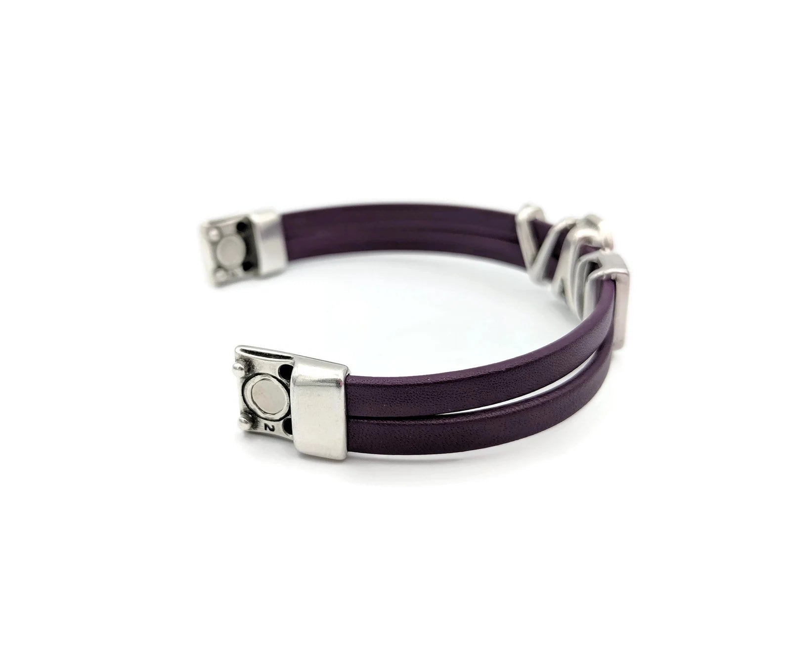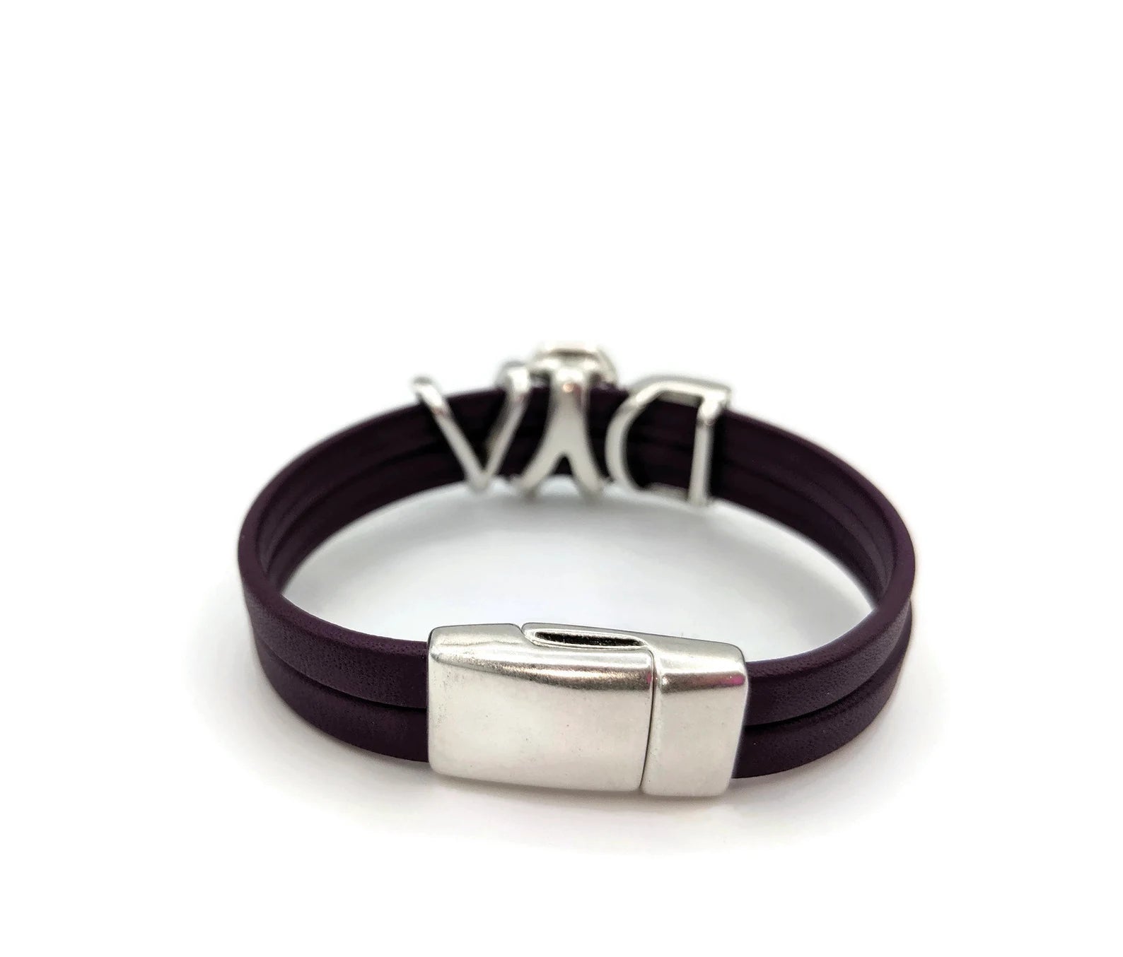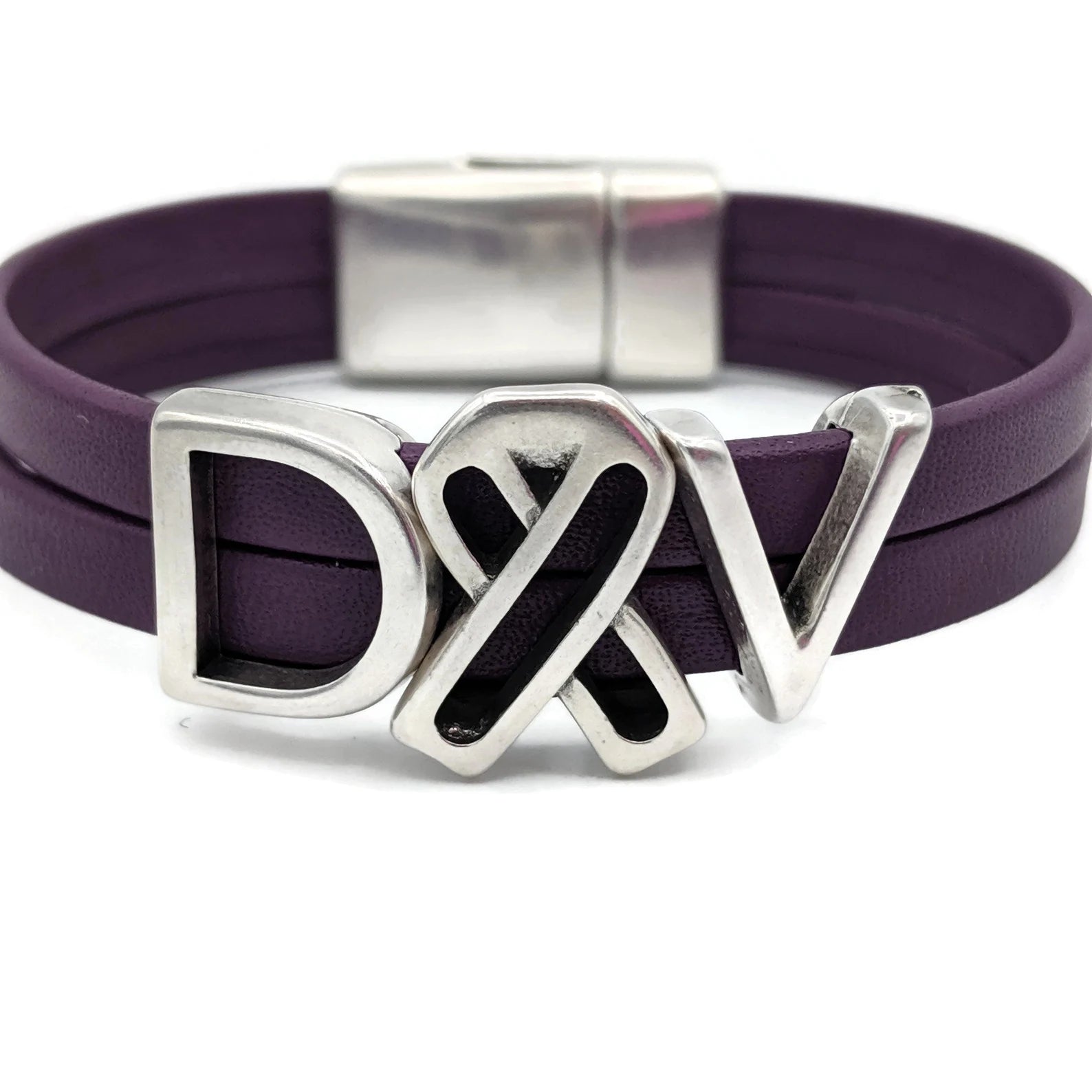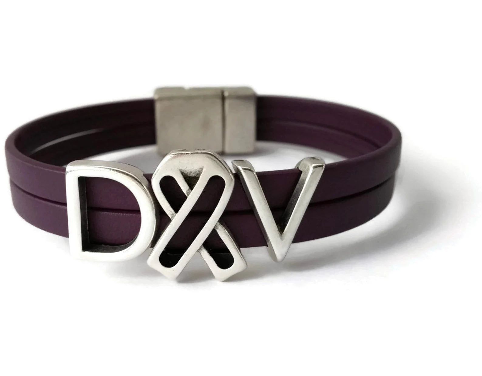 This is a handmade domestic violence awareness bracelet. It is a flat purple leather with a "D" and "V" on either side of an open silver awareness ribbon. The bracelet fastens with a magnetic clasp.