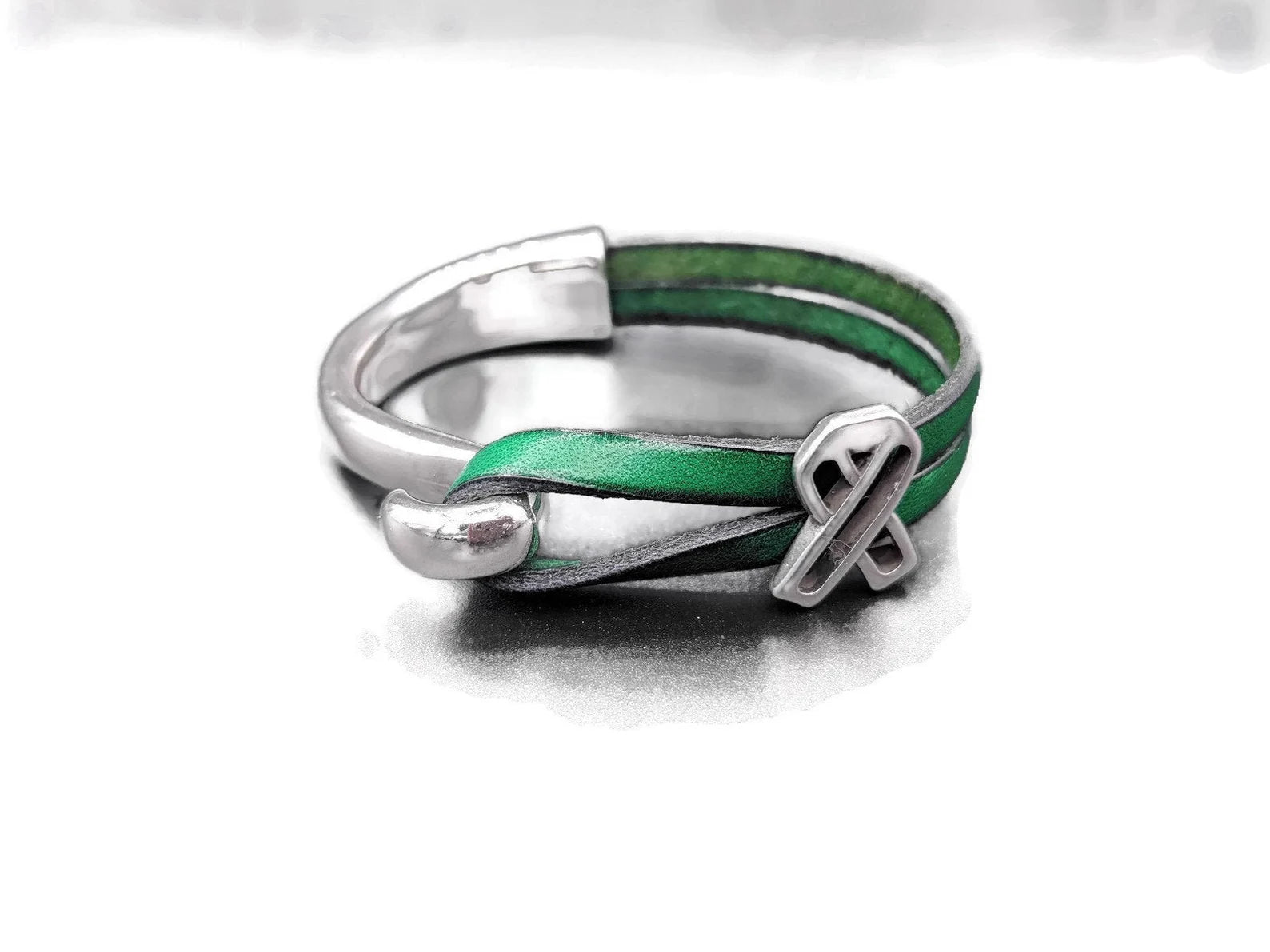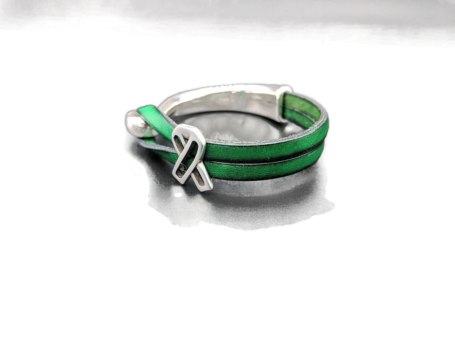 The kelly green leather is accented with a silver open awareness ribbon. The beautiful green leather can be seen through the ribbon. The bracelet is handmade with 100 % genuine leather. This would make a wonderful gift for a friend or loved one affected liver cancer, bile duct cancer, gallbladder caner or any of the following represented by the green awareness ribbon: