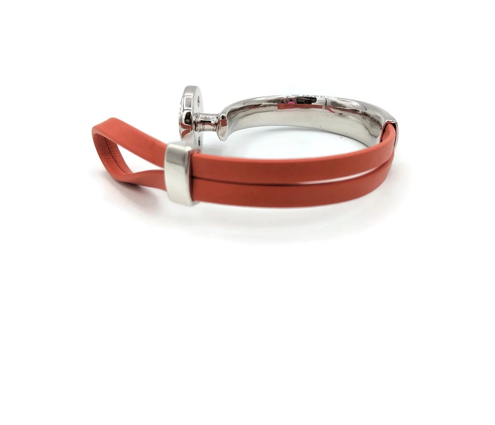This is a Tree of Life half cuff and leather bracelet. The orange leather is accented with a plain silver slider.