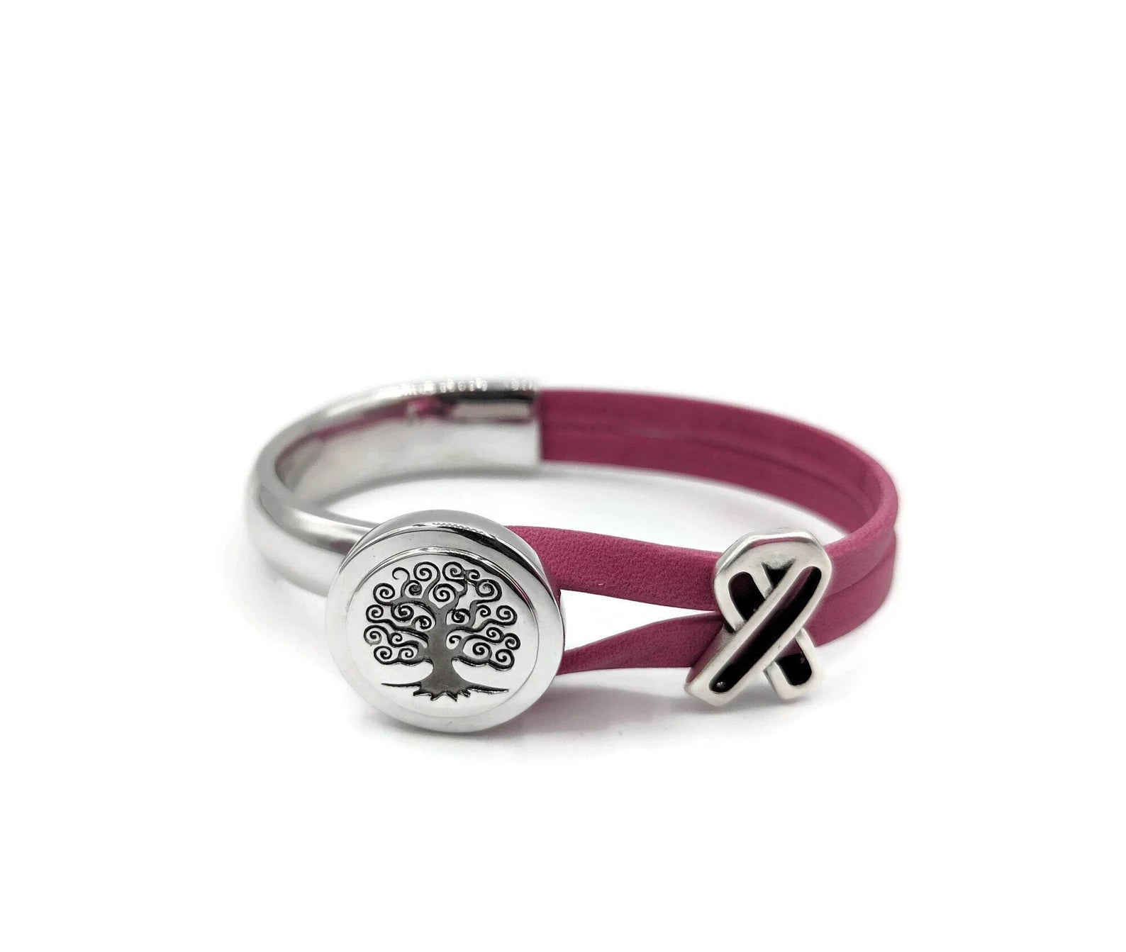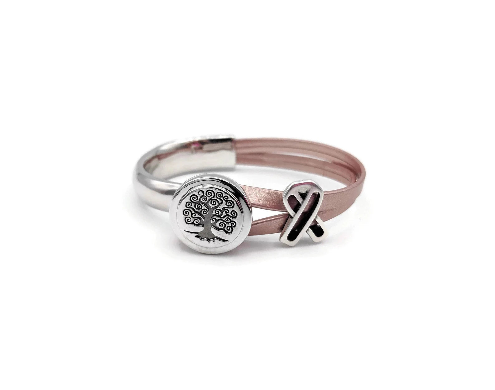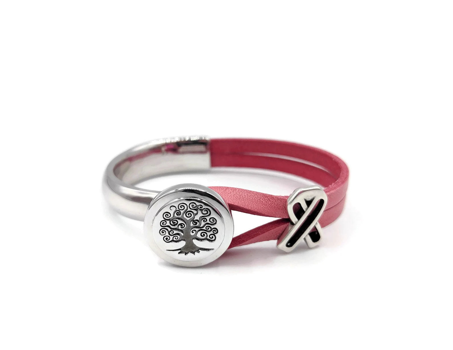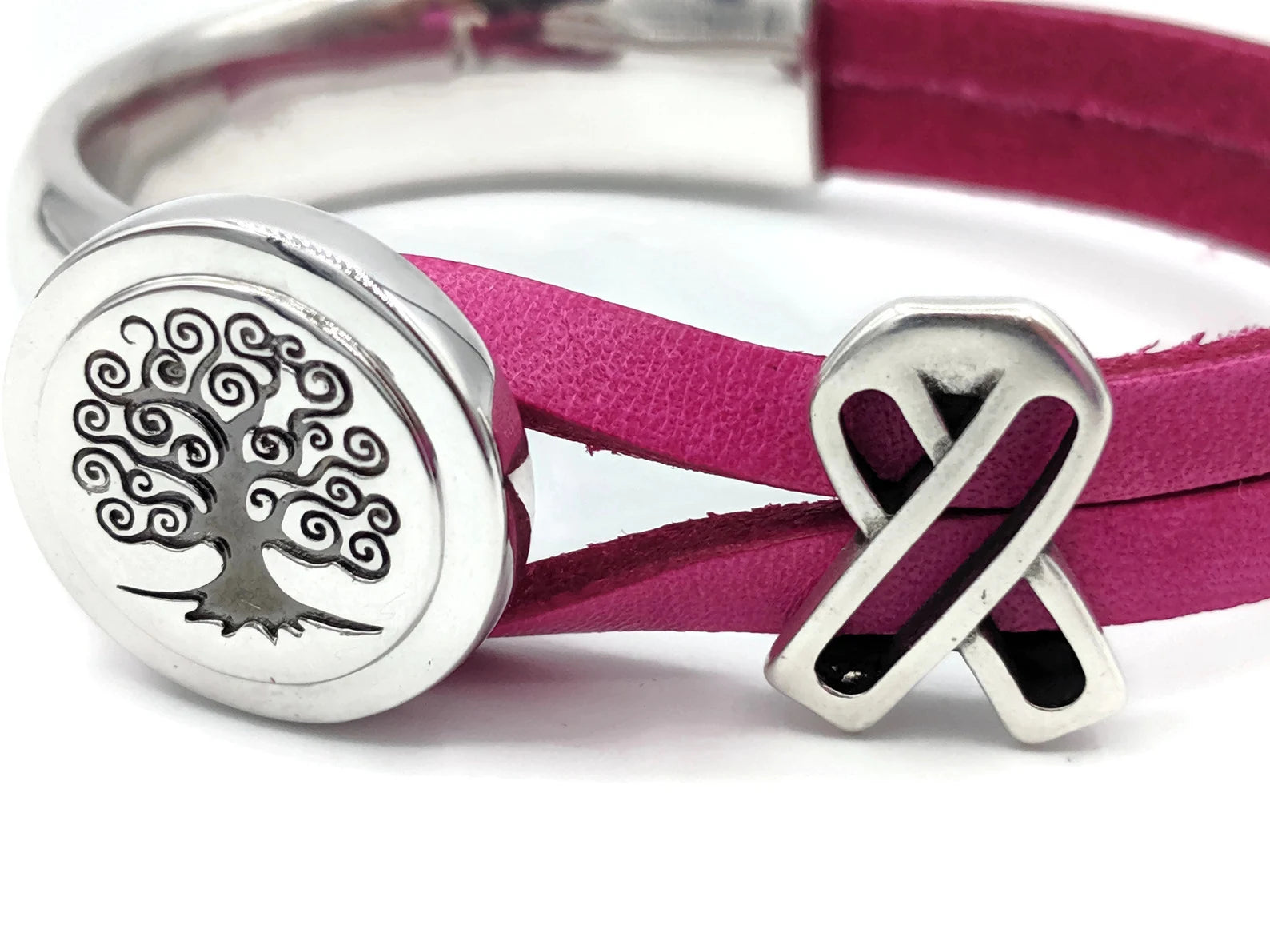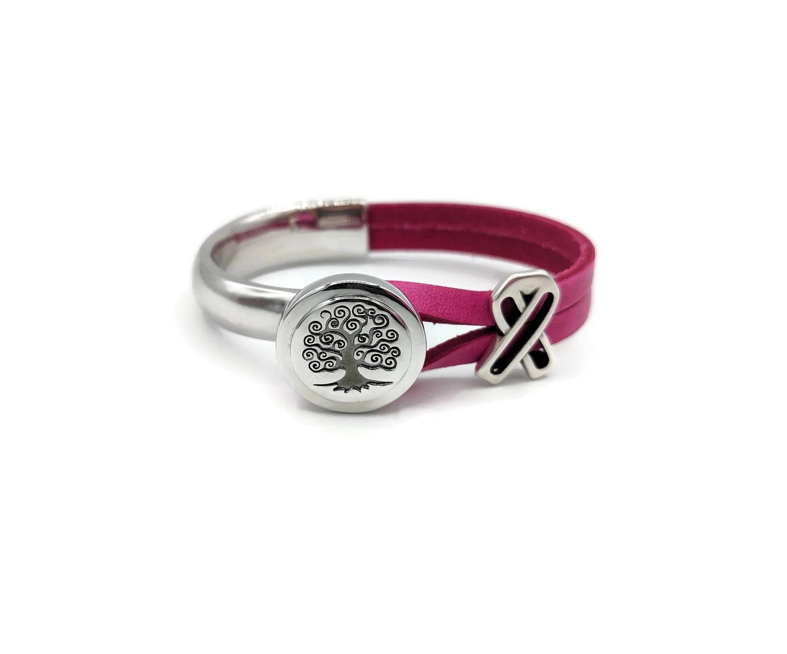 This is a handmade breast cancer awareness bracelet. I went through breast cancer in 2010-2011, again in 2016 and now I am thriving with metastatic breast cancer. I was inspired to make a bracelet and I wanted something different than the typical pink ribbon bracelets that I see everywhere. The hibiscus pink leather represents breast cancer, the loop in the leather that you see around the Tree of Life is symbolic of a ribbon.