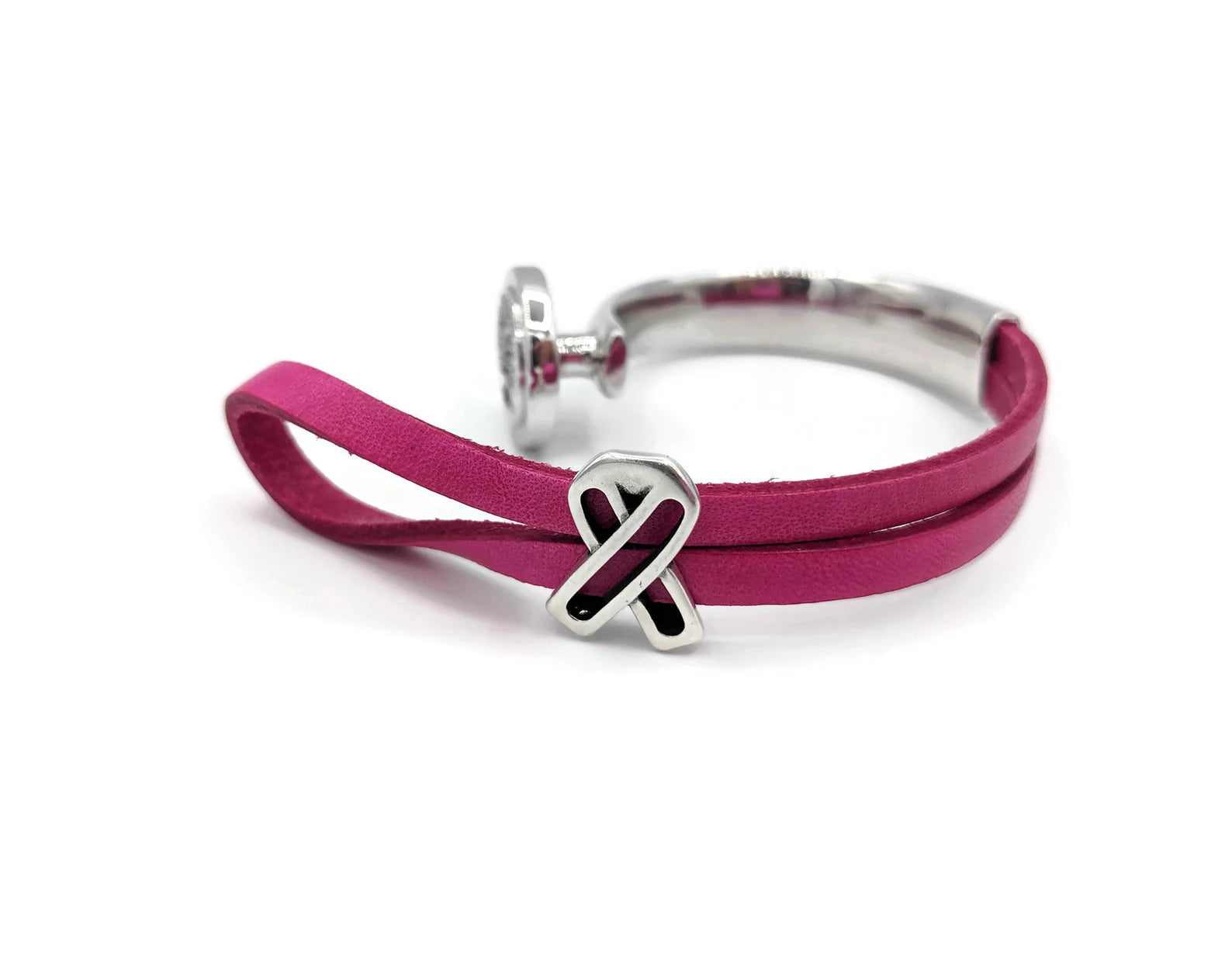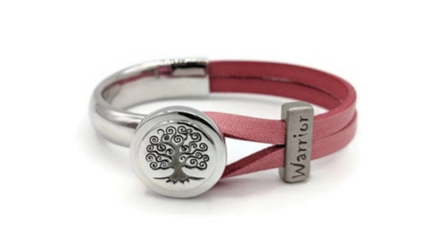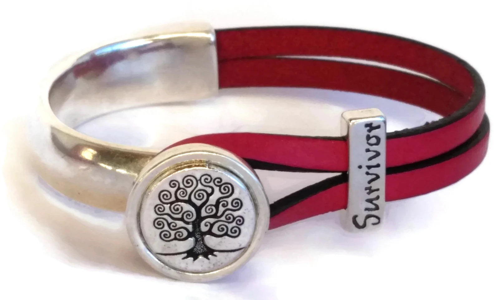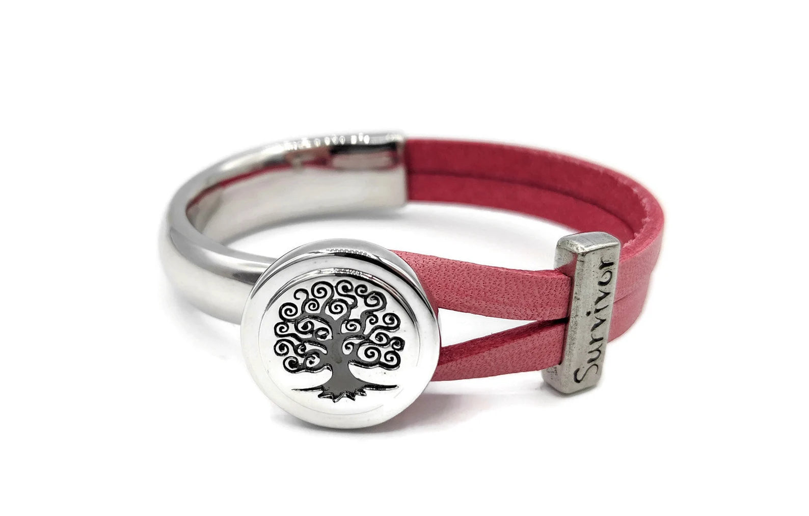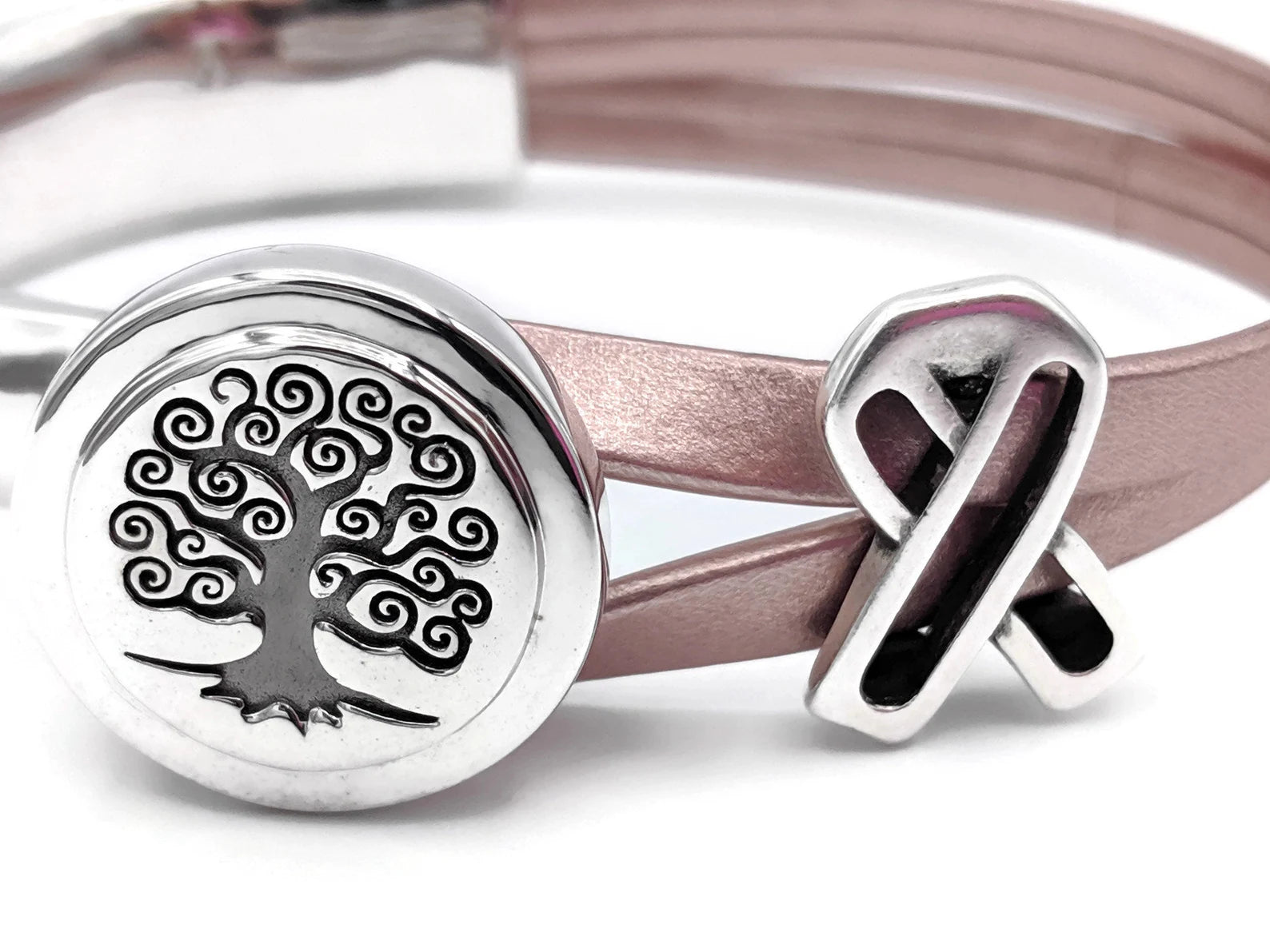This is a handmade breast cancer awareness bracelet. I went through breast cancer in 2010-2011, again in 2016 and now I am thriving with metastatic breast cancer. I was inspired to make a bracelet and I wanted something different than the typical pink ribbon bracelets that I see everywhere. The hibiscus pink leather represents breast cancer, the loop in the leather that you see around the Tree of Life is symbolic of a ribbon.