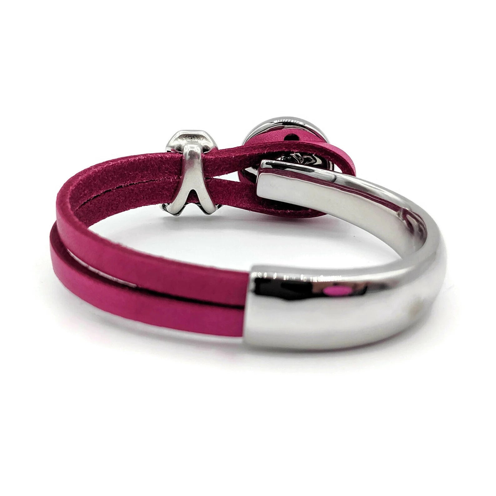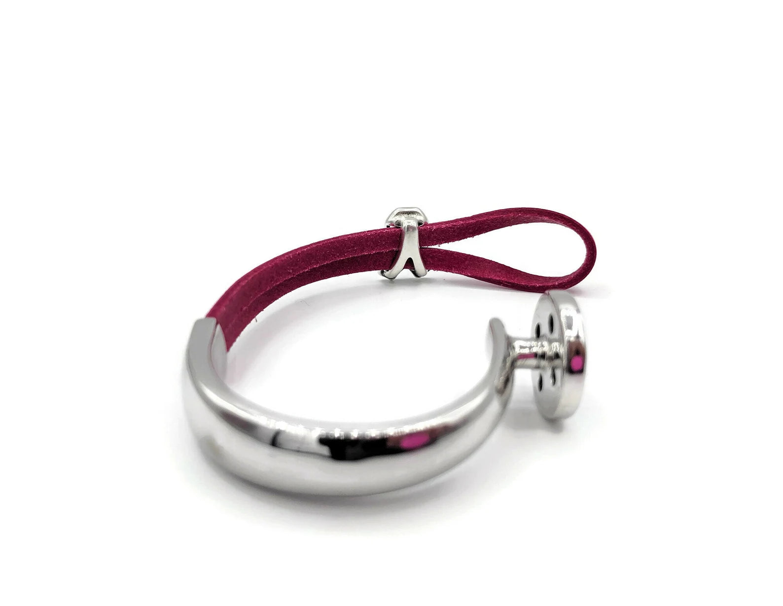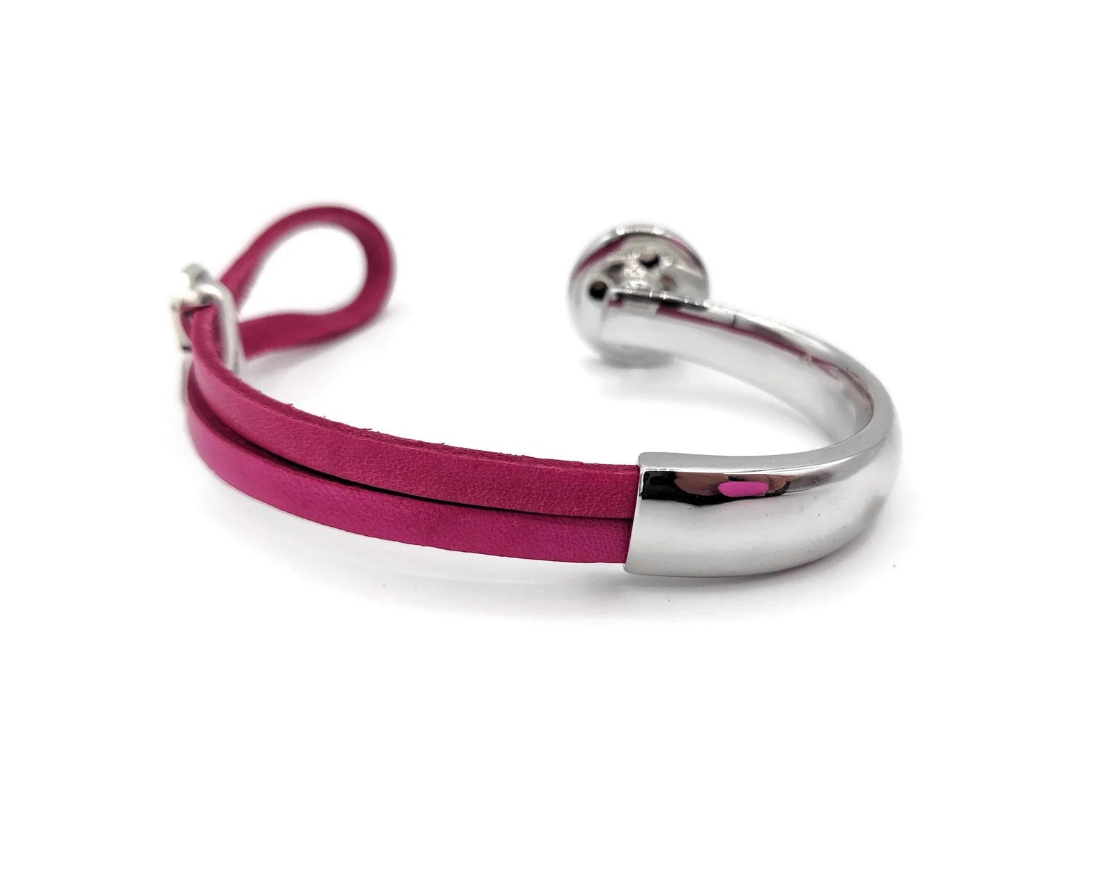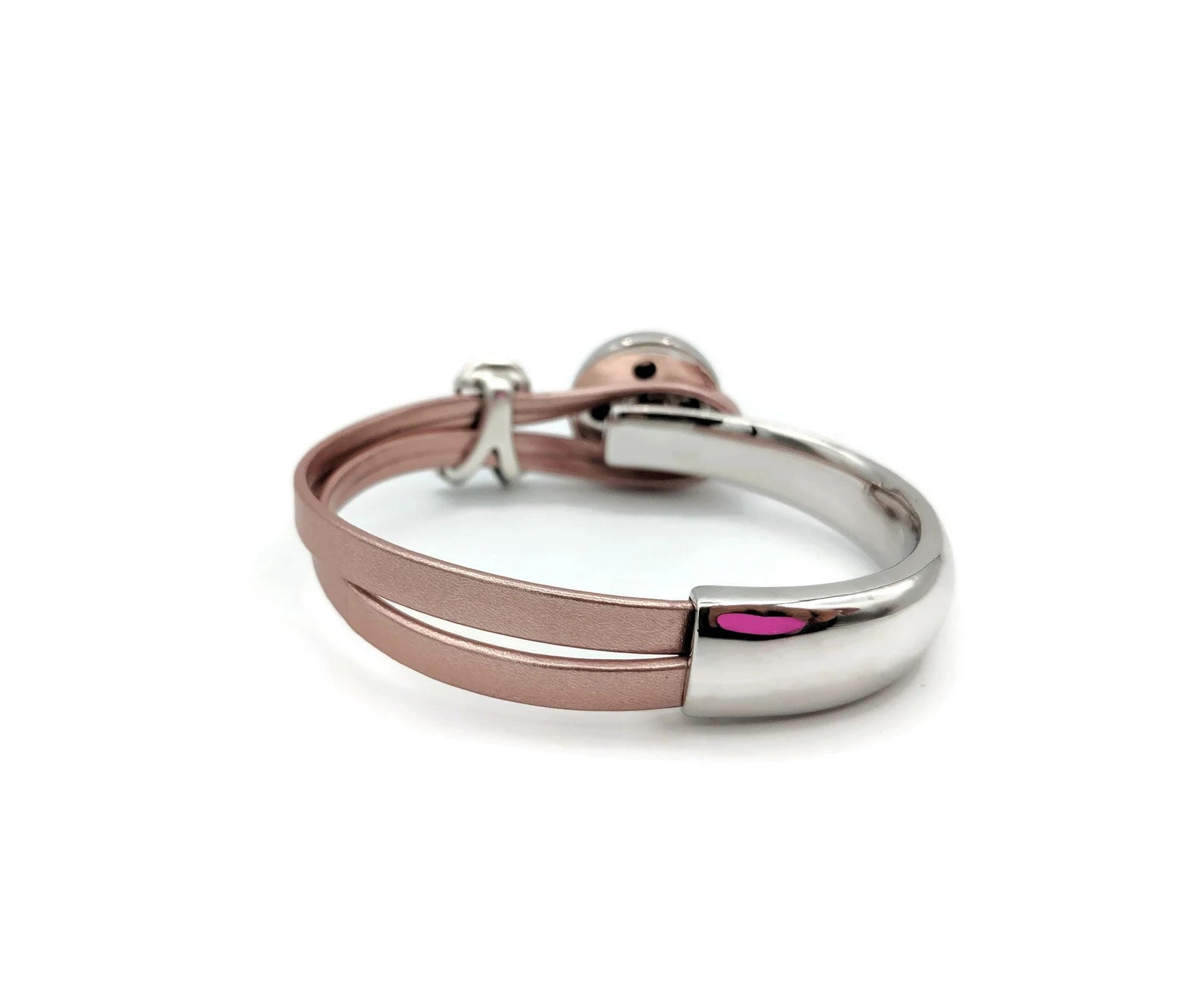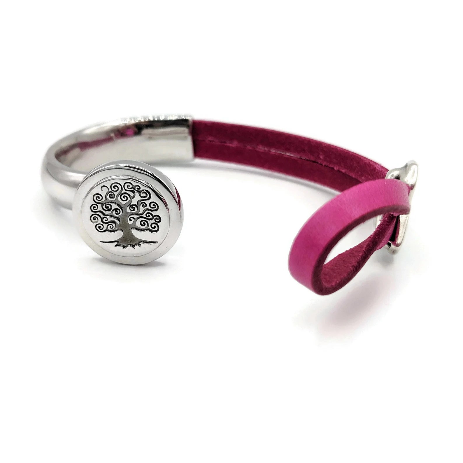 This is a handmade breast cancer awareness bracelet. I went through breast cancer in 2010-2011, again in 2016 and now I am thriving with metastatic breast cancer. I was inspired to make a bracelet and I wanted something different than the typical pink ribbon bracelets that I see everywhere. The hibiscus pink leather represents breast cancer, the loop in the leather that you see around the Tree of Life is symbolic of a ribbon.