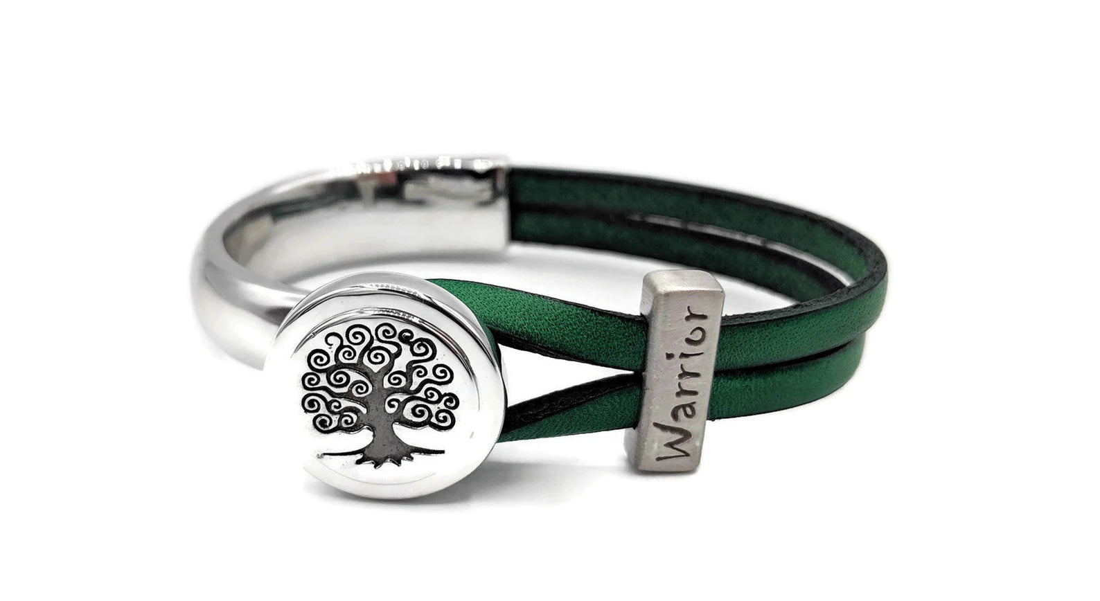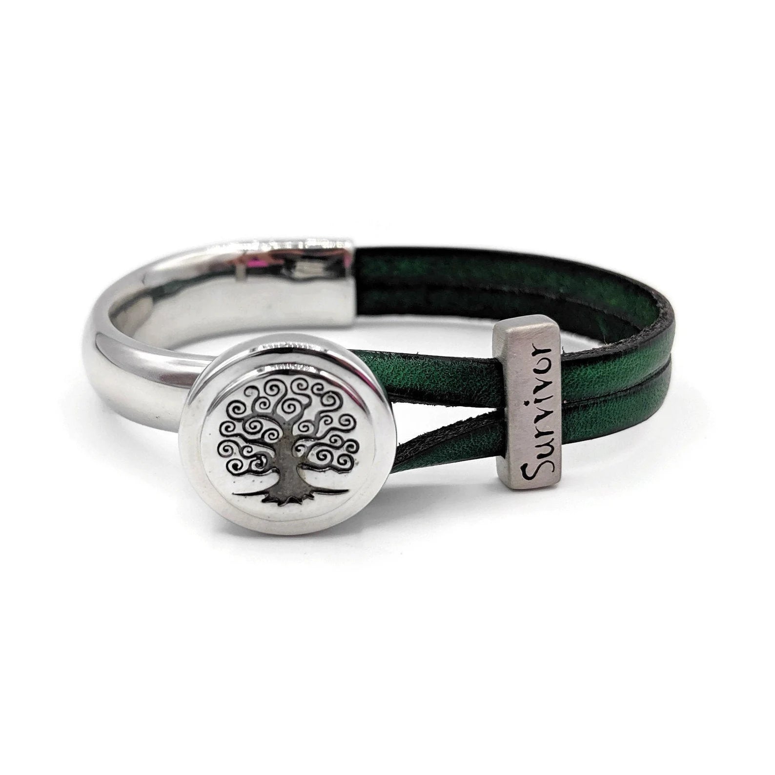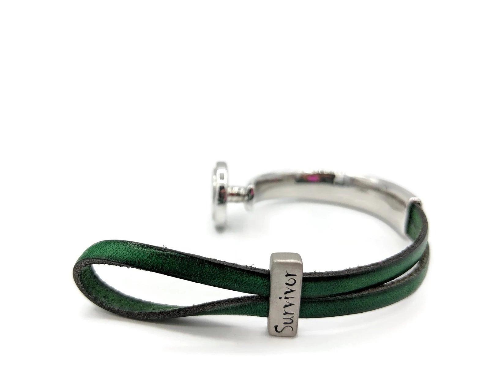 This is a green leather Tree of Life half cuff bracelet with a sterling silver brushed "Survivor" slider. The bracelet is handmade with 100 % genuine leather. This would be a wonderful and thoughtful gift for a friend or loved one affected by liver cancer, gallbladder cancer or bile duct cancer. The green leather represents the green awareness ribbon color.