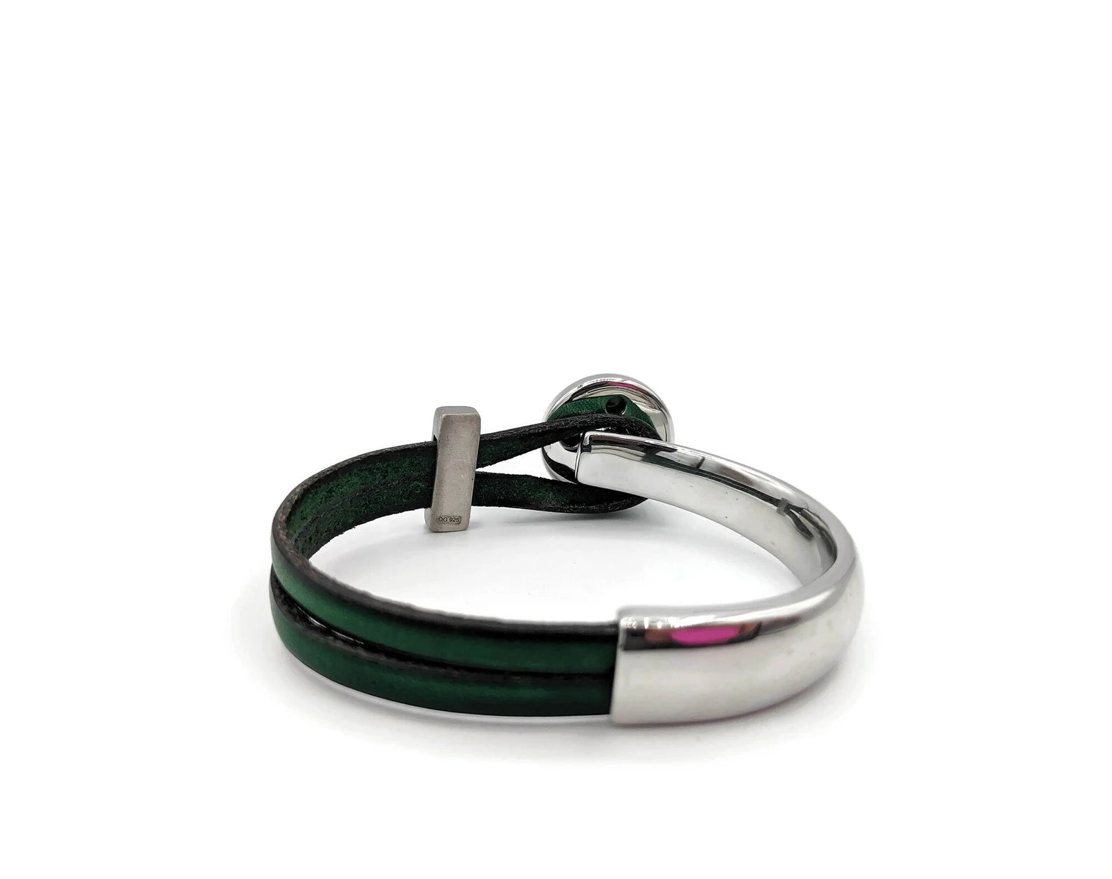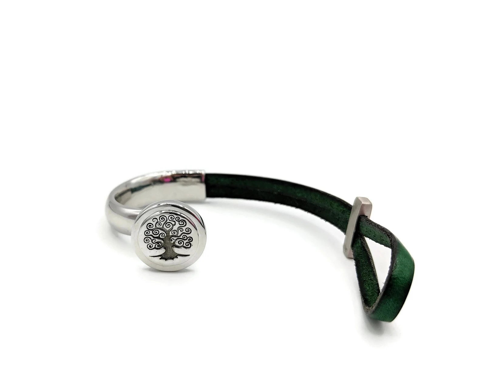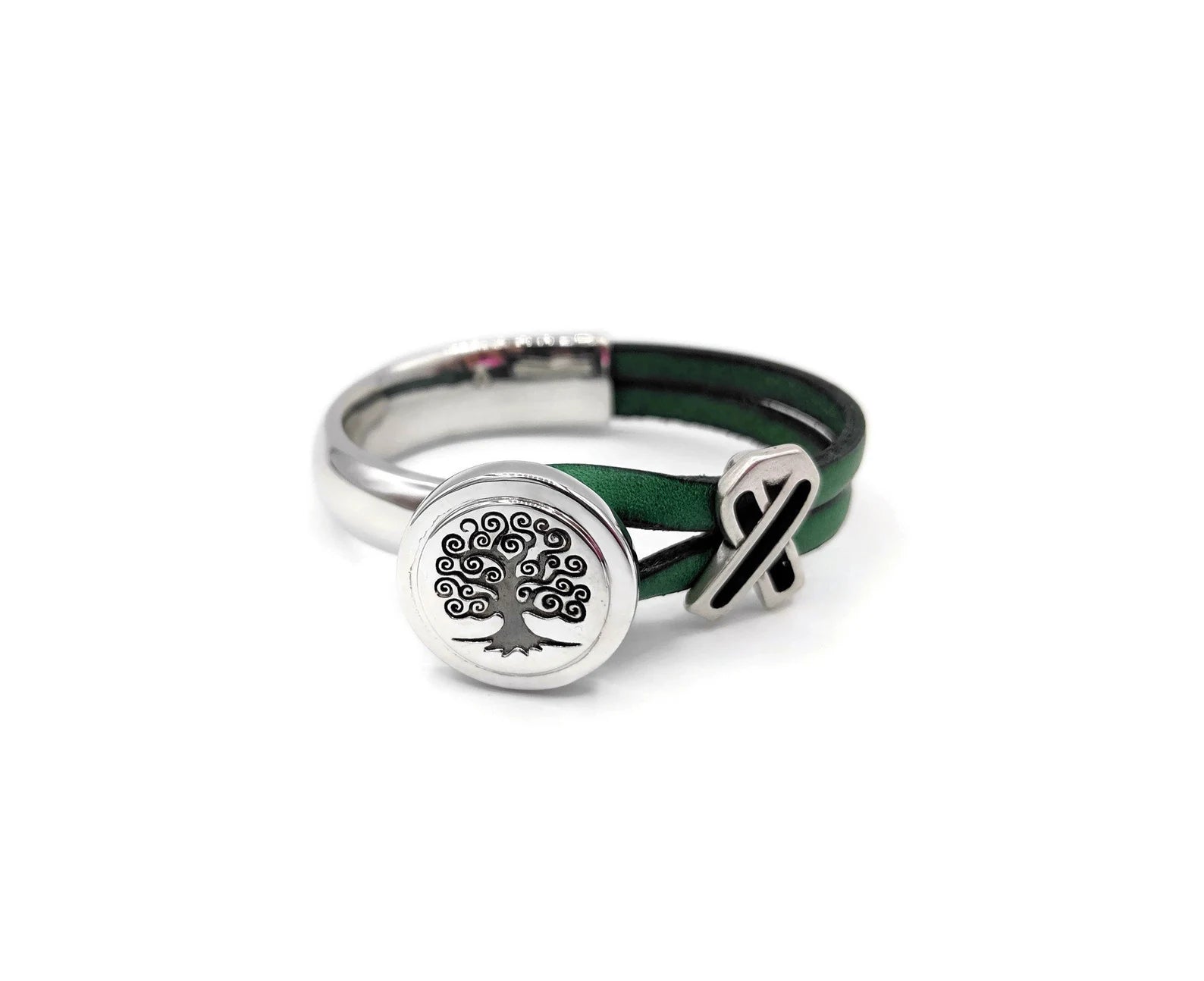 This is a green leather Tree of Life half cuff bracelet with a sterling silver brushed "Survivor" slider. The bracelet is handmade with 100 % genuine leather. This would be a wonderful and thoughtful gift for a friend or loved one affected by liver cancer, gallbladder cancer or bile duct cancer. The green leather represents the green awareness ribbon color.