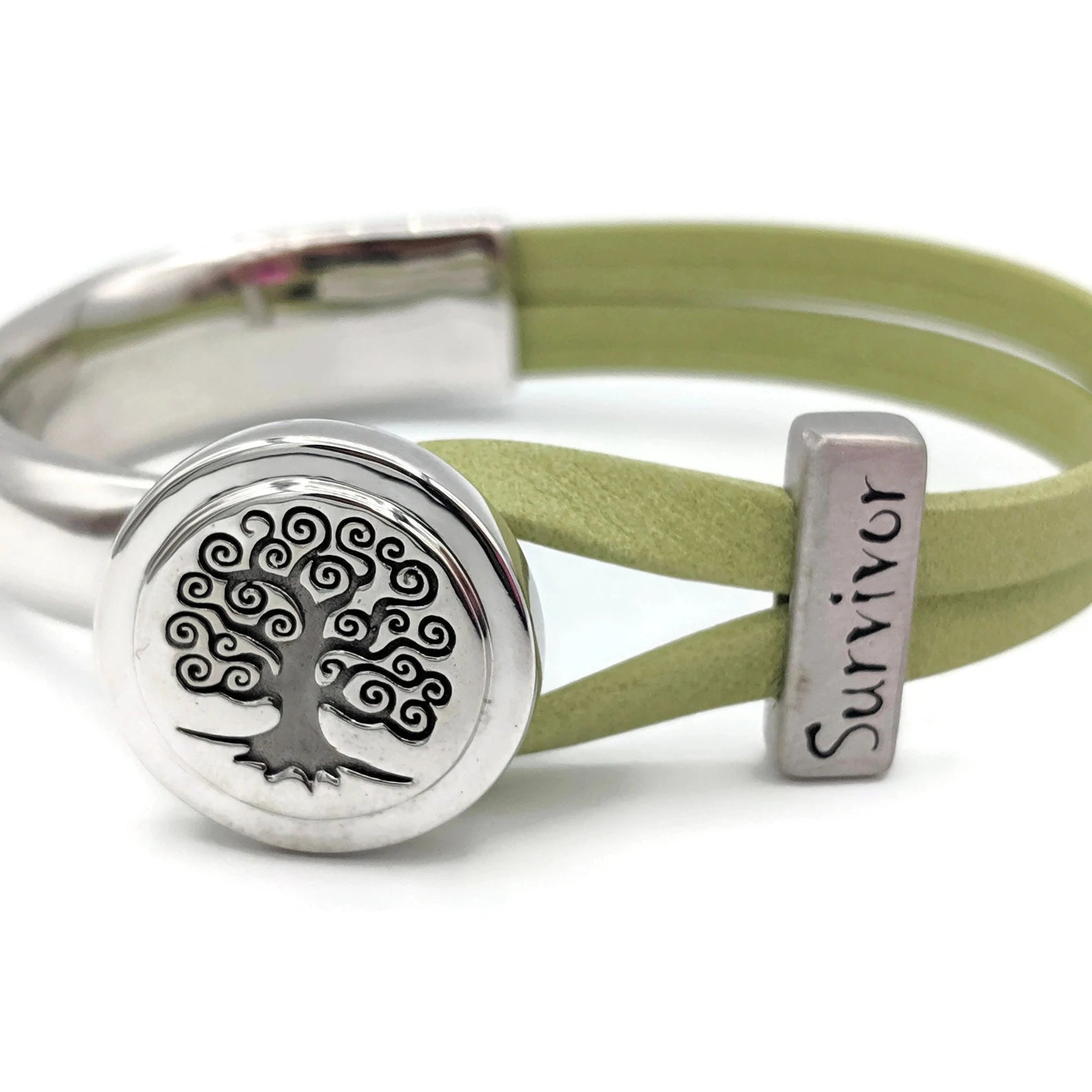 This is a handmade lime green survivor bracelet with a Tree of Life half cuff.