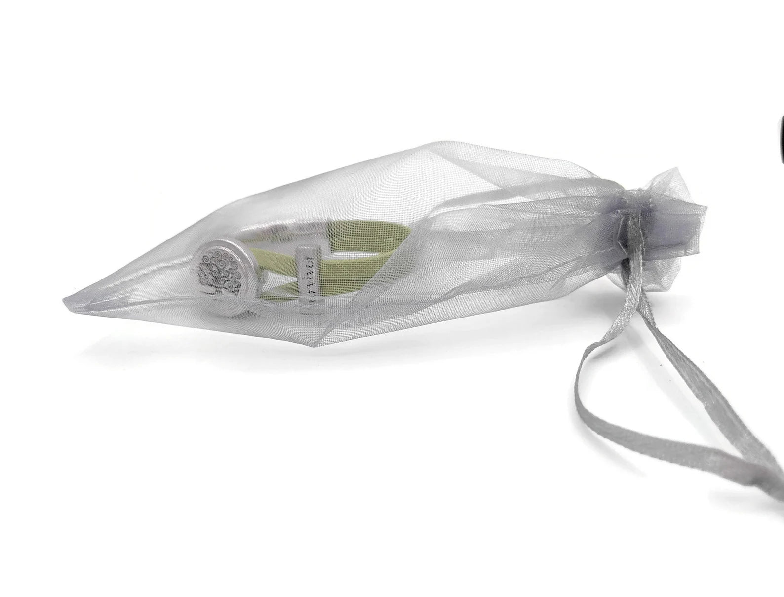 The loop in the leather is symbolic of a ribbon and the lime green leather is accented with a sterling silver survivor slider.