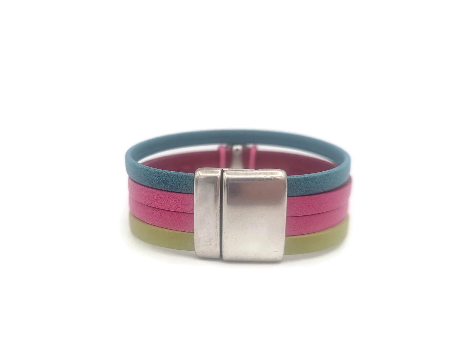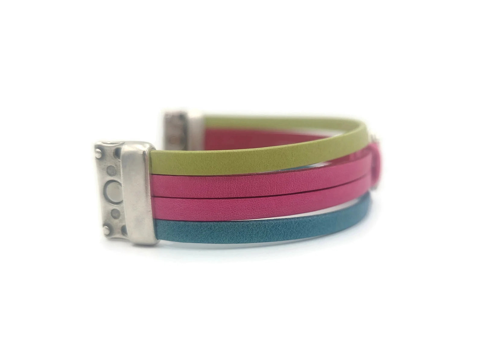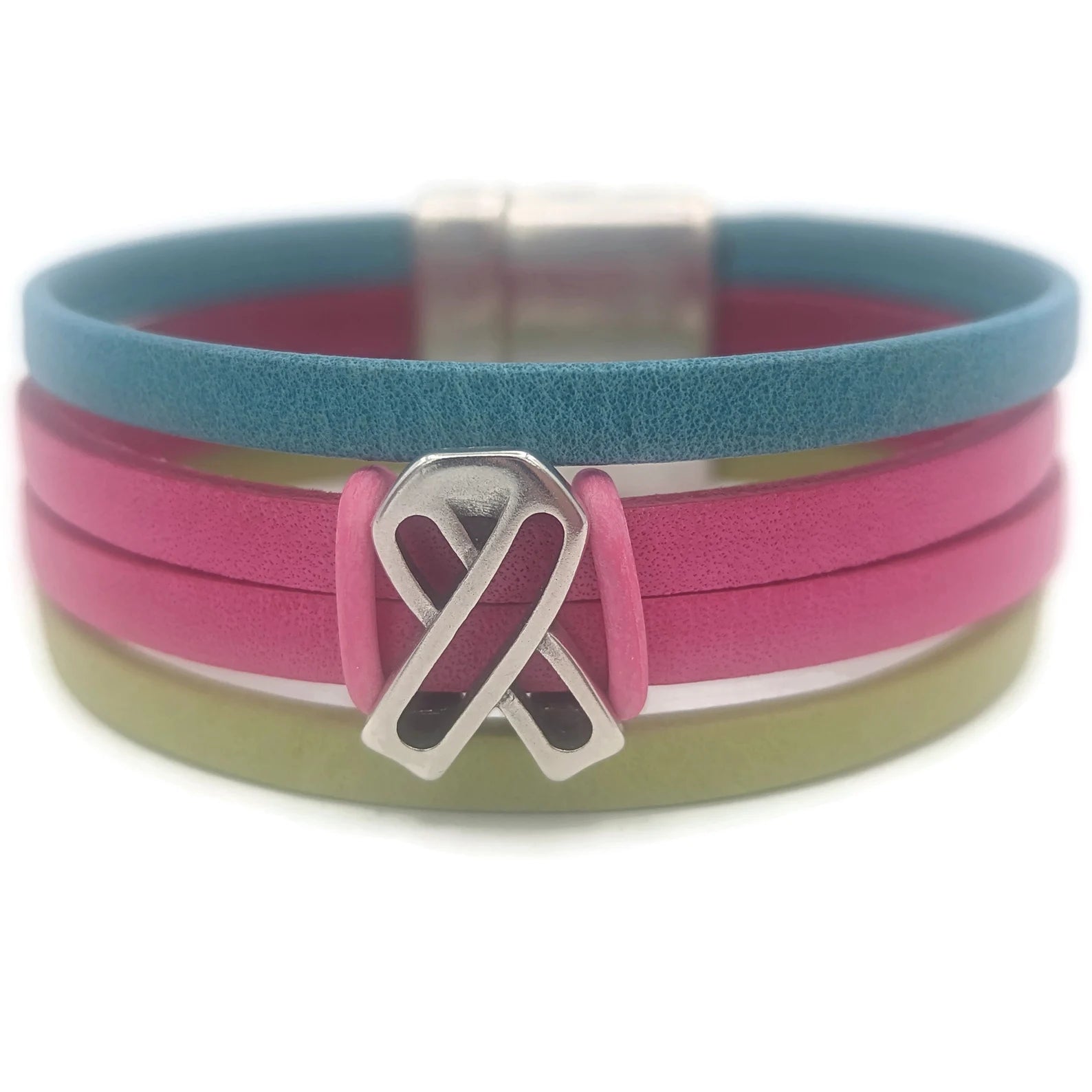 This is a 20 mm leather bracelet with a silver open awareness ribbon and a silver magnetic clasp. The bracelet consists of 4 strands of 5 mm leather and an open awareness ribbon displaying the hot pink leather. The leather colors are hot pink, teal, and lime green. Green represents the triumph of spring over winter, life over death, and symbolizes renewal, hope, and immorality while teal symbolizes healing and spirituality. The pink ribbon signifies that metastatic cancer originated in the breast. These three colors together represent metastatic breast cancer.