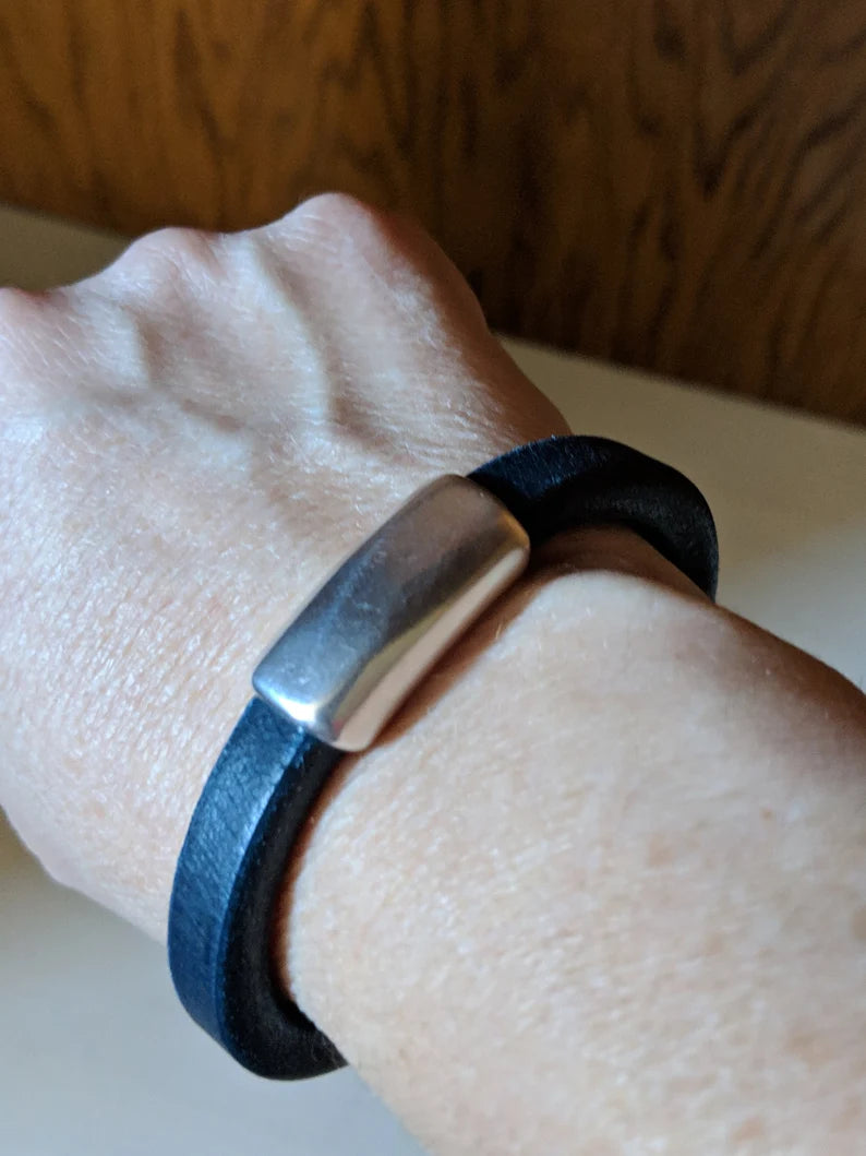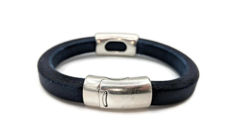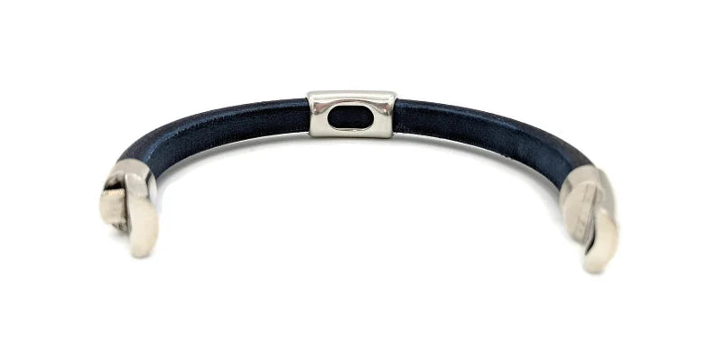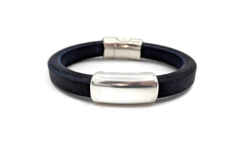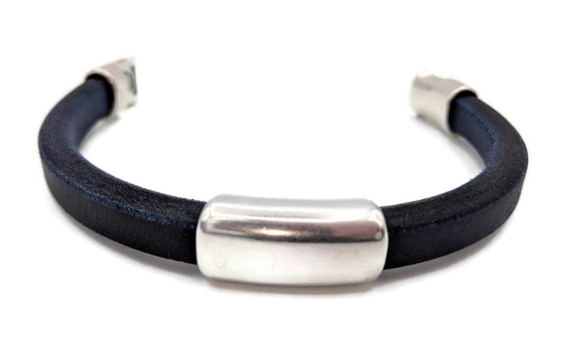 This is a beautiful handmade navy blue licorice leather bracelet with a silver long tube accent slider. It is a navy blue Regaliz leather. The bracelet has a silver magnetic clasp closure.