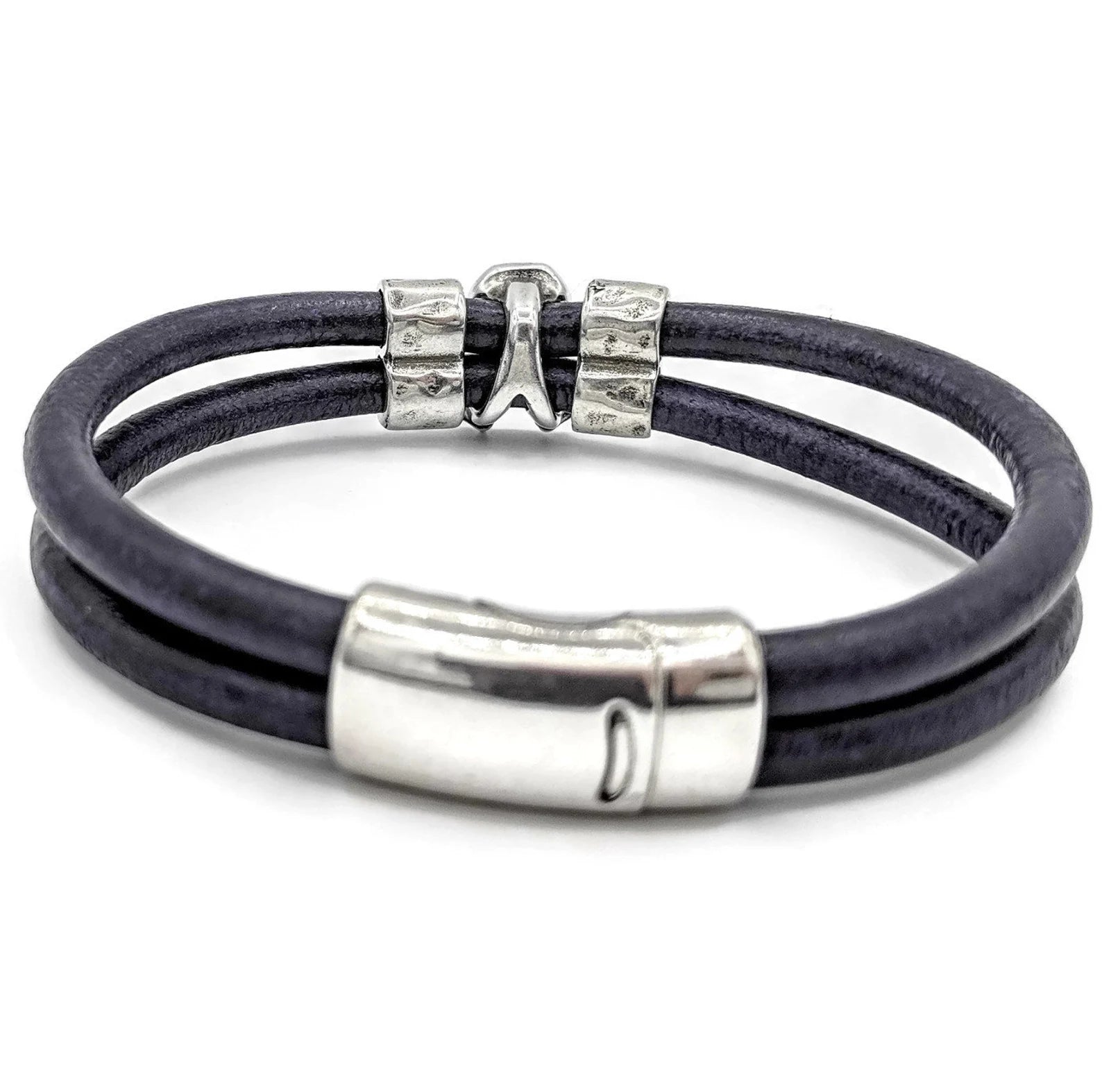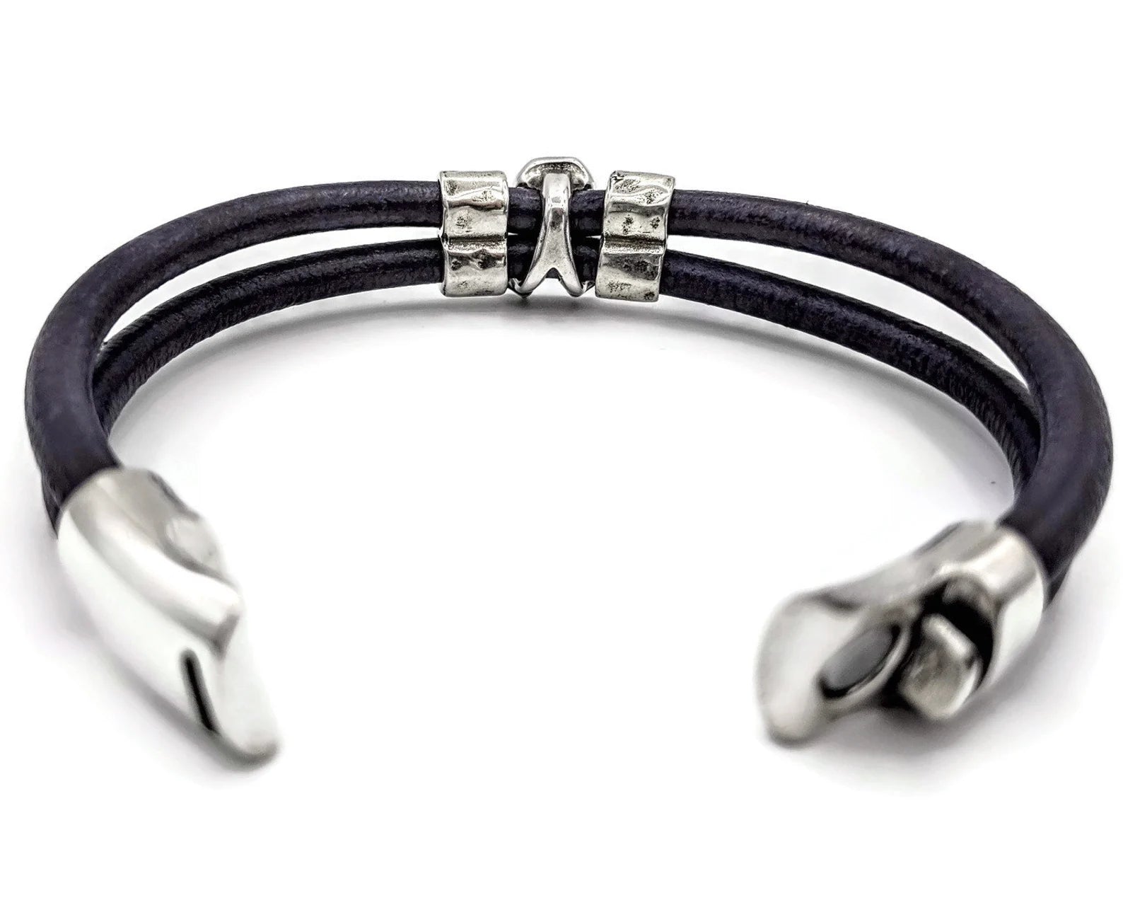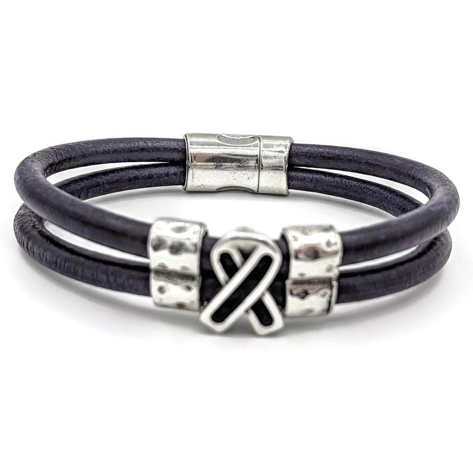 This is a beautiful handmade pancreatic cancer awareness bracelet or Alzheimer's awareness bracelet. It is a round dark purple leather. The bracelet has a silver magnetic clasp closure and a silver open awareness ribbon accented with a hammered silver slider on each side.