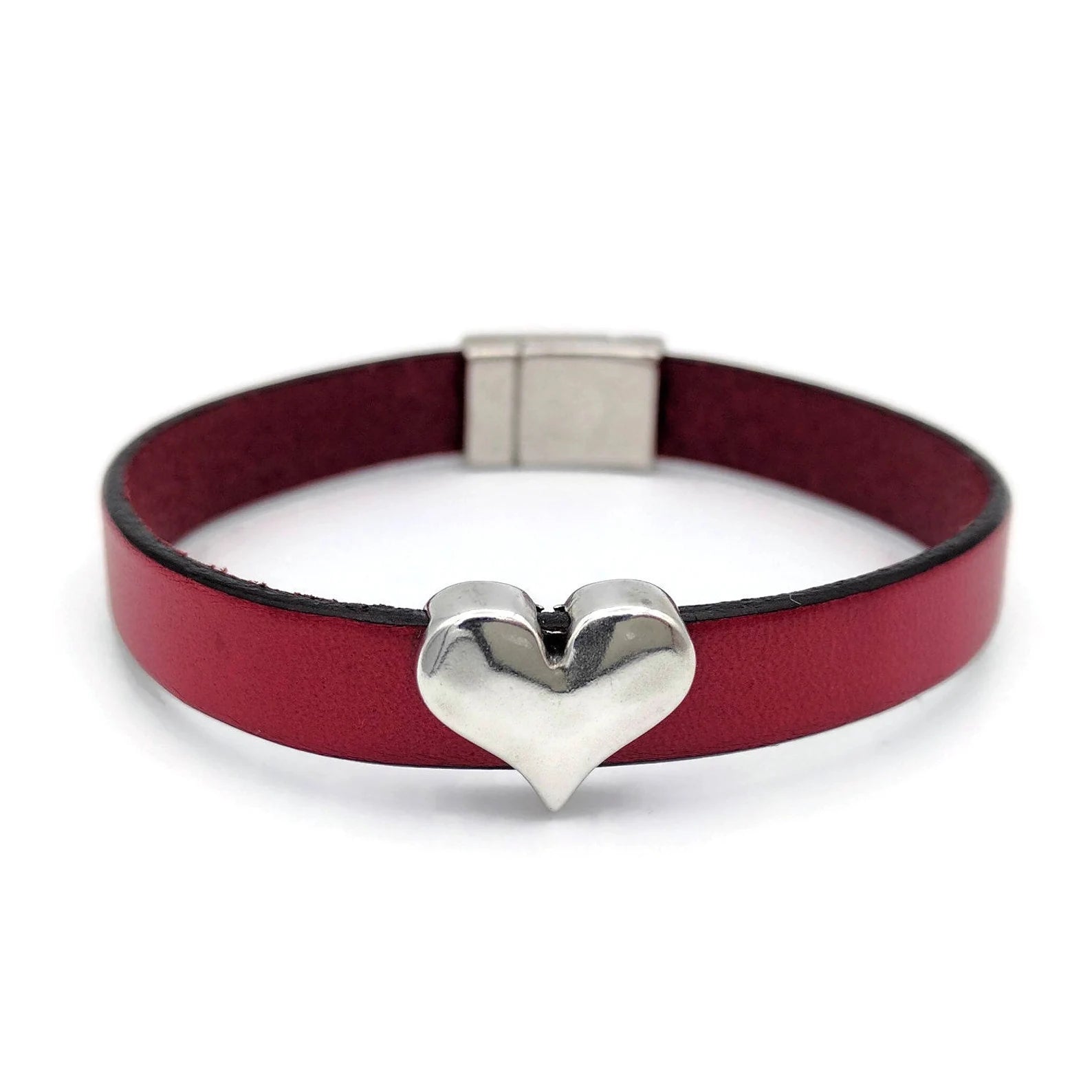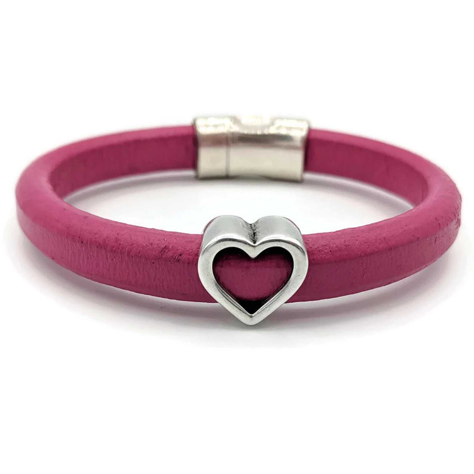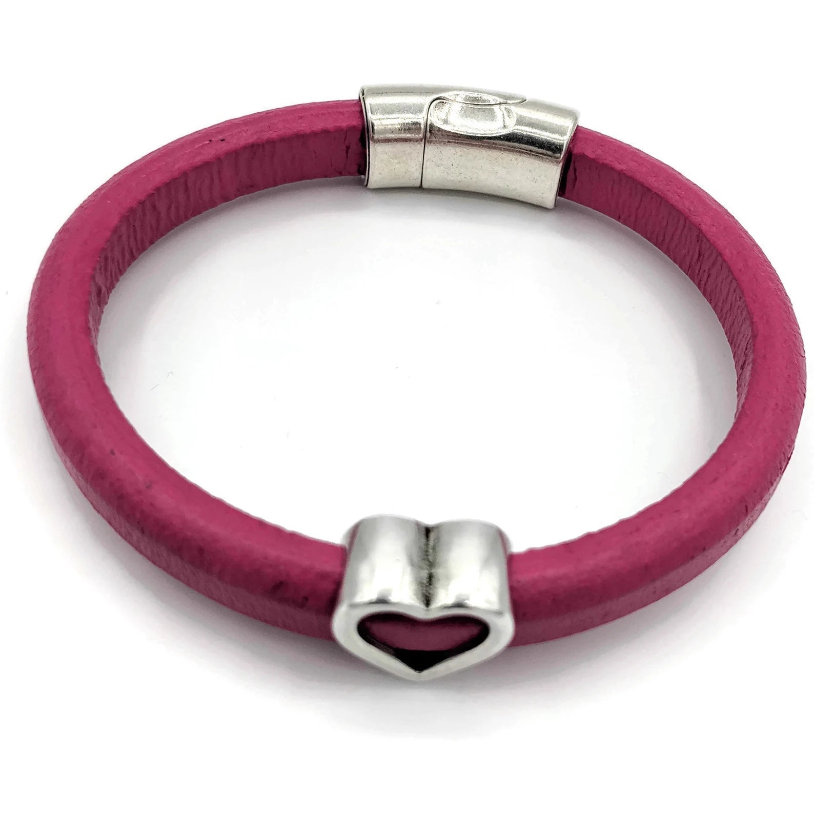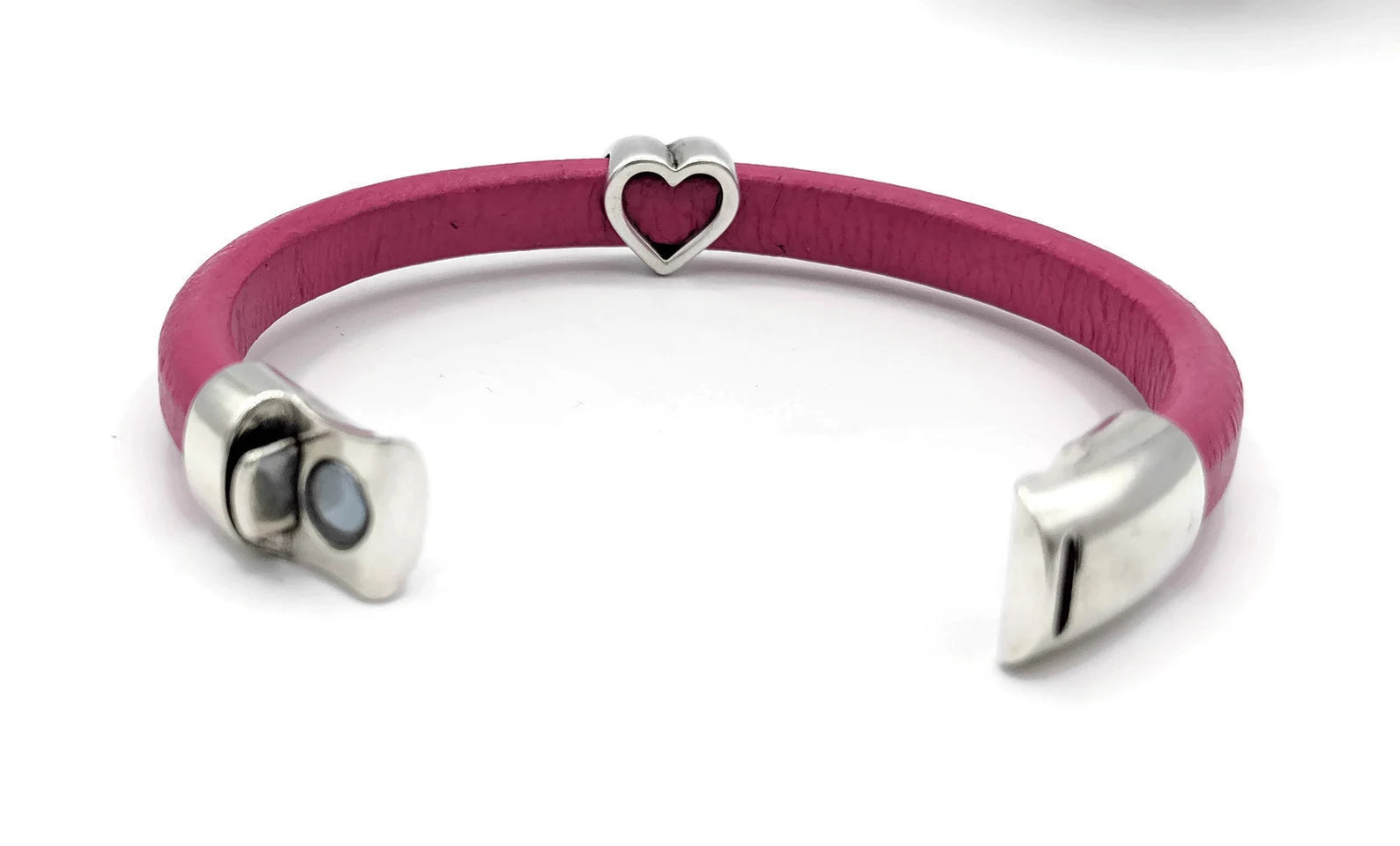 This is a beautiful handmade heart bracelet. It is a hot pink Regaliz licorice leather. The bracelet has a Regaliz magnetic clasp closure and an open heart slider.