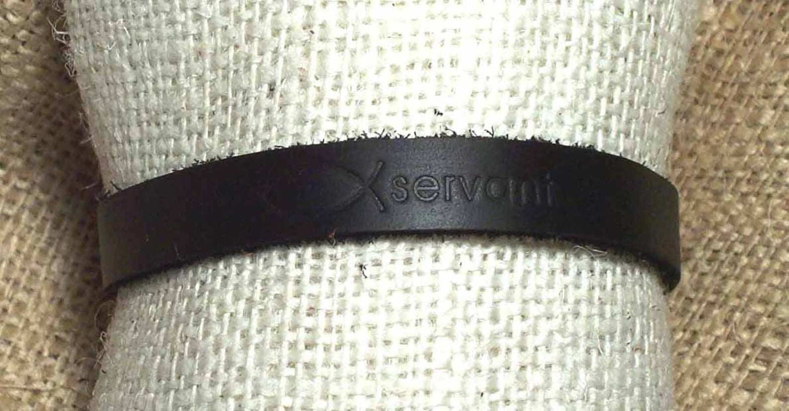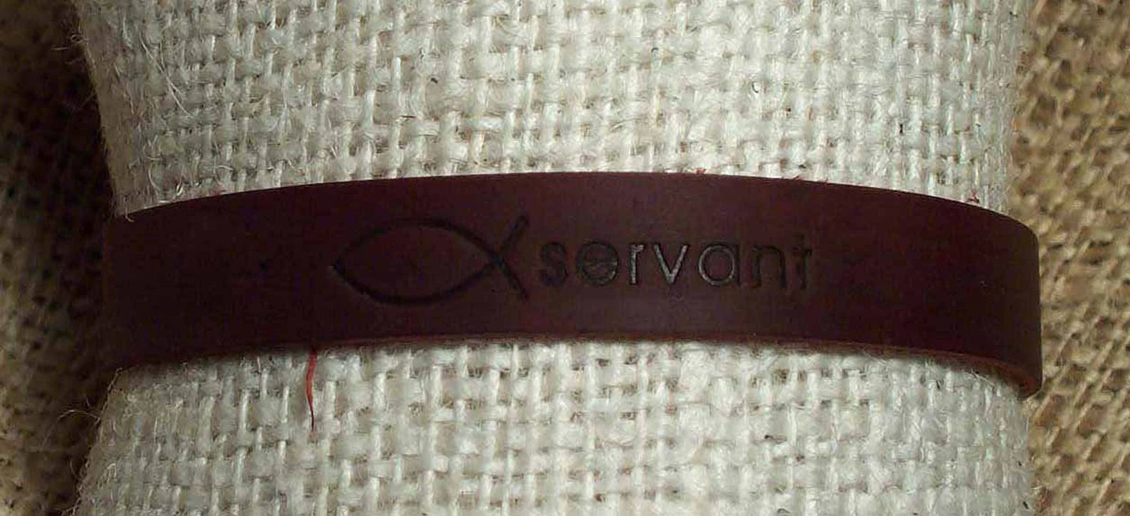 Handmade, all natural, 100% leather bracelets branded with an ichthus and the word servant. Unisex. Available in black or brown leather.