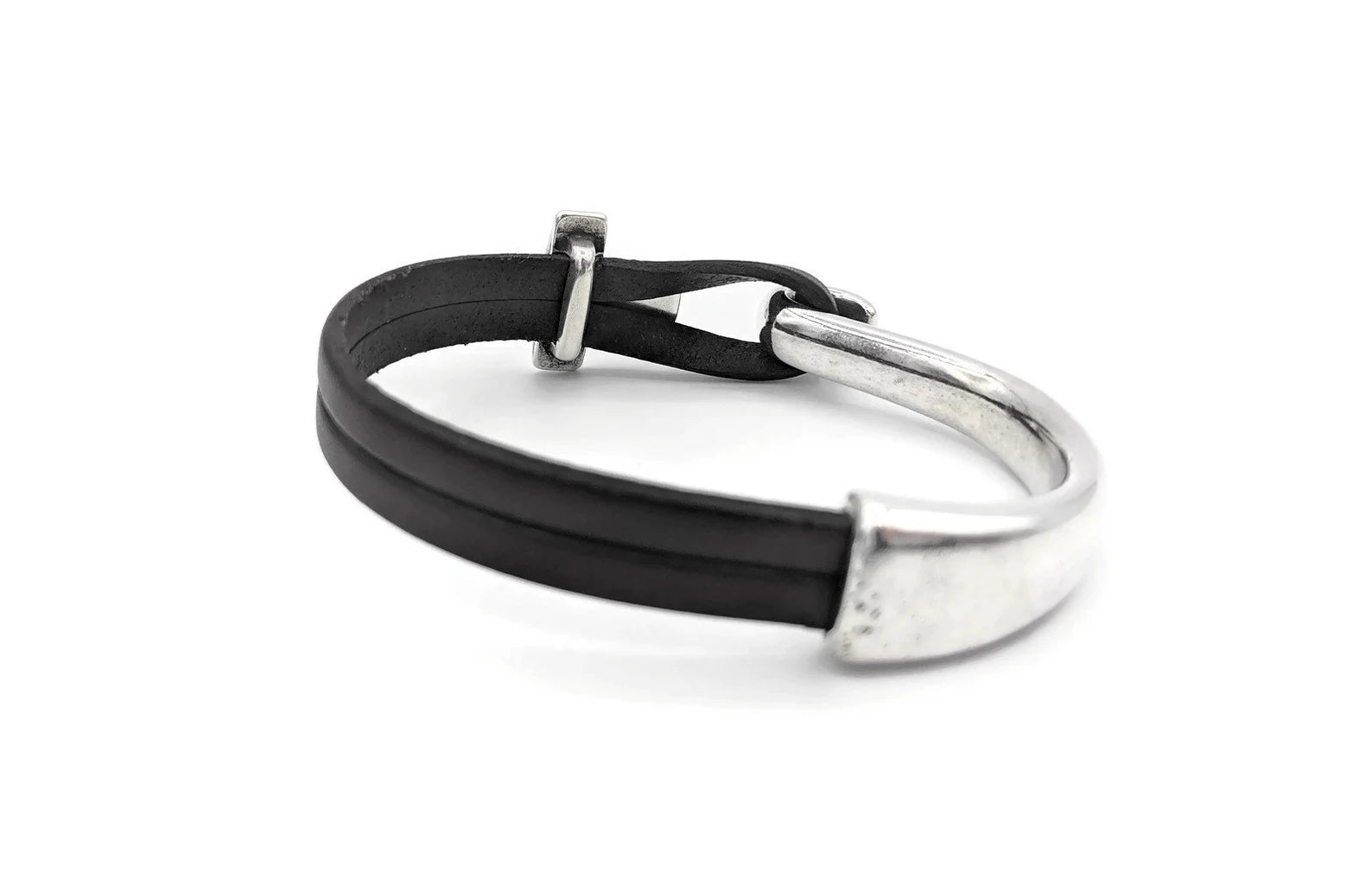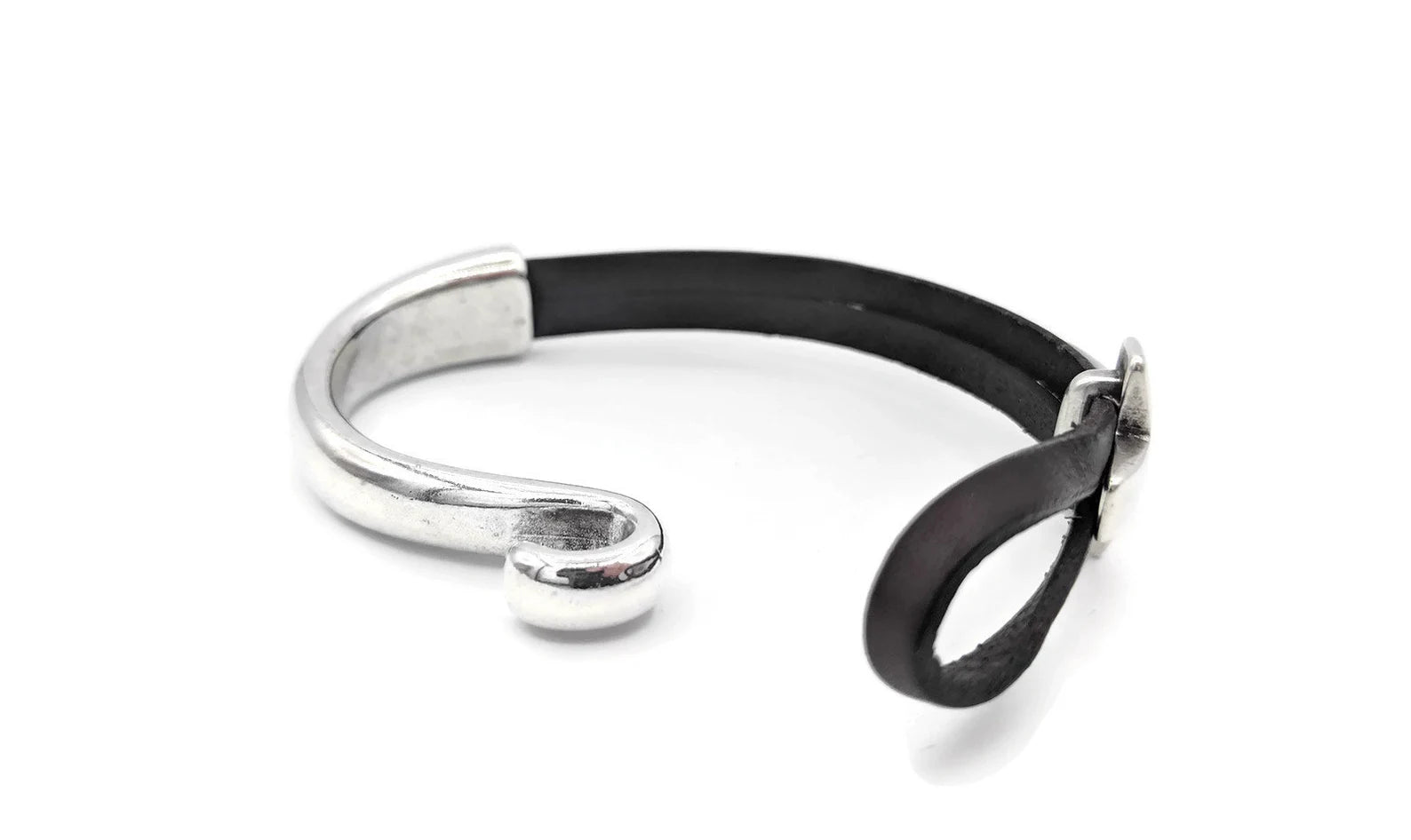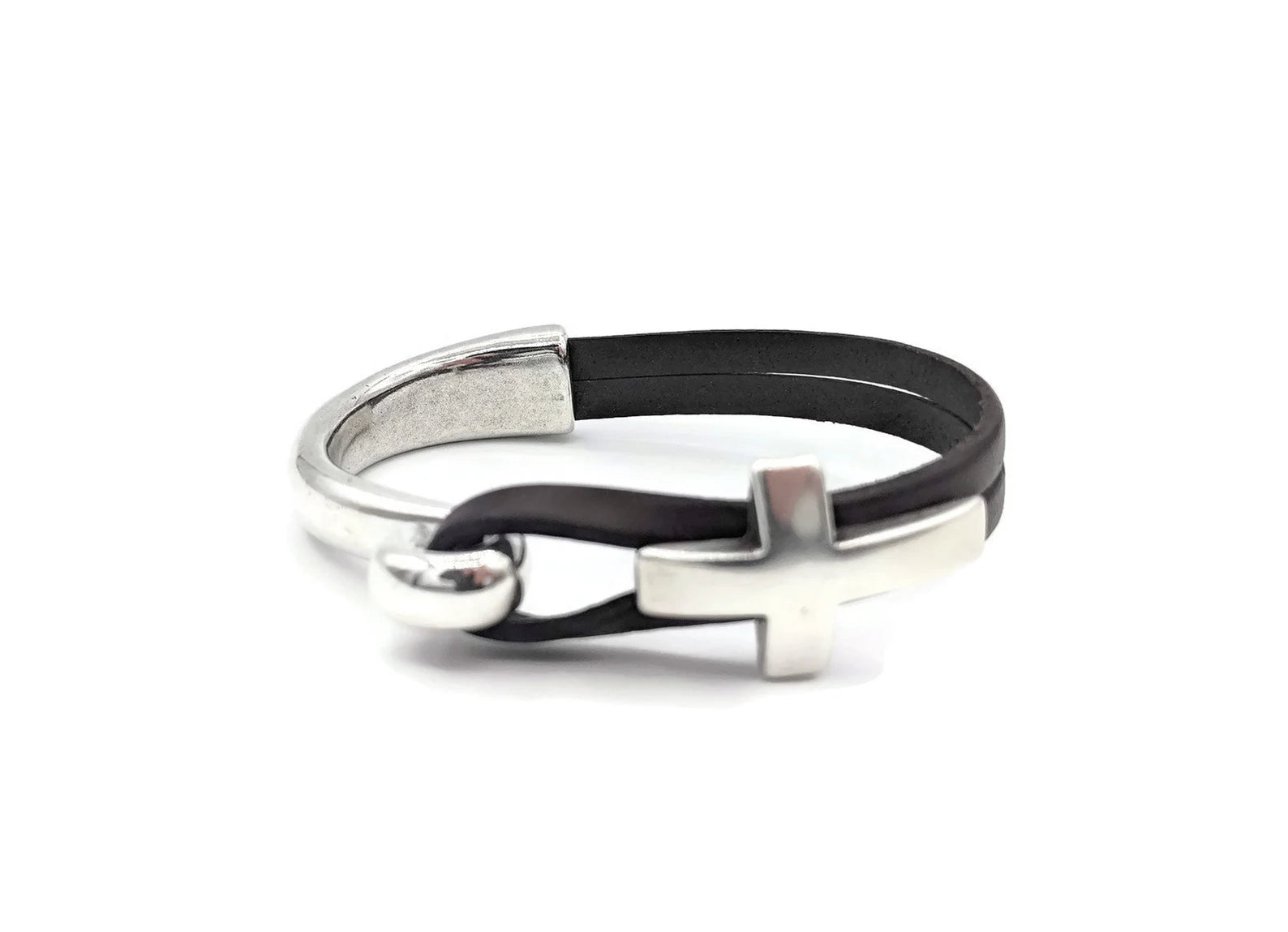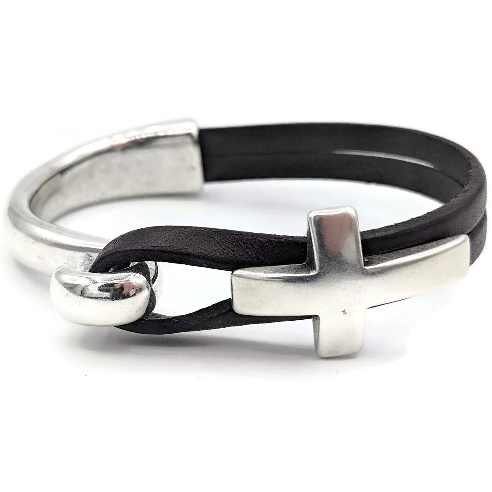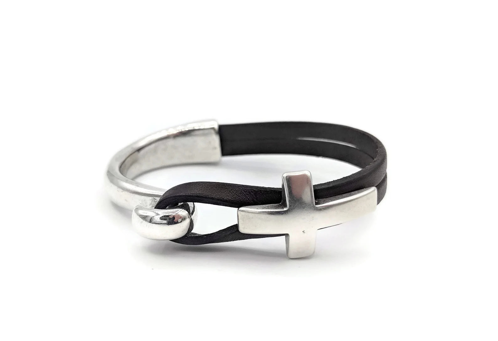 This is a handmade half cuff bracelet with a silver cross and flat leather. The hook half cuff is zinc plated with 99.9% sterling silver. It is free of lead, nickel and cadmium. Hypoallergenic.