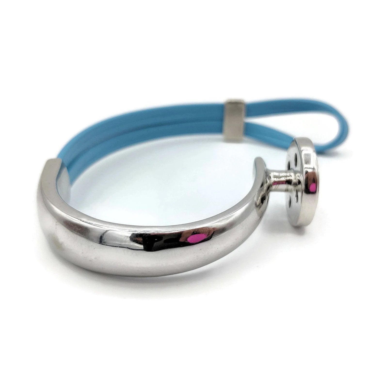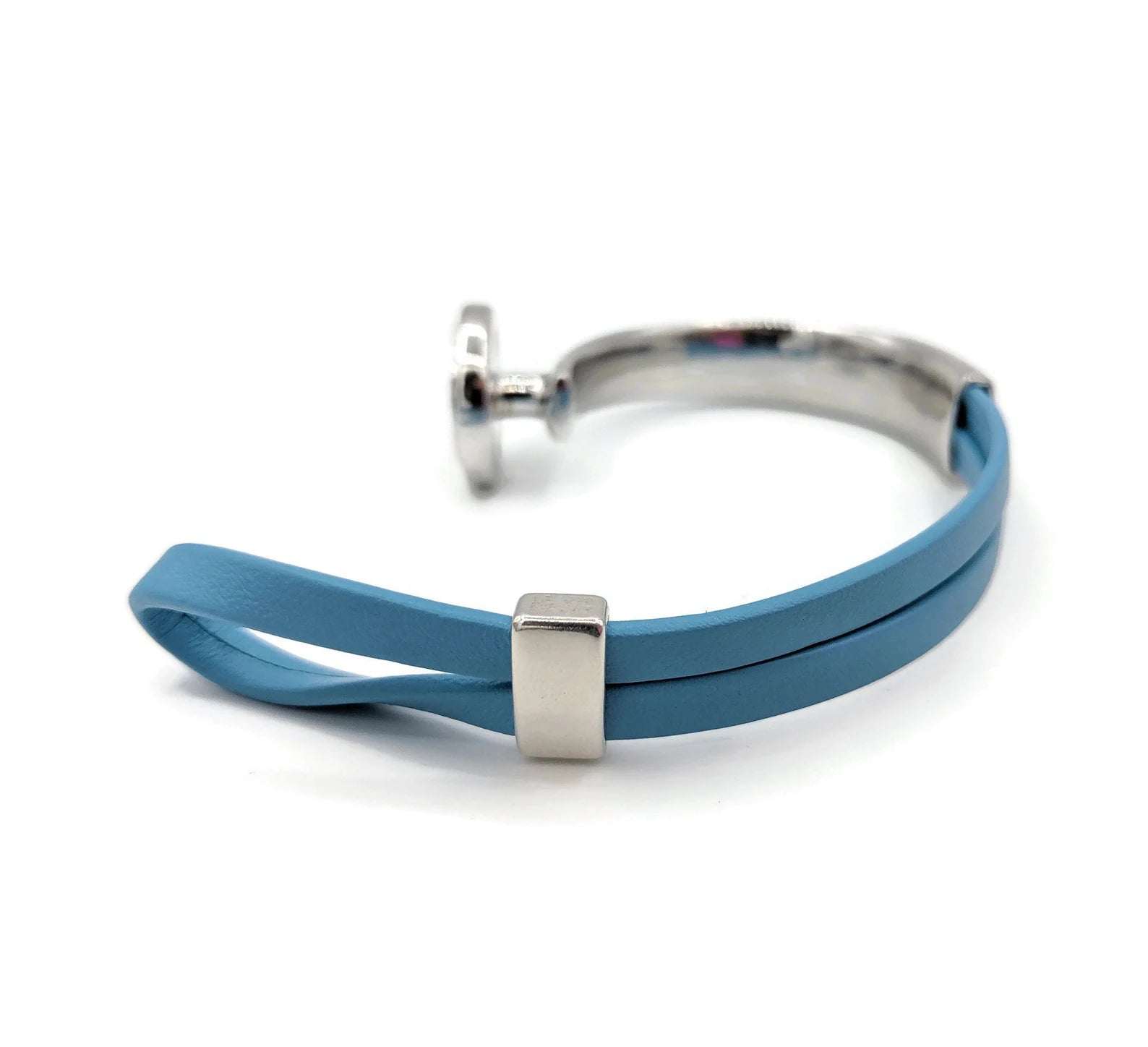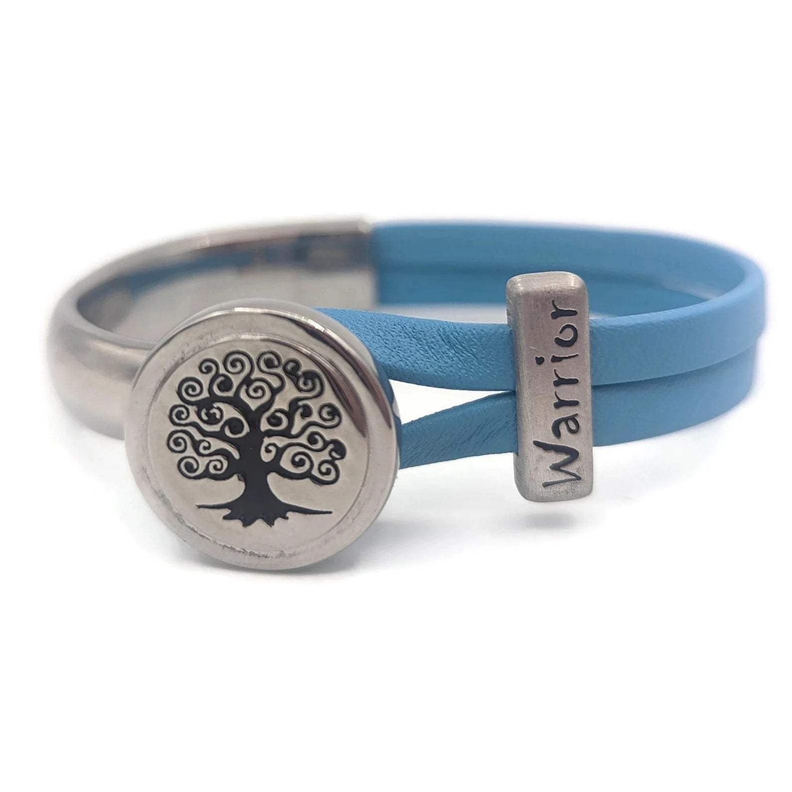 This is a Tree of Life half cuff and leather bracelet. The light blue leather is accented with a plain silver slider.