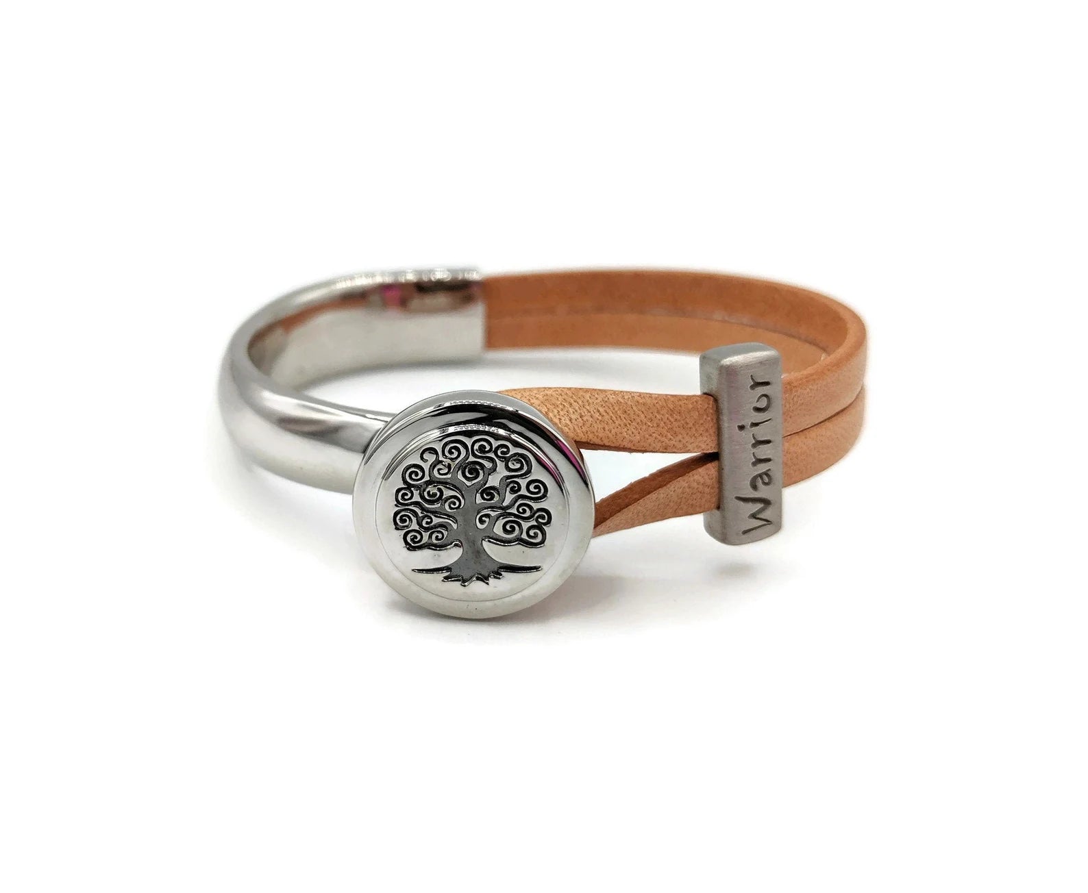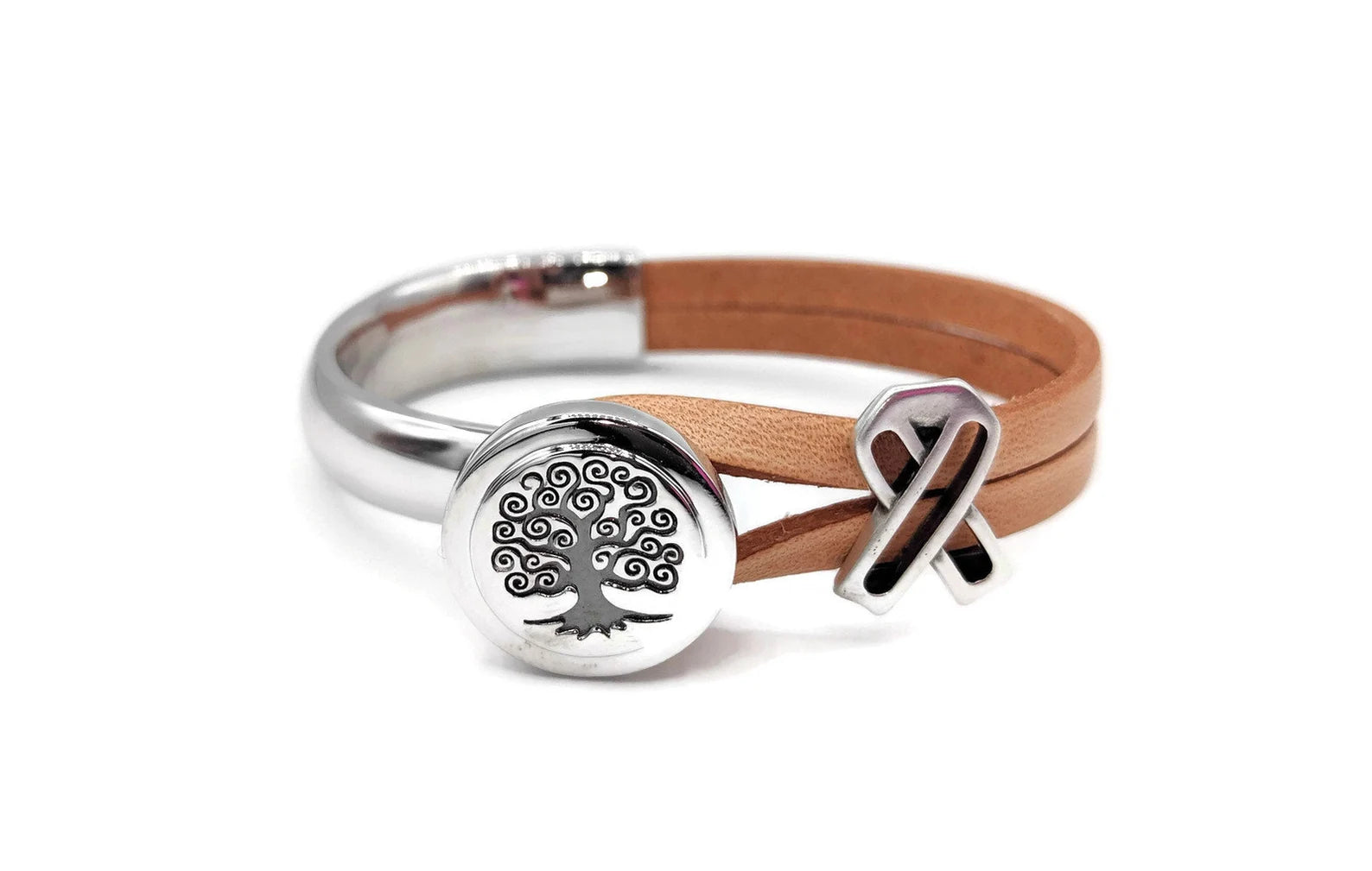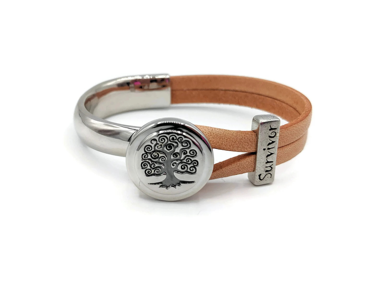 This is a handmade uterine cancer survivor bracelet. I wanted something different than the typical uterine ribbon bracelets that I've seen. The peach leather represents uterine cancer, the loop in the leather that you see around the Tree of Life is symbolic of a ribbon. The Tree of Life goes along with the survivor slider.