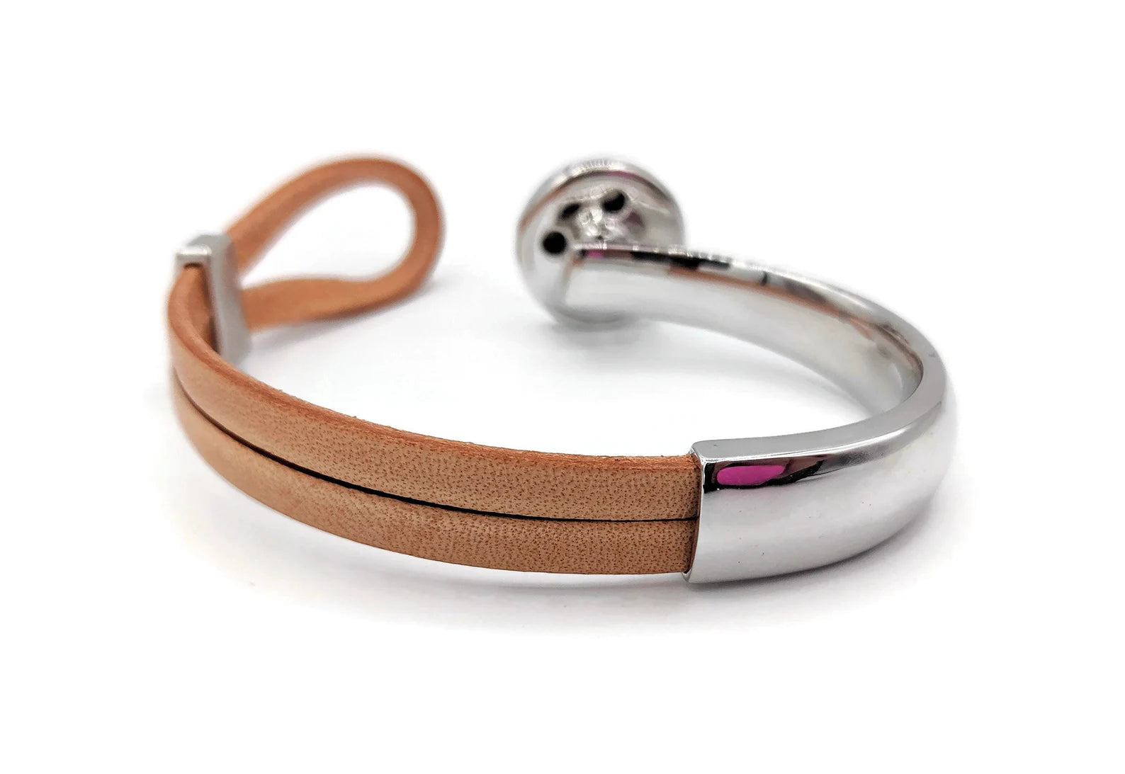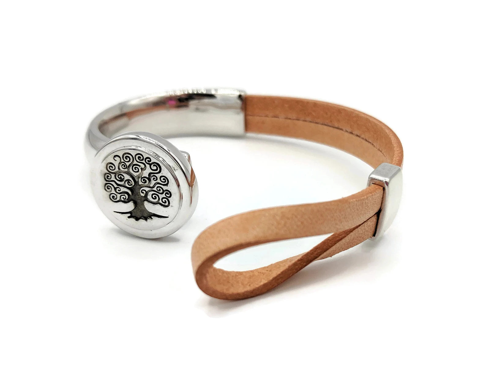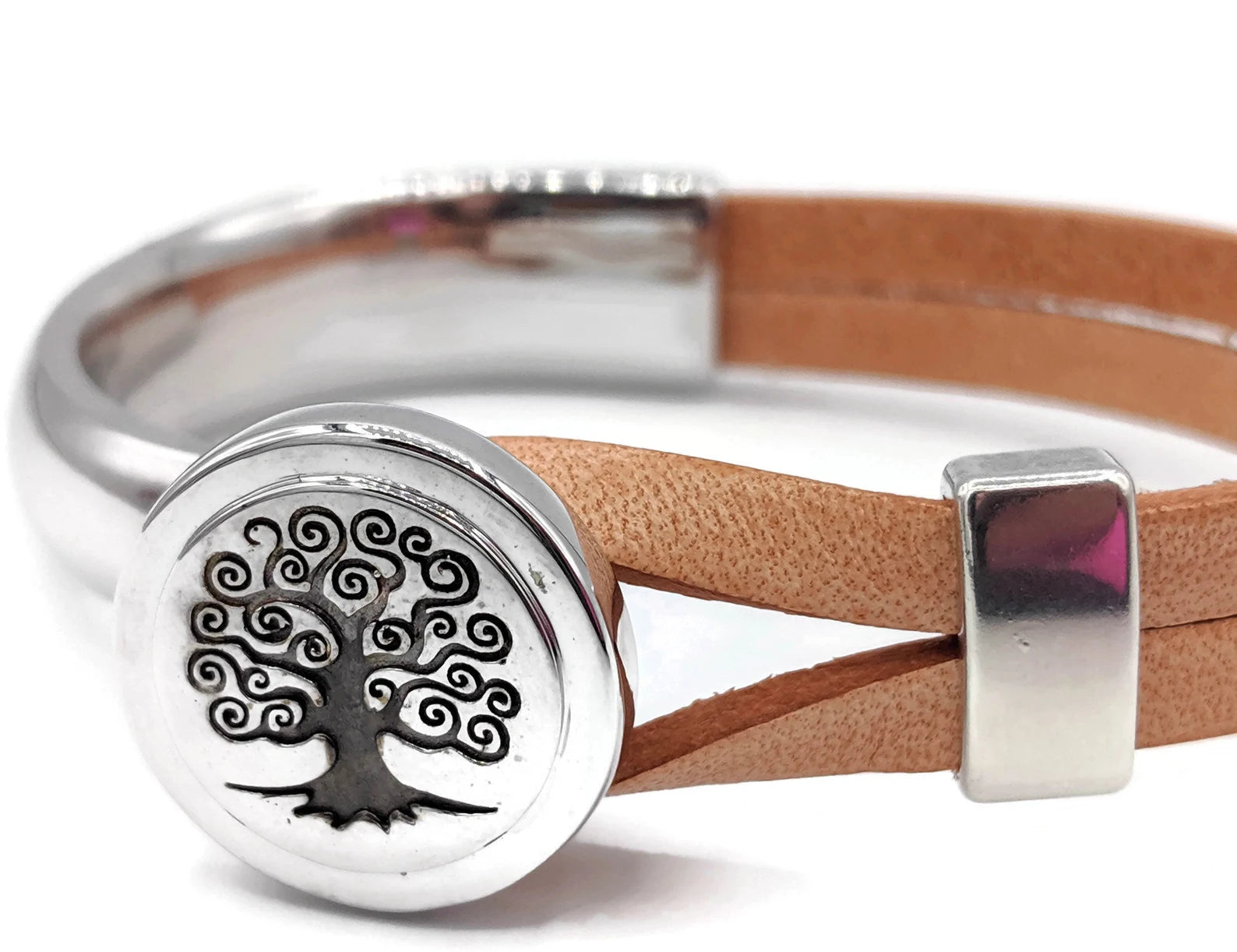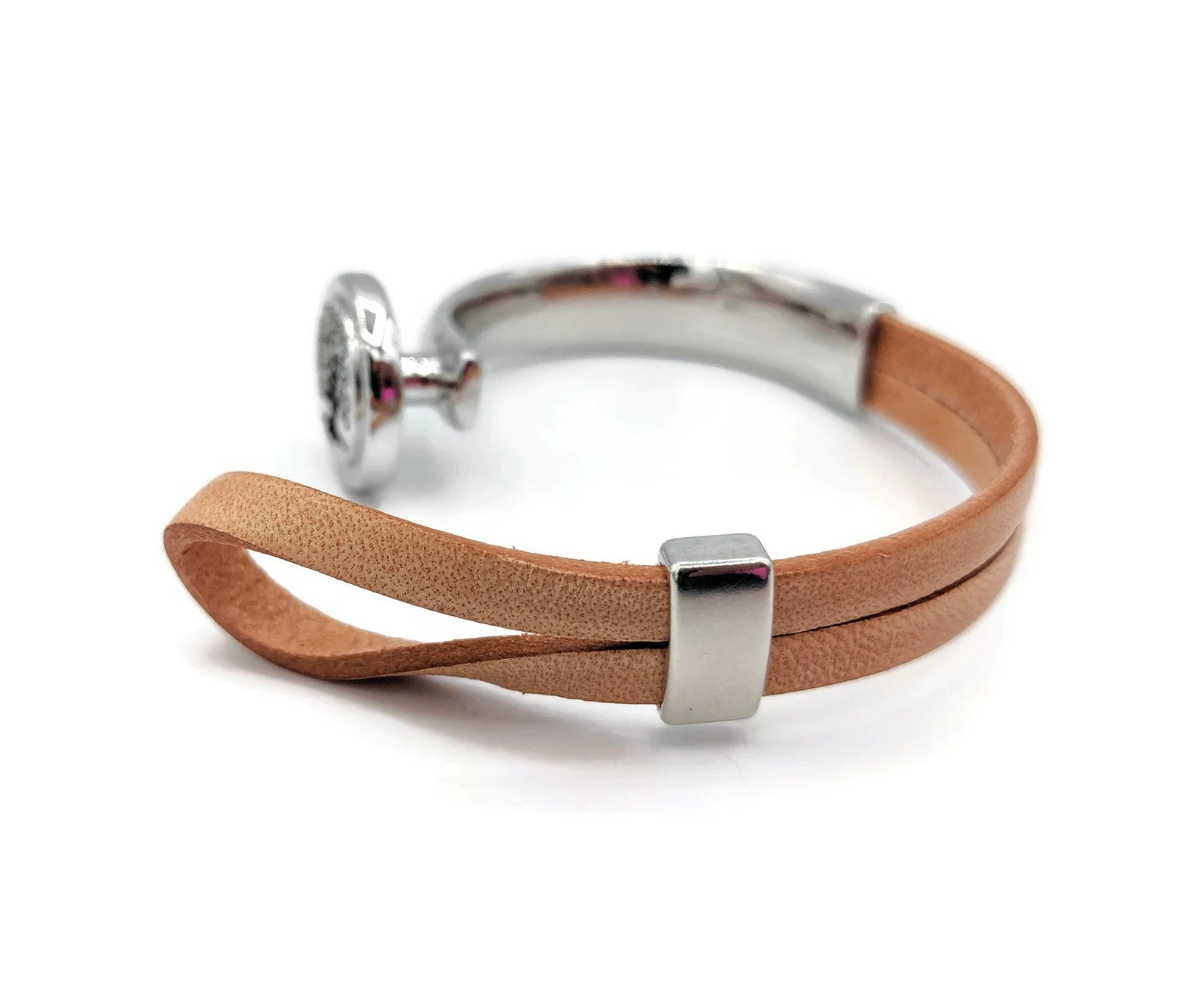 This is a handmade uterine cancer survivor bracelet. I wanted something different than the typical uterine ribbon bracelets that I've seen. The peach leather represents uterine cancer, the loop in the leather that you see around the Tree of Life is symbolic of a ribbon. The Tree of Life goes along with the survivor slider.