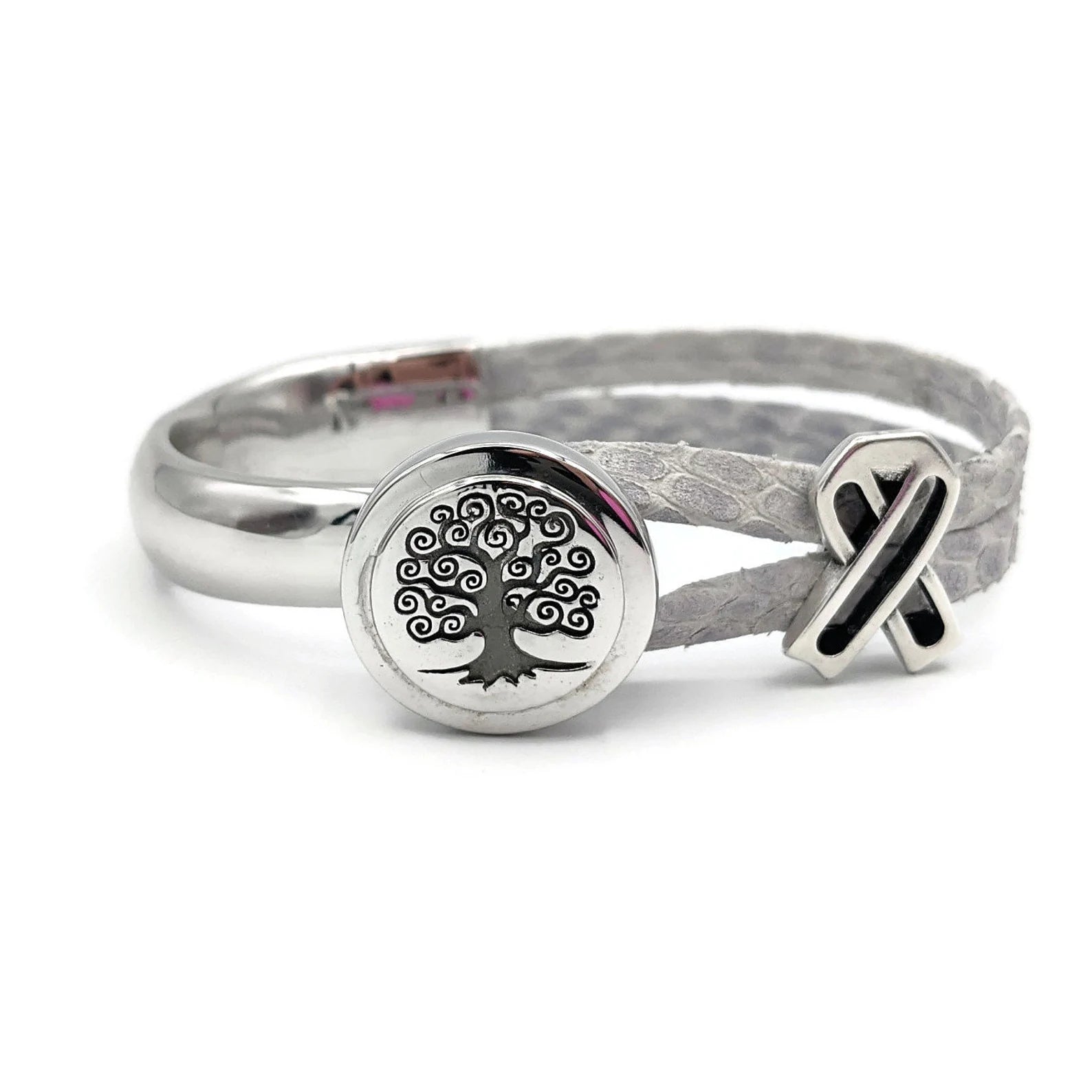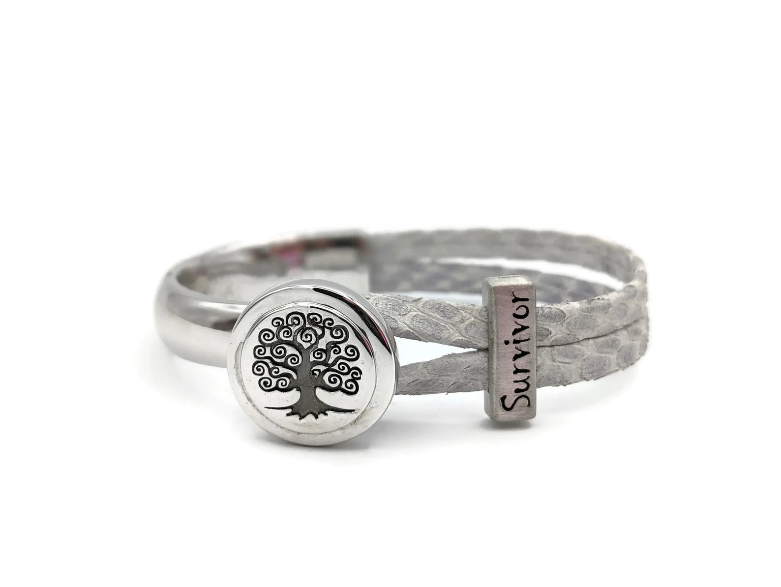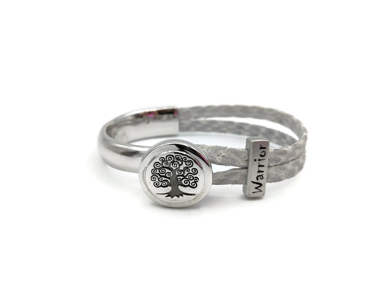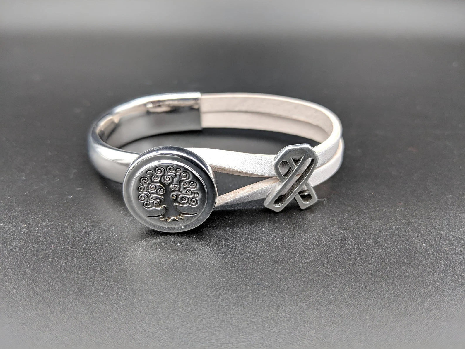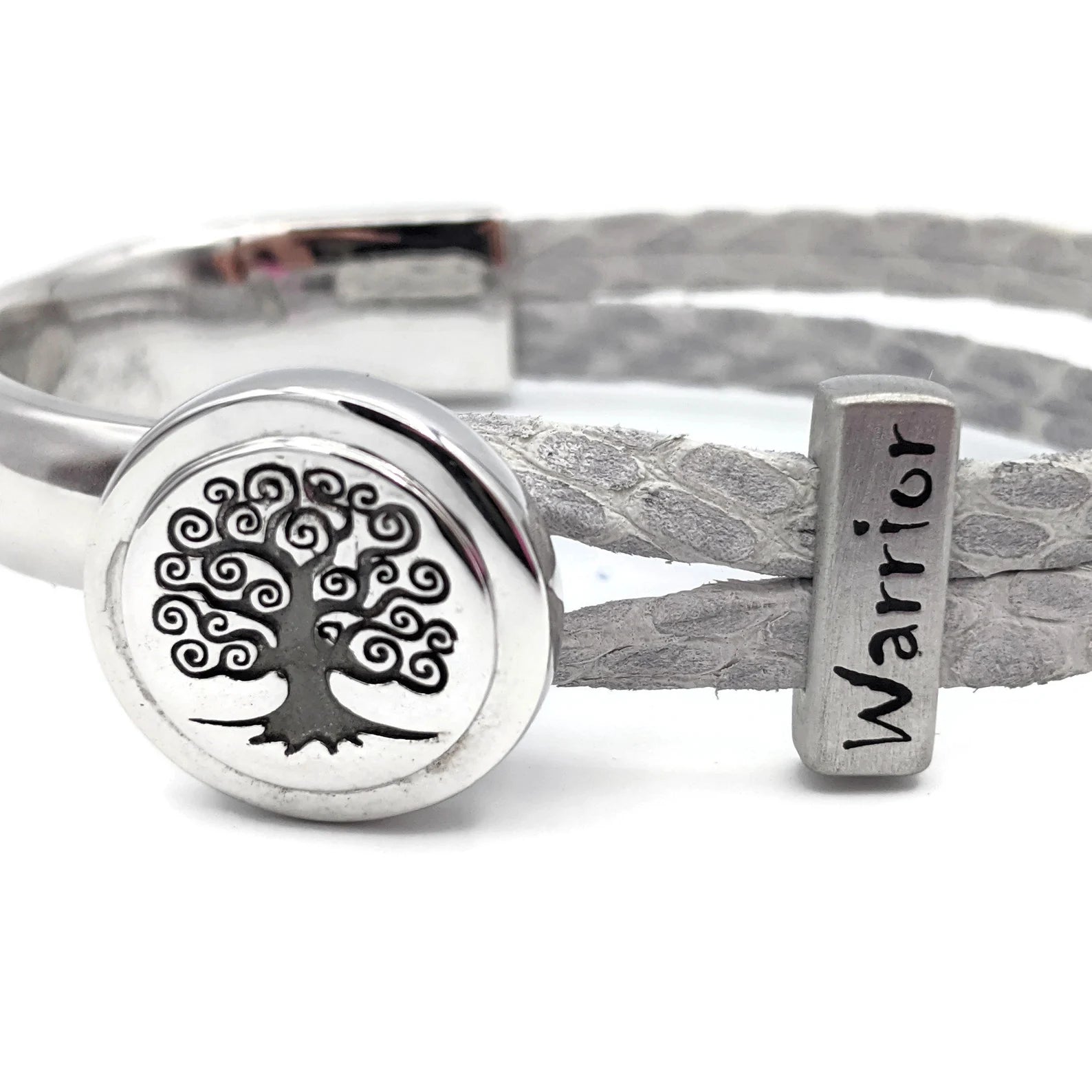 This is a handmade lung cancer warrior bracelet. The white snakeskin leather represents lung cancer, the loop in the leather that you see around the Tree of Life is symbolic of a ribbon. The bracelet is accented with a sterling silver warrior slider.