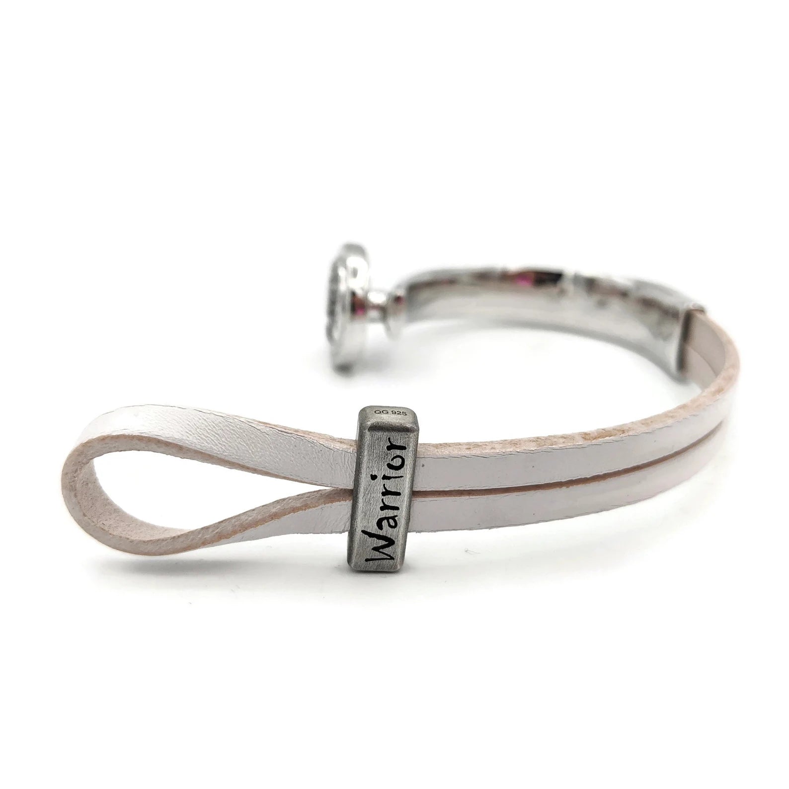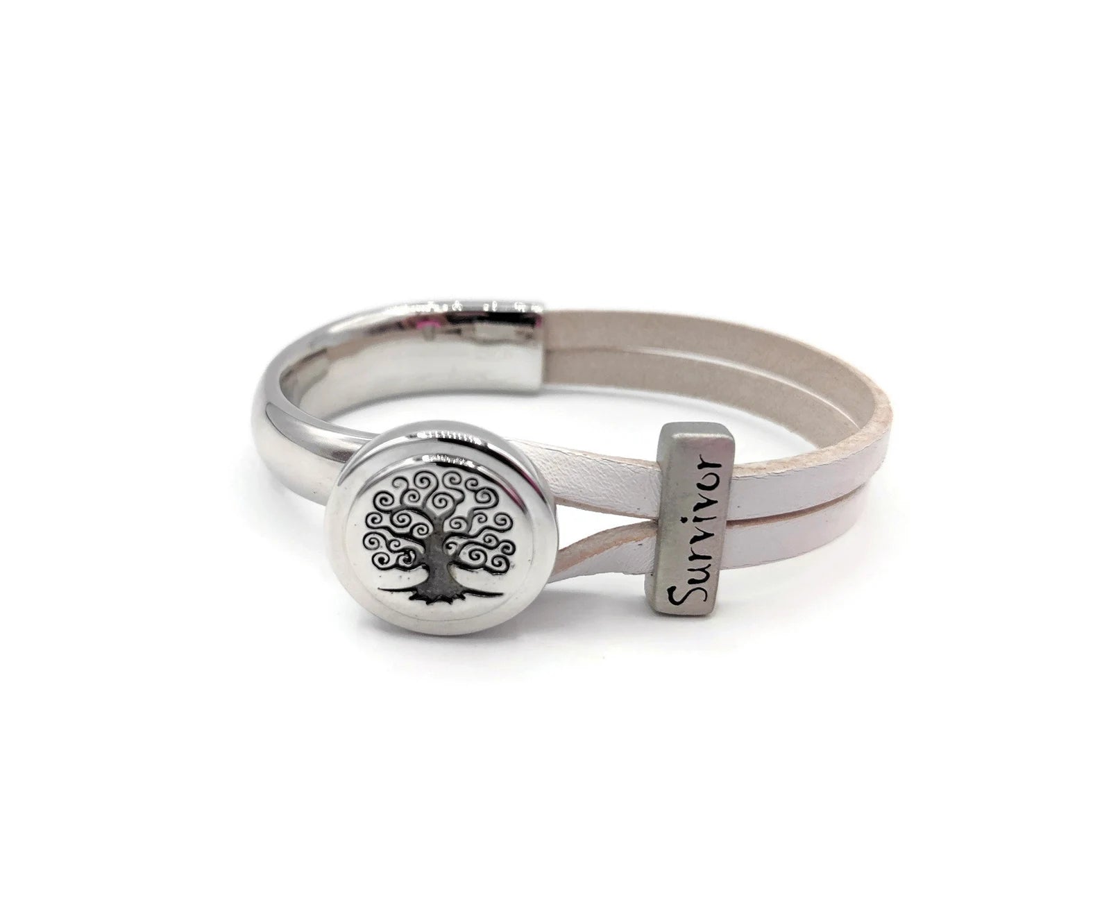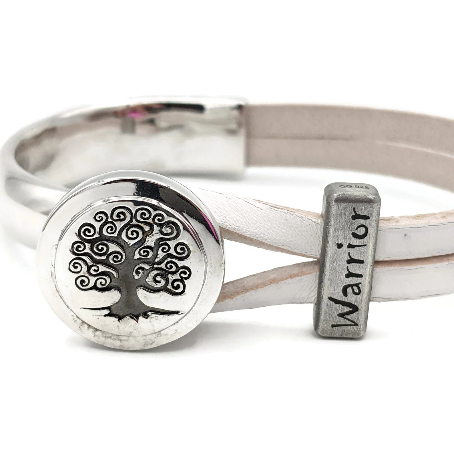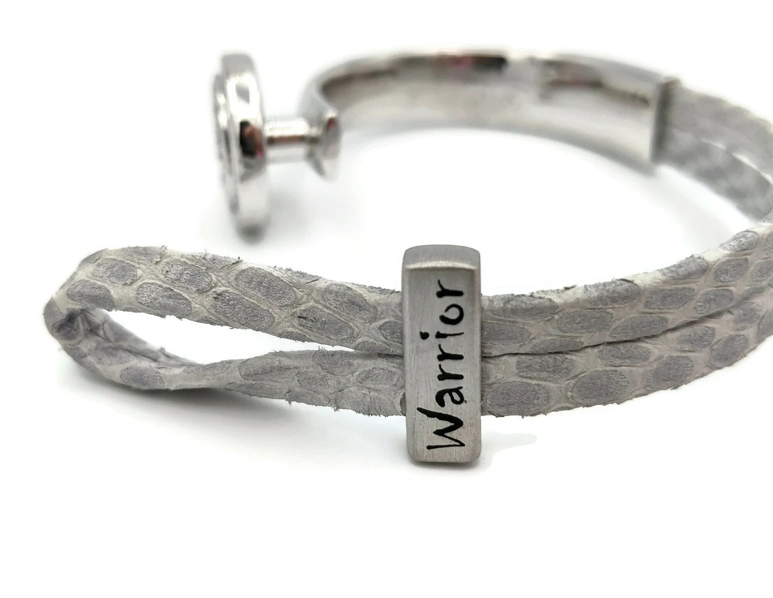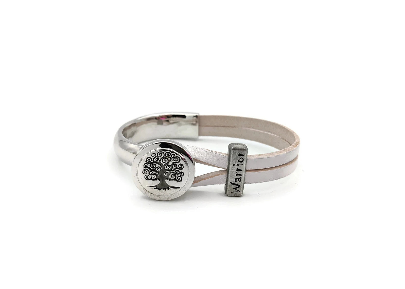 This is a handmade lung cancer warrior bracelet. The white snakeskin leather represents lung cancer, the loop in the leather that you see around the Tree of Life is symbolic of a ribbon. The bracelet is accented with a sterling silver warrior slider.