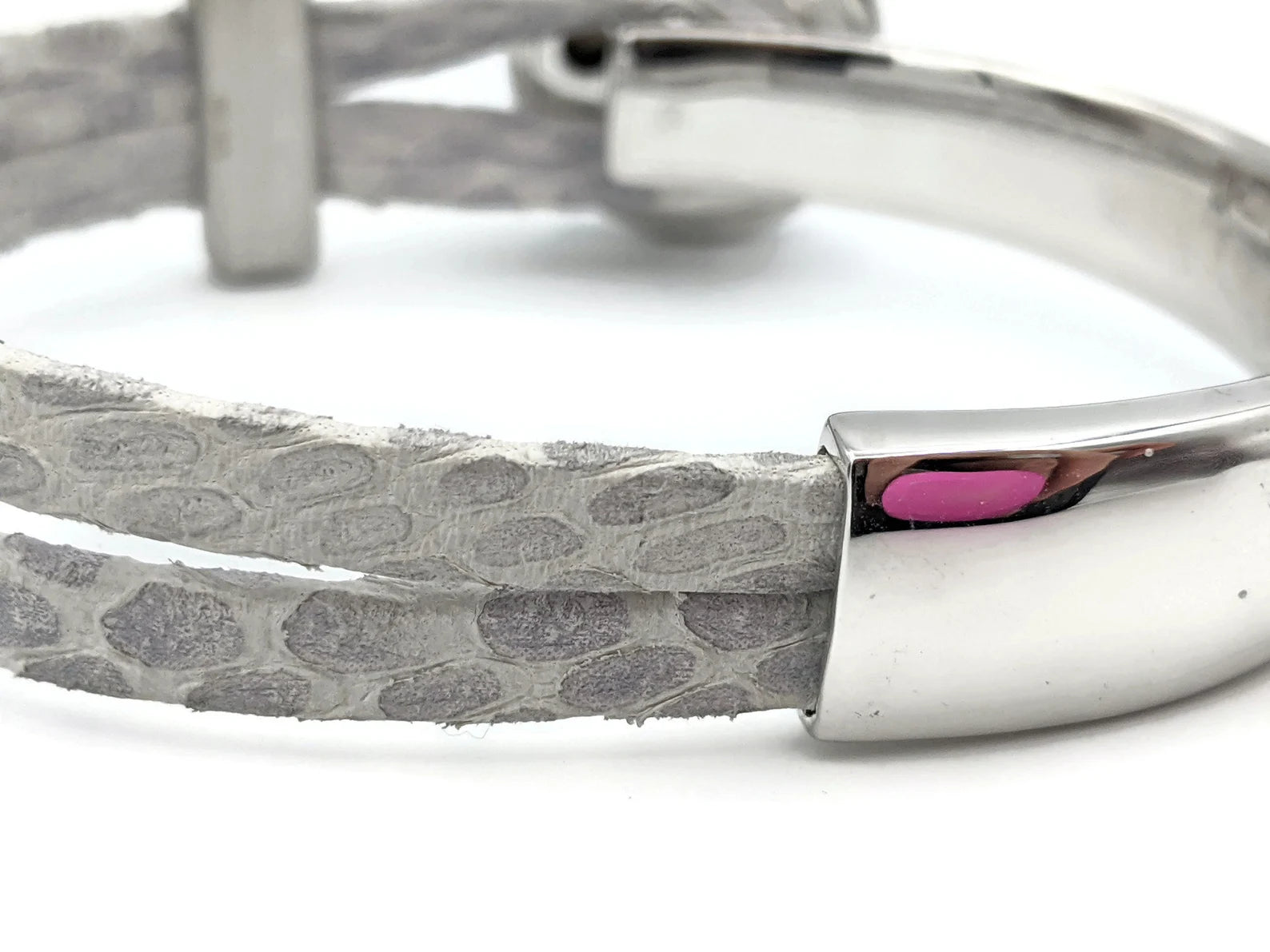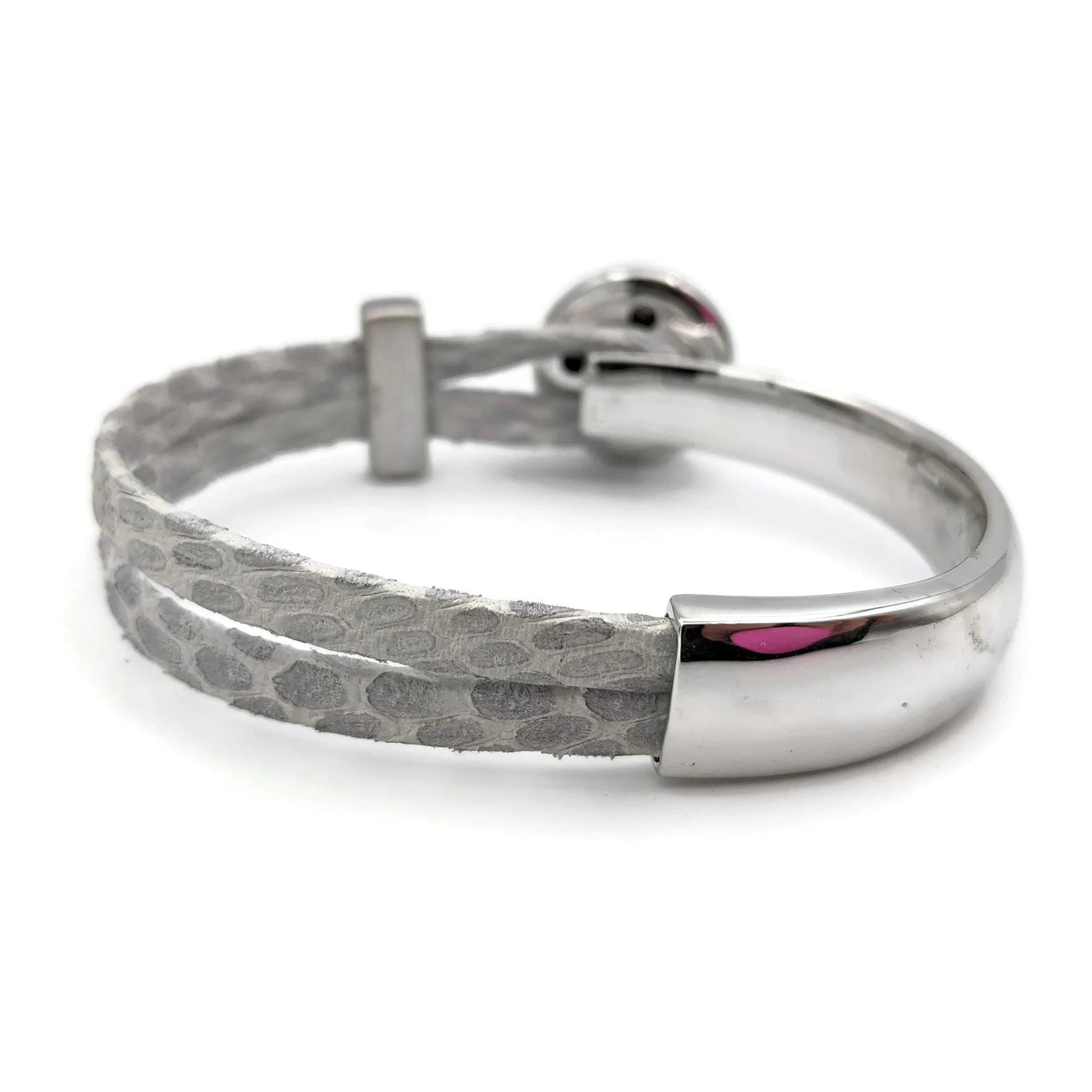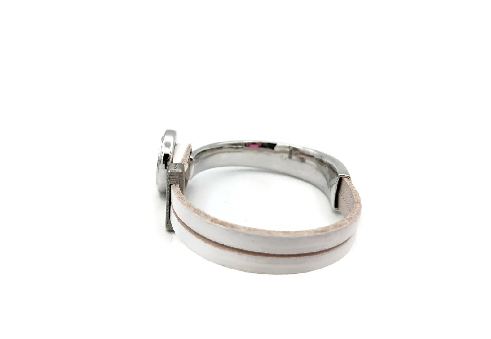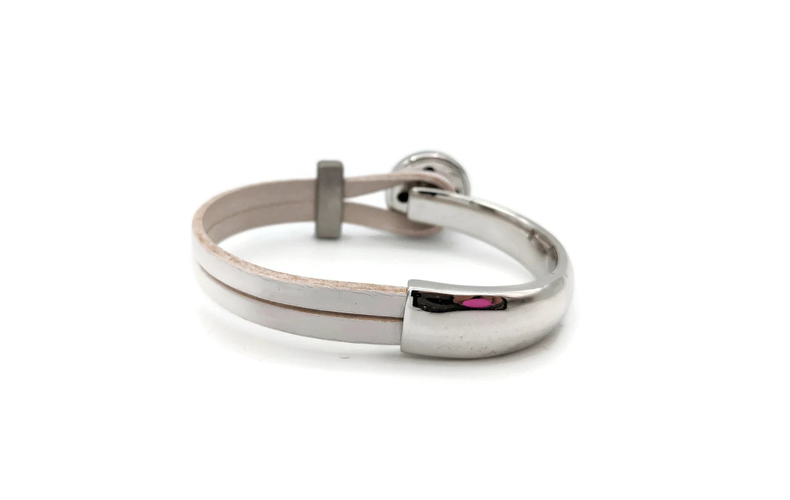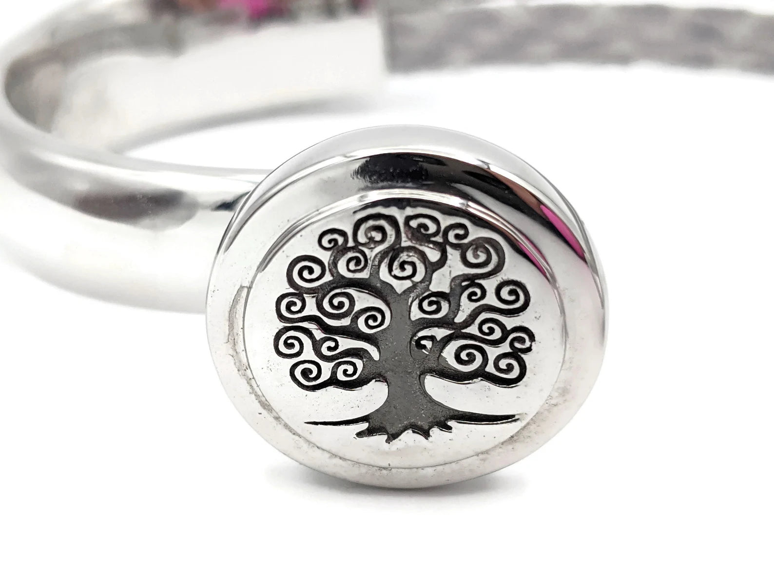 This is a handmade lung cancer warrior bracelet. The white snakeskin leather represents lung cancer, the loop in the leather that you see around the Tree of Life is symbolic of a ribbon. The bracelet is accented with a sterling silver warrior slider.