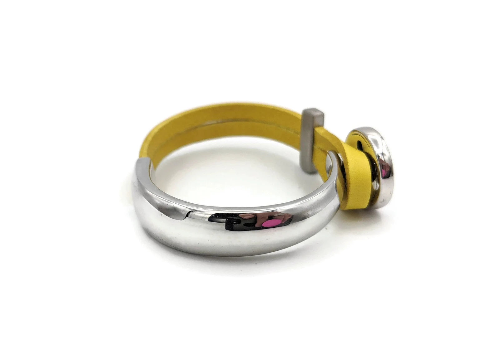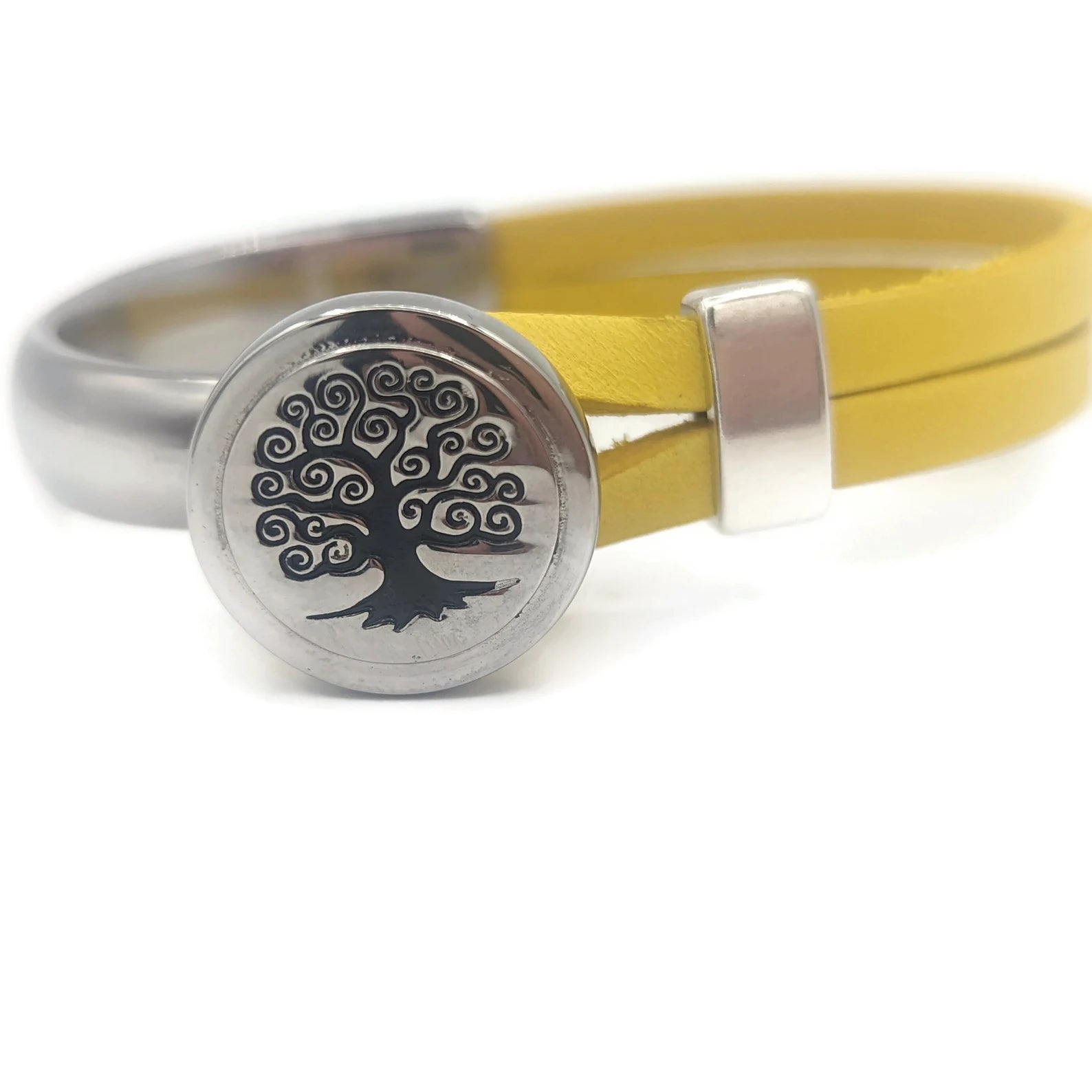 This is a handmade sarcoma warrior bracelet. The yellow leather represents sarcoma, the loop in the leather that you see around the Tree of Life is symbolic of a ribbon. The bracelet is accented with a sterling silver Warrior slider.